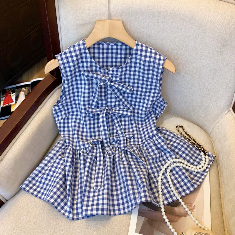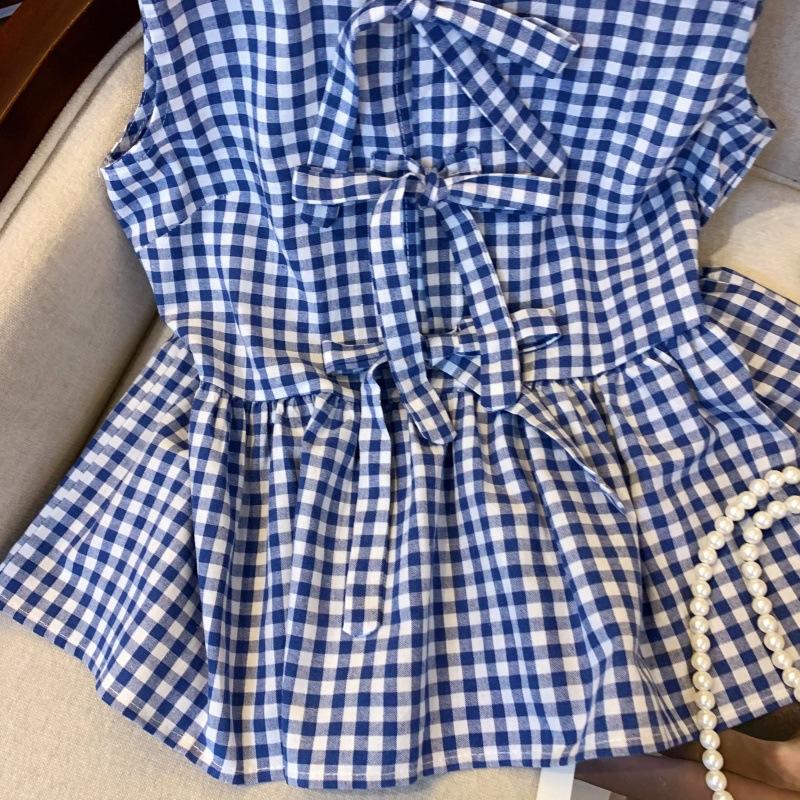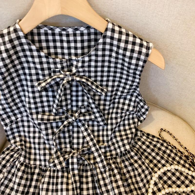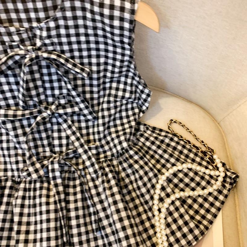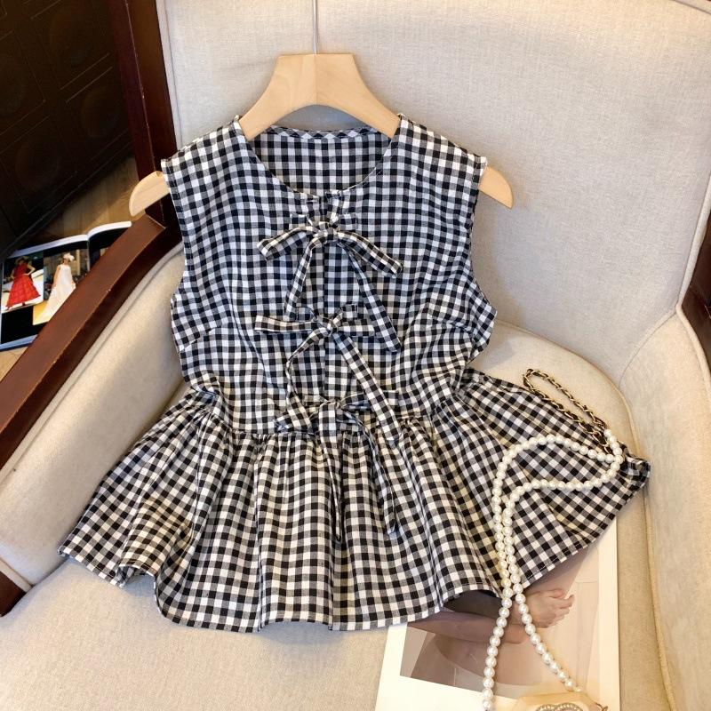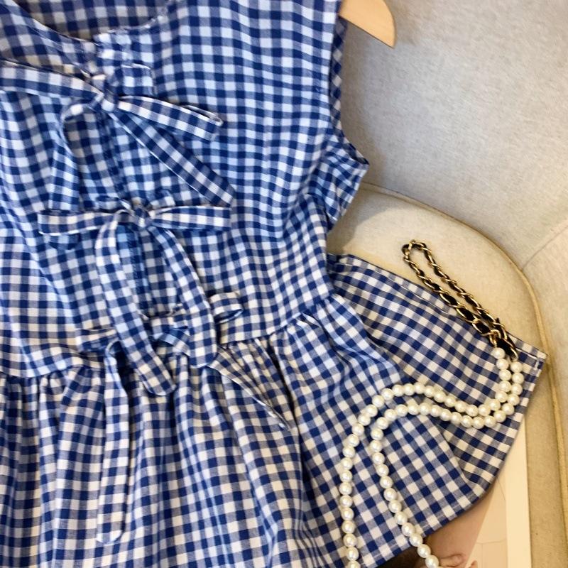 Foto real Camisa sin mangas a cuadros con lazo francés para mujer para salir, de alta gama, única, bonita, exquisita, top, blusa