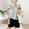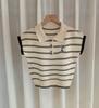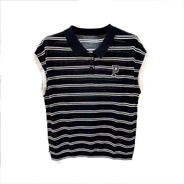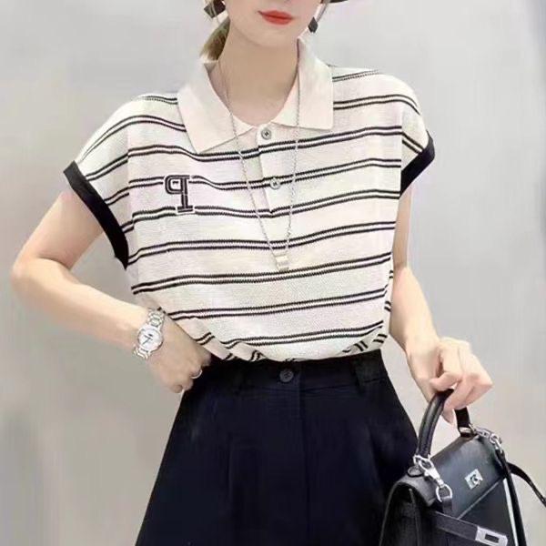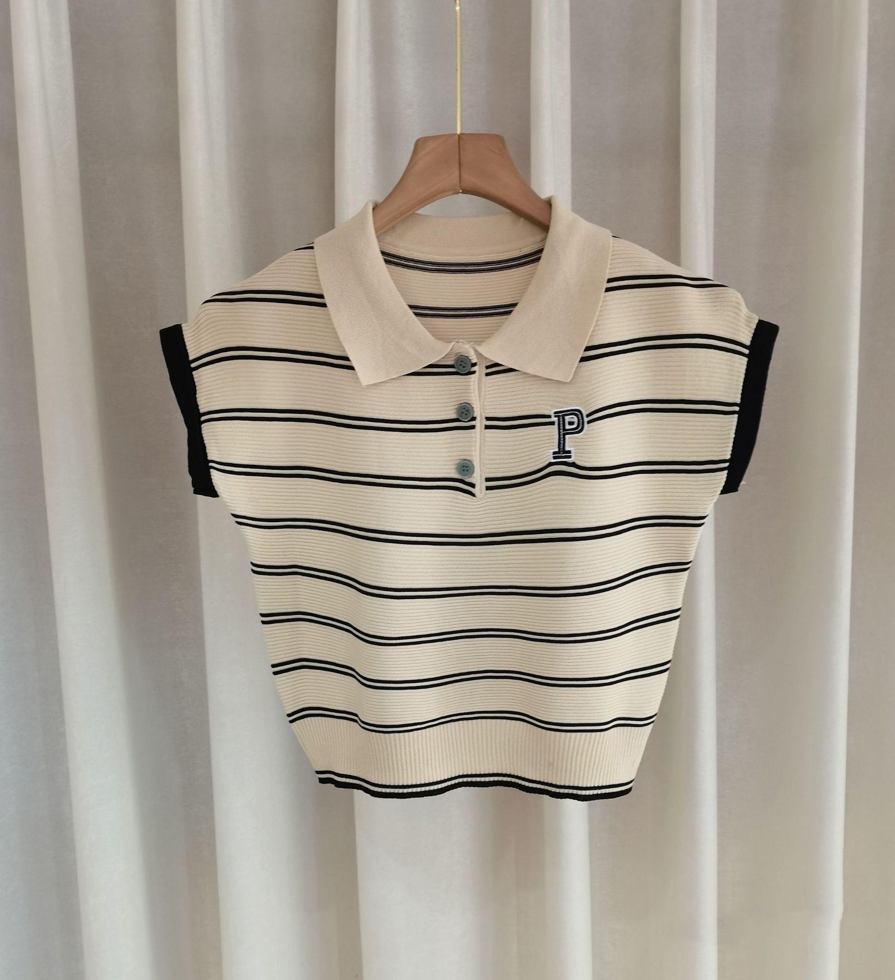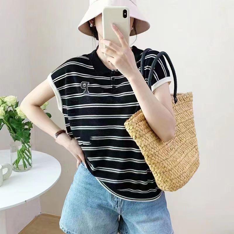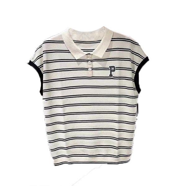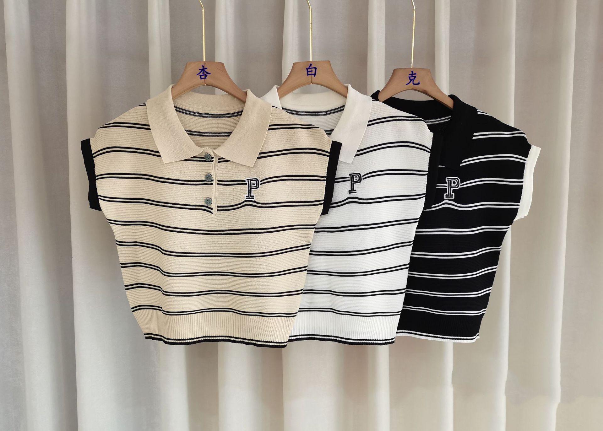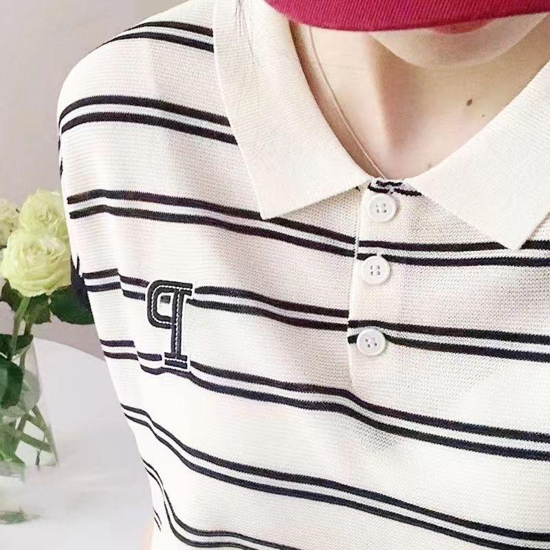 Camiseta de Punto con Cuello Polo y Letra Bordada para Mujer Verano 2025 Nueva Delgada Ajustada Suelta Rayada Top Corto