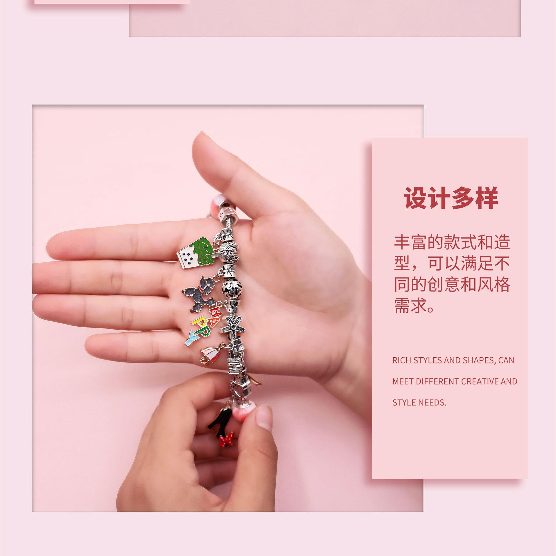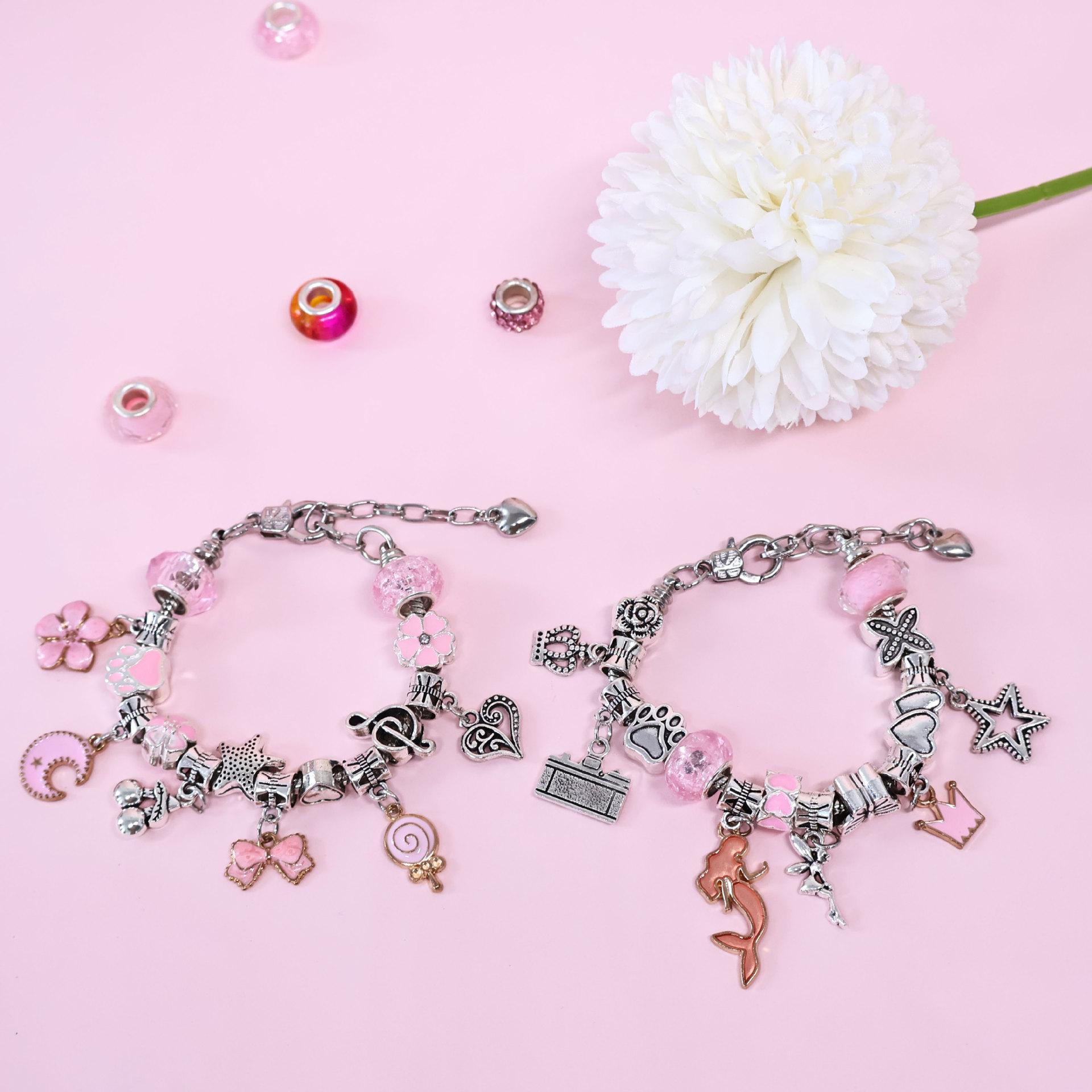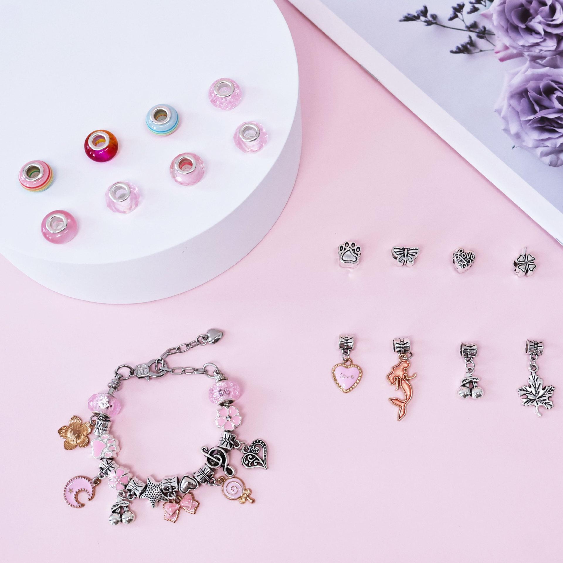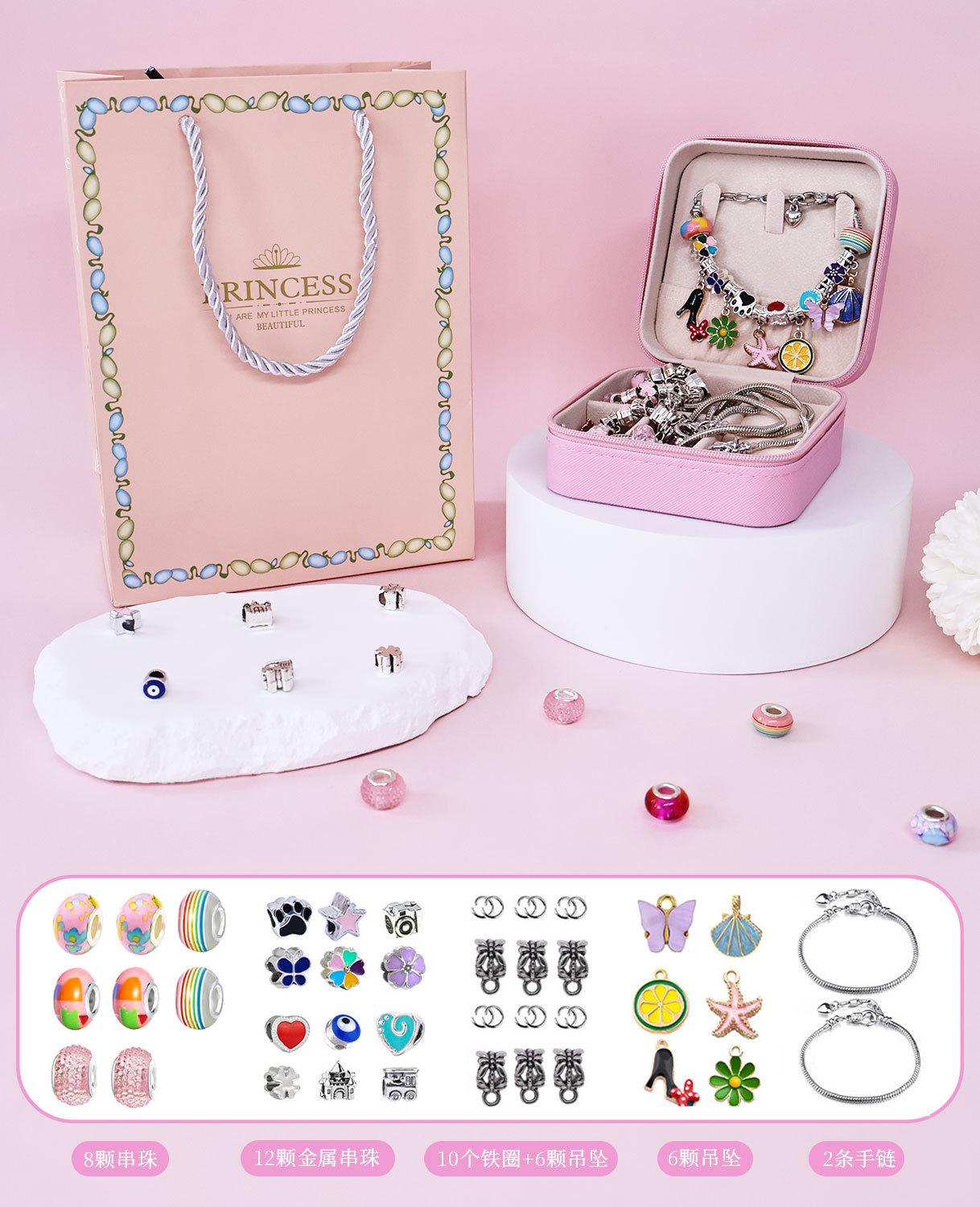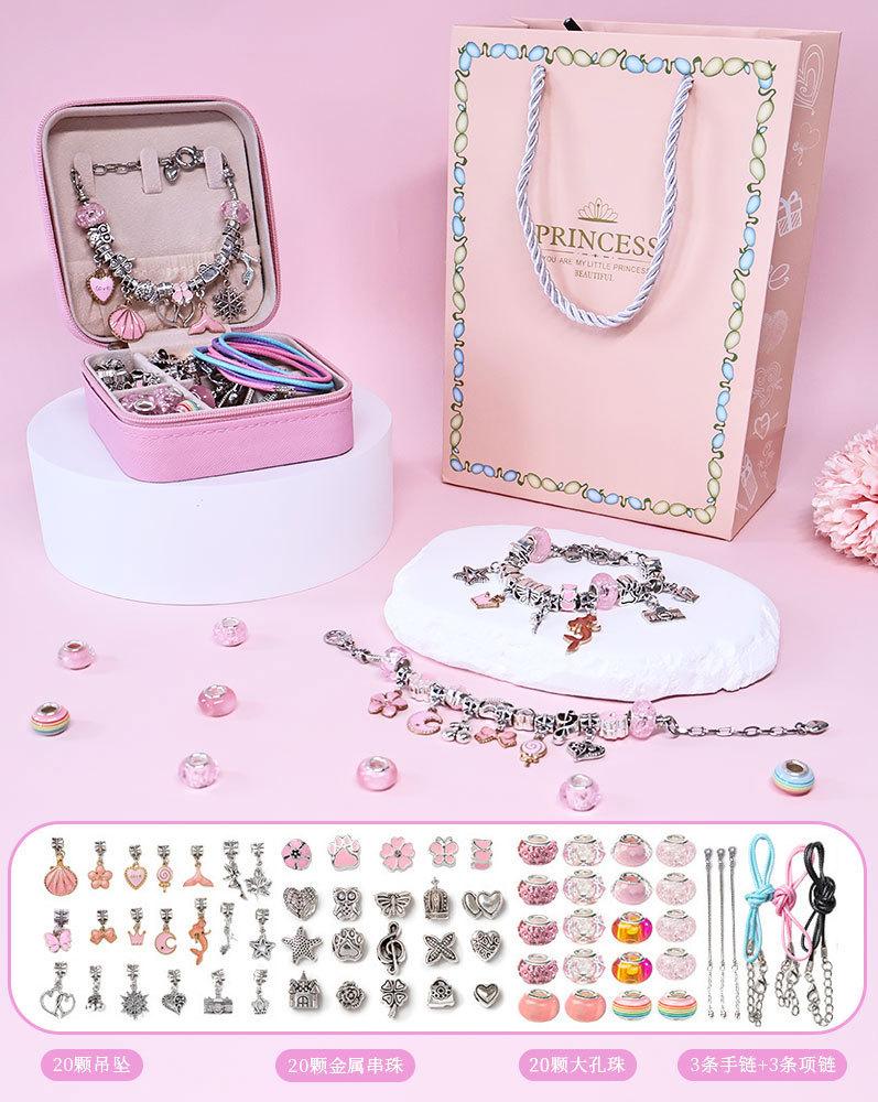 8 pink beads + 12 metal beads + 6 hole beads + 10 closed rings + 6 pendants + 2 bracelets + (gift box + gift bag)