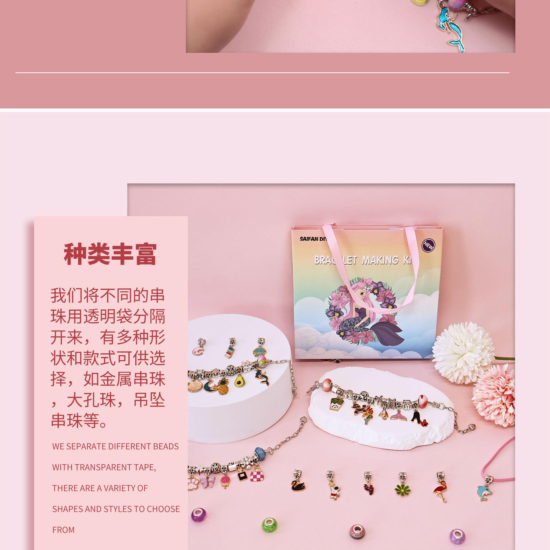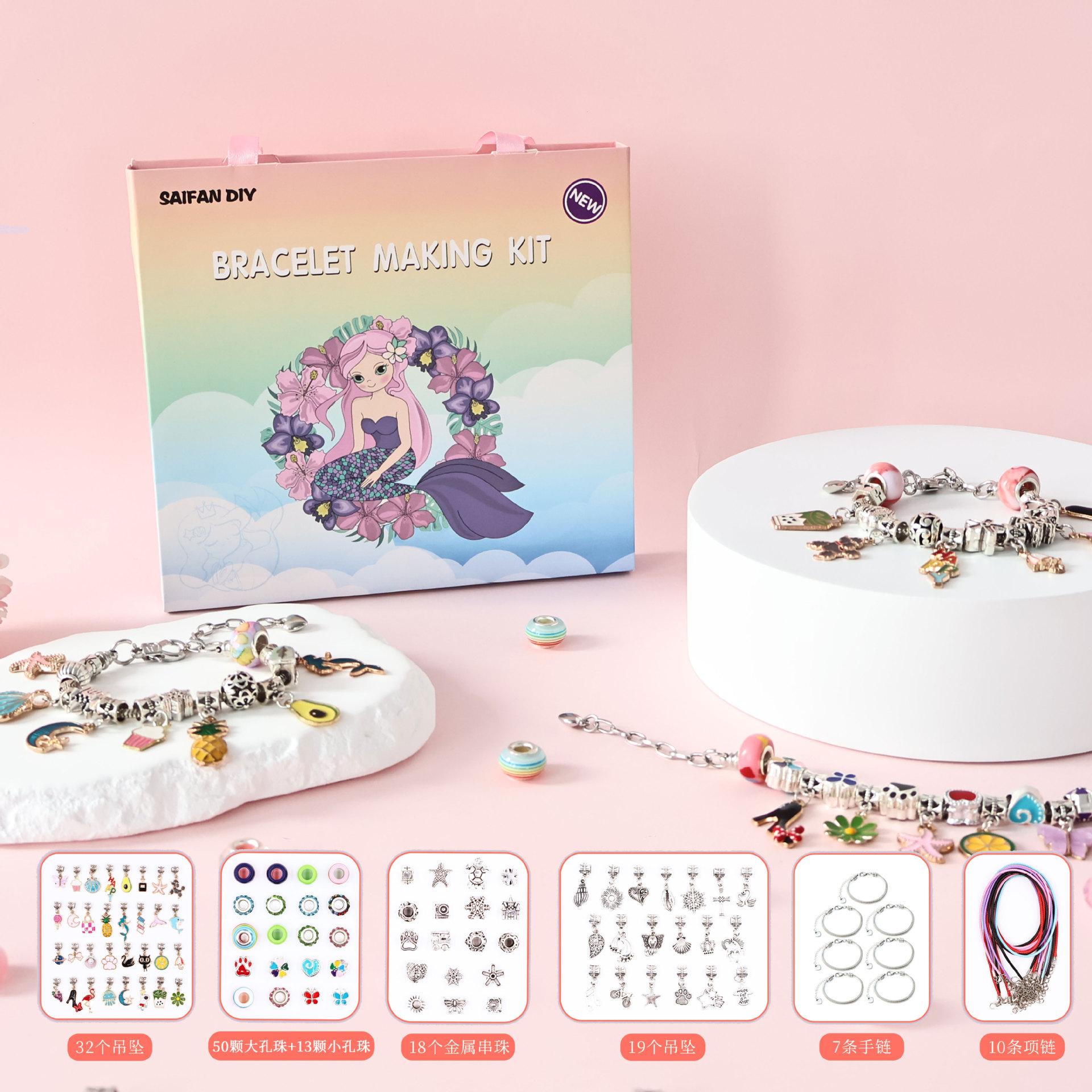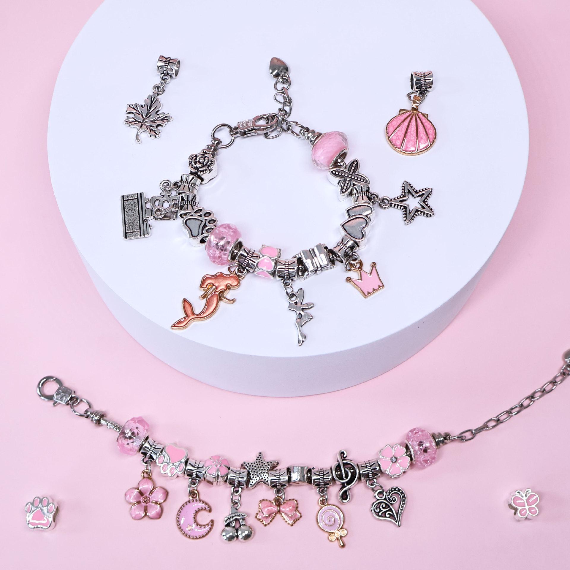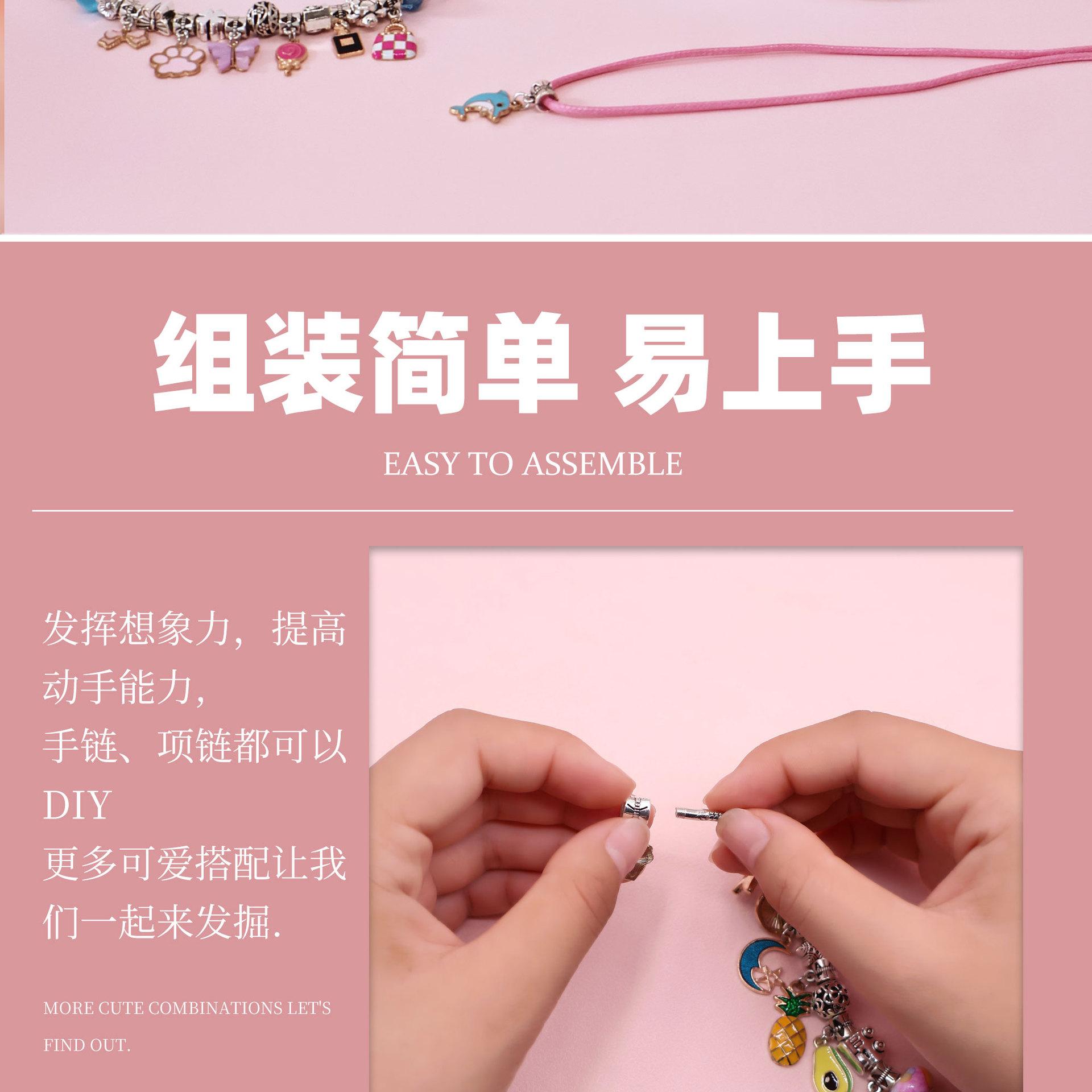 8 pink beads + 12 metal beads + 6 hole beads + 10 closed rings + 6 pendants + 2 bracelets + (gift box + gift bag)