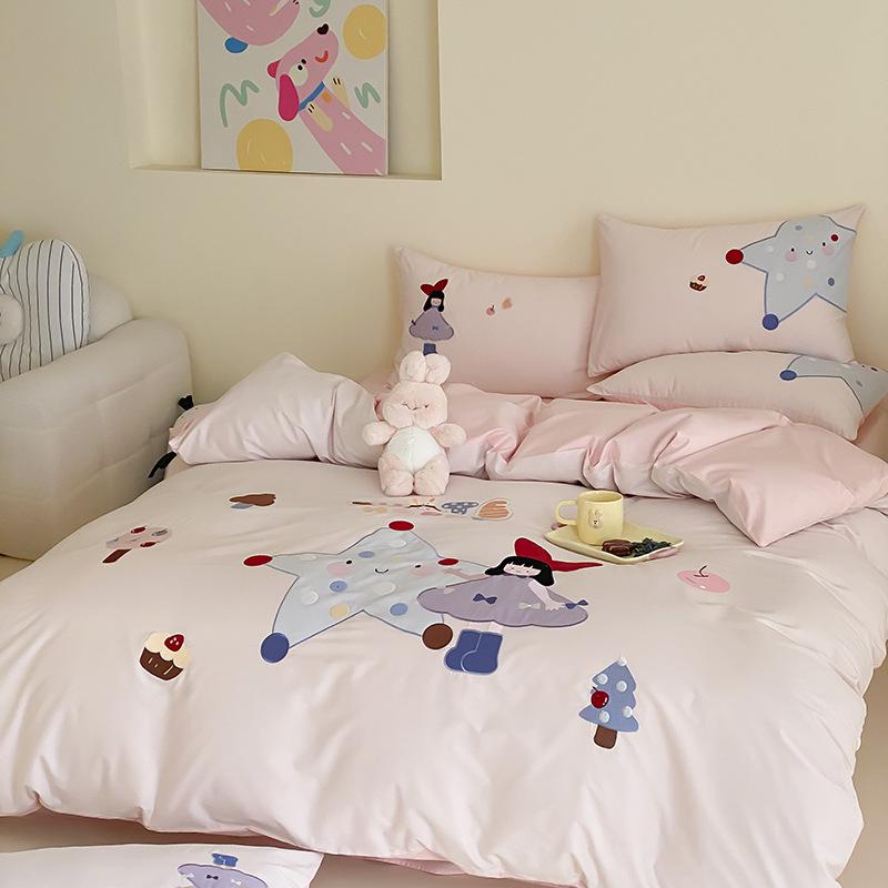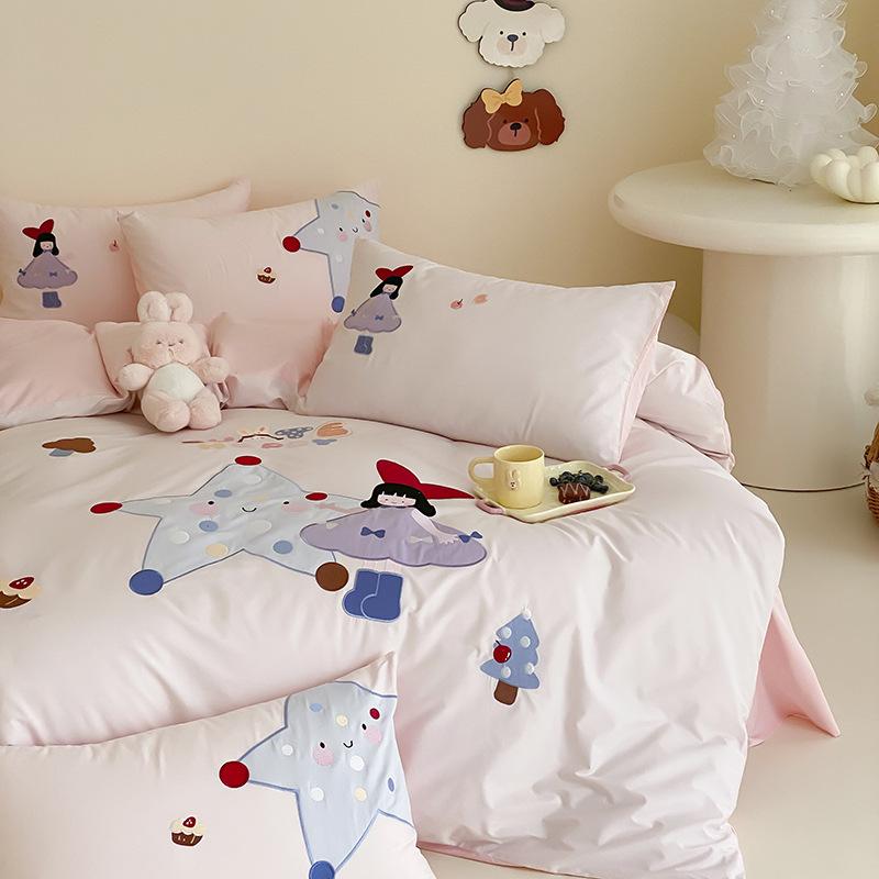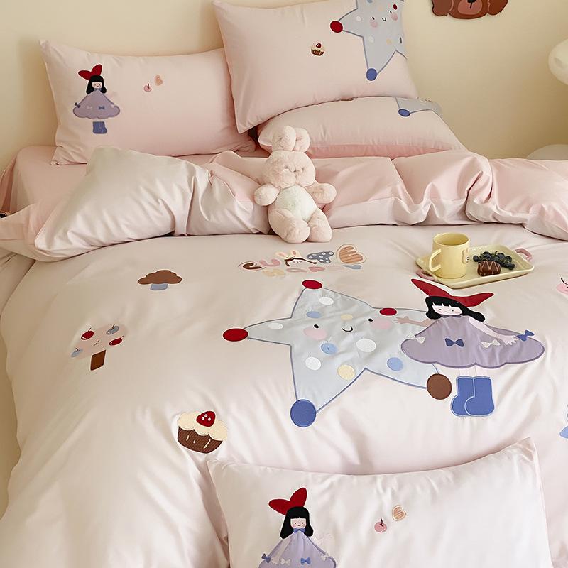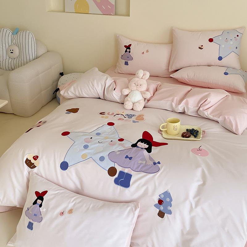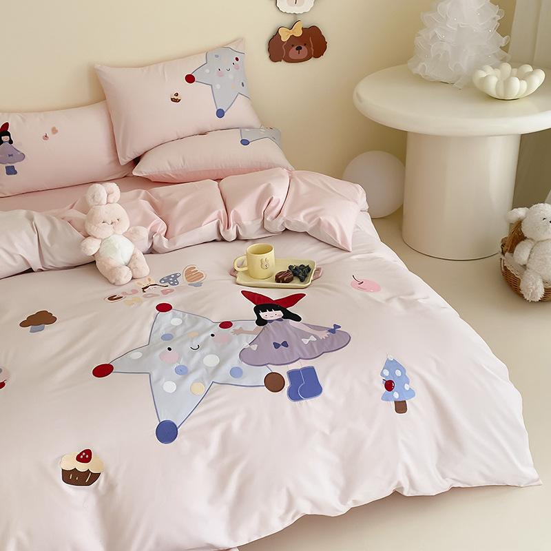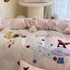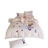 Juego de cuatro piezas de algodón lavado estilo princesa para niñas, ropa de cama de algodón puro con dibujos animados, funda nórdica, dormitorio infantil, juego de cama de tres piezas, sábanas