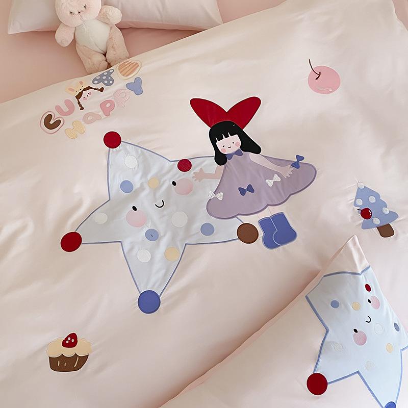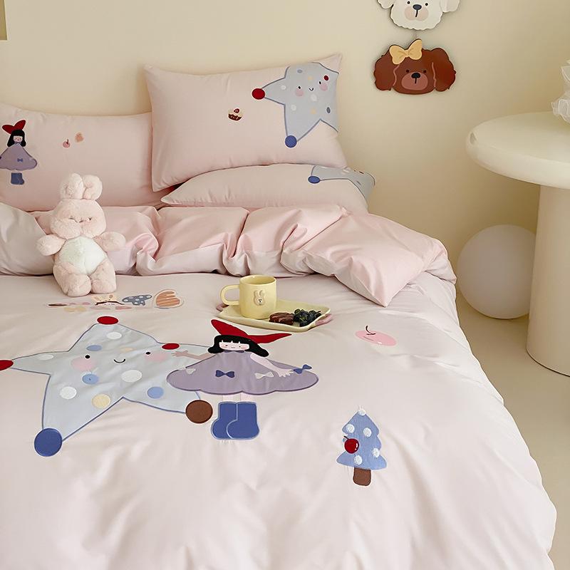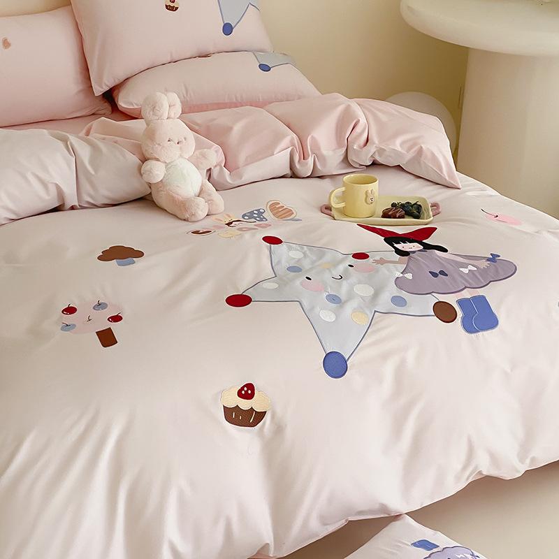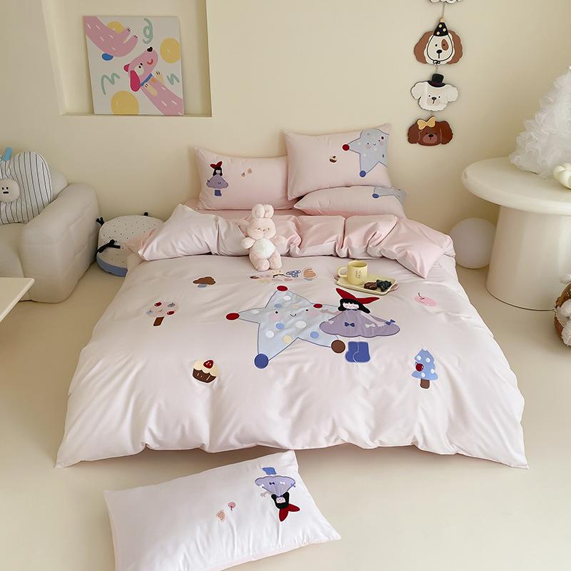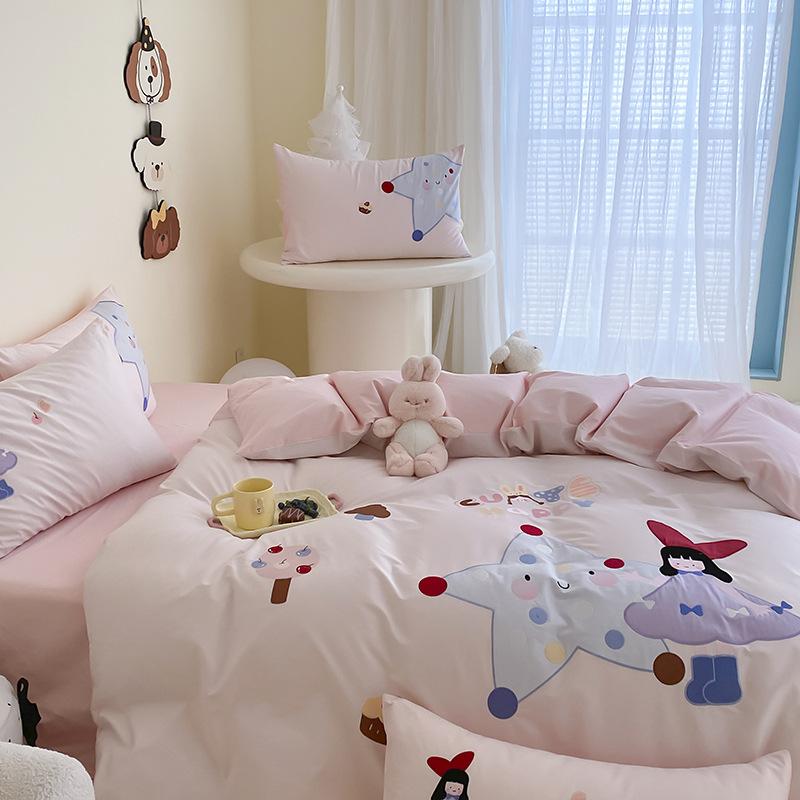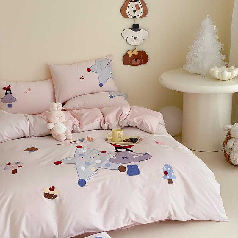 Juego de cuatro piezas de algodón lavado estilo princesa para niñas, ropa de cama de algodón puro con dibujos animados, funda nórdica, dormitorio infantil, juego de cama de tres piezas, sábanas