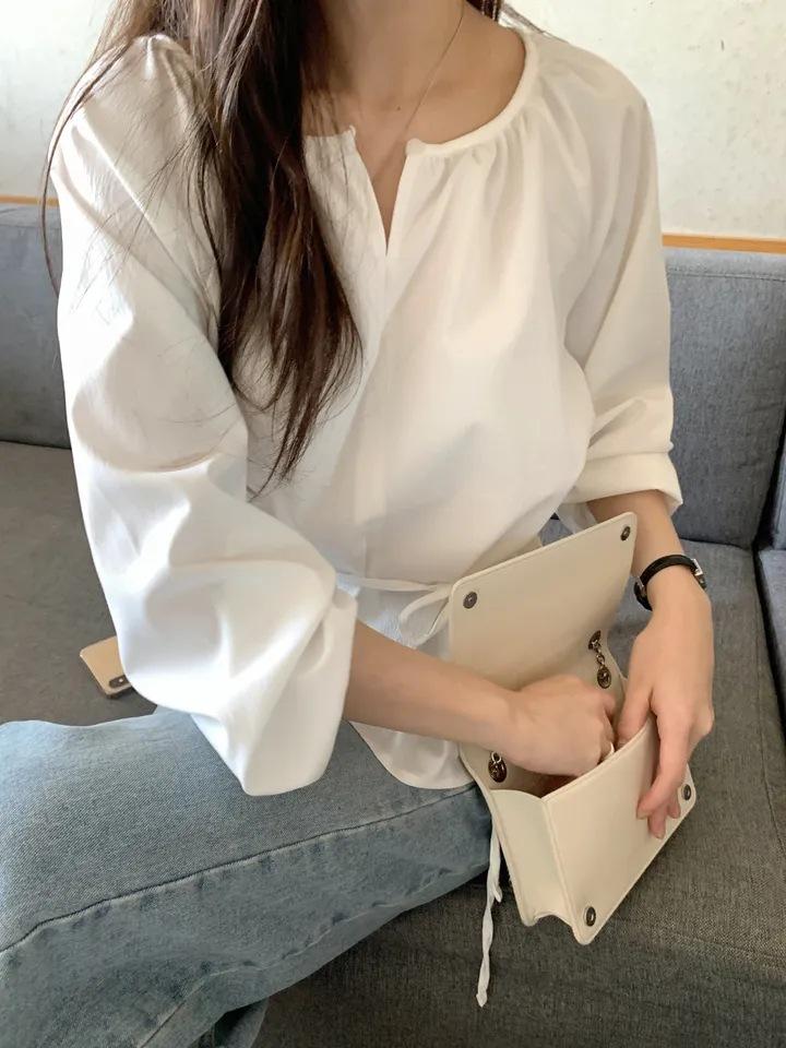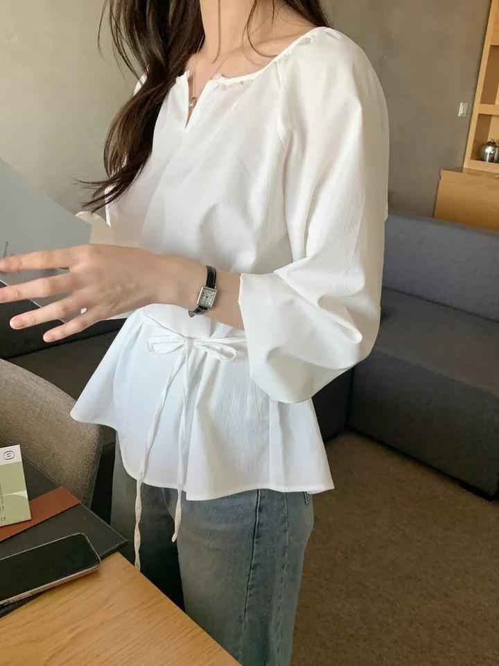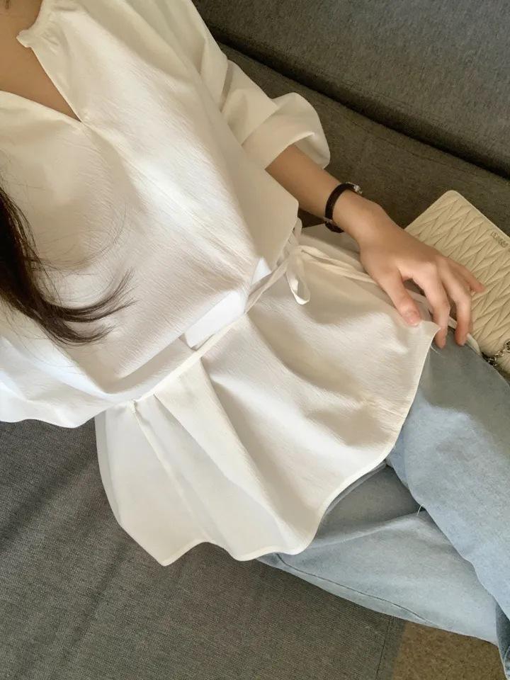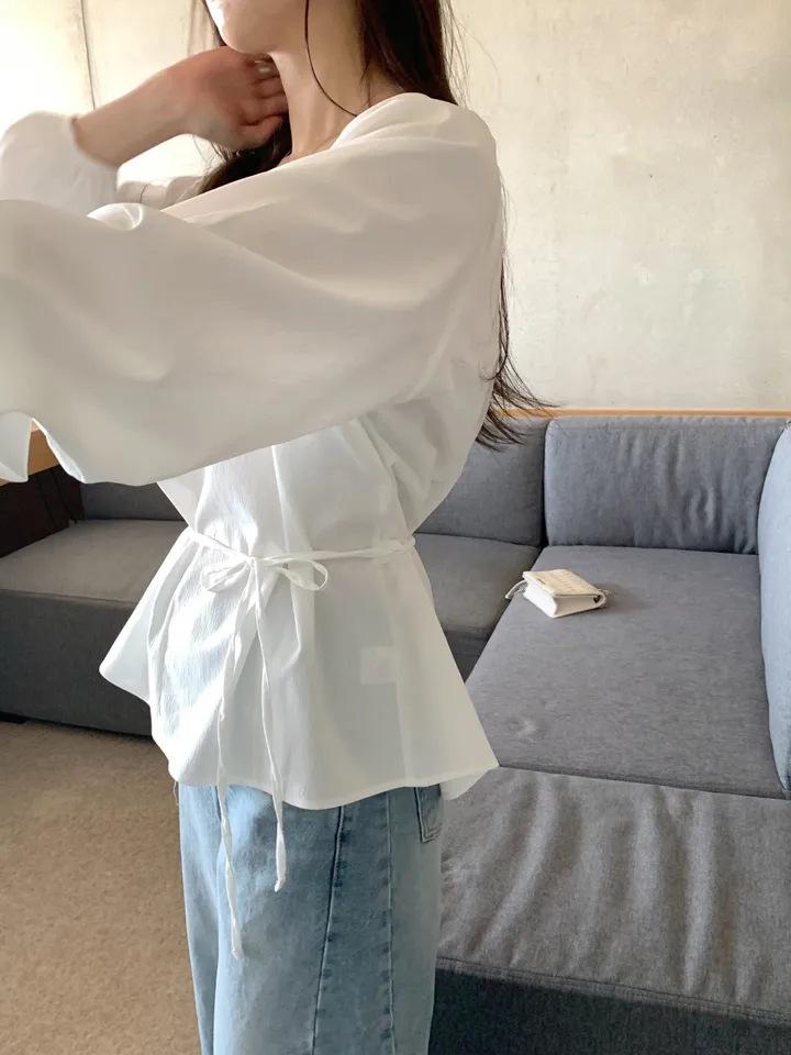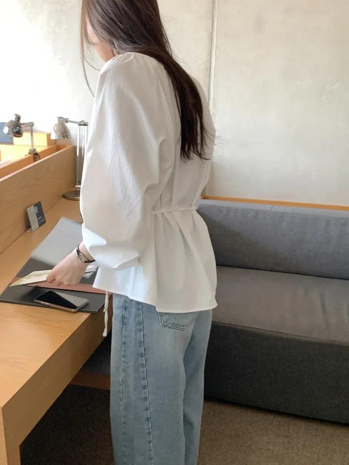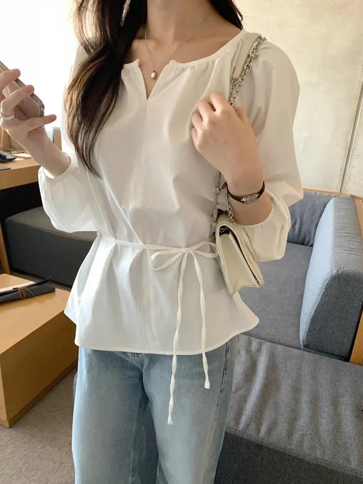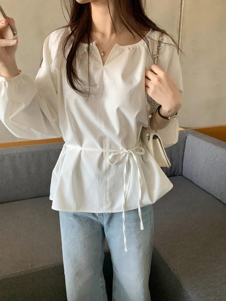 Chic Coreano Nicho Retro Cuello en V Cordón Cintura Holgado Look Adelgazante Casual Versátil Camisa Top
