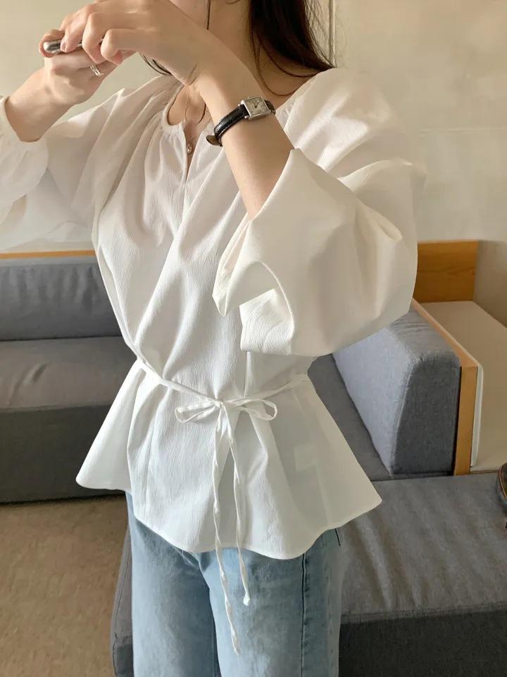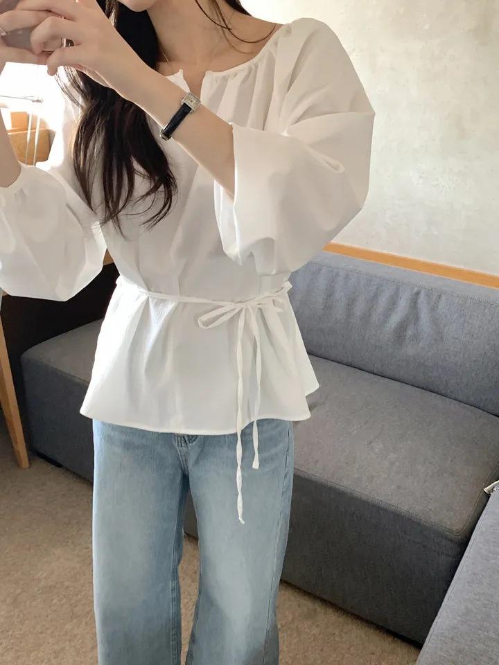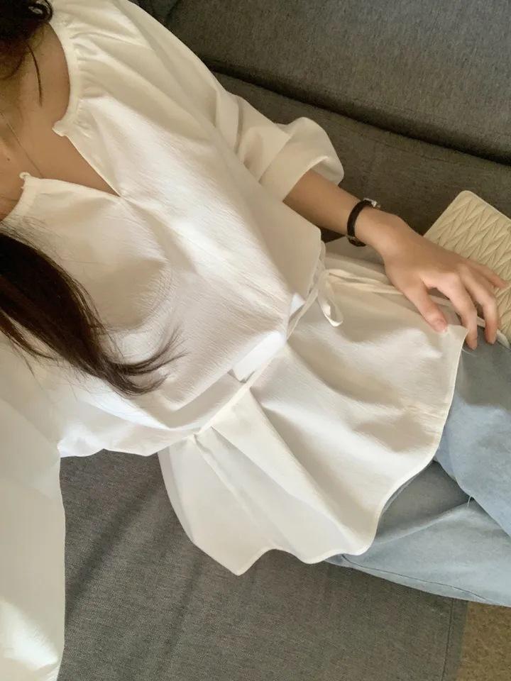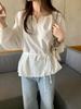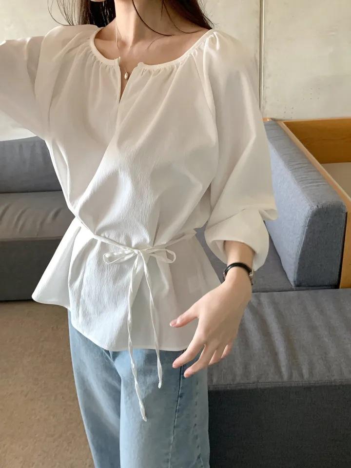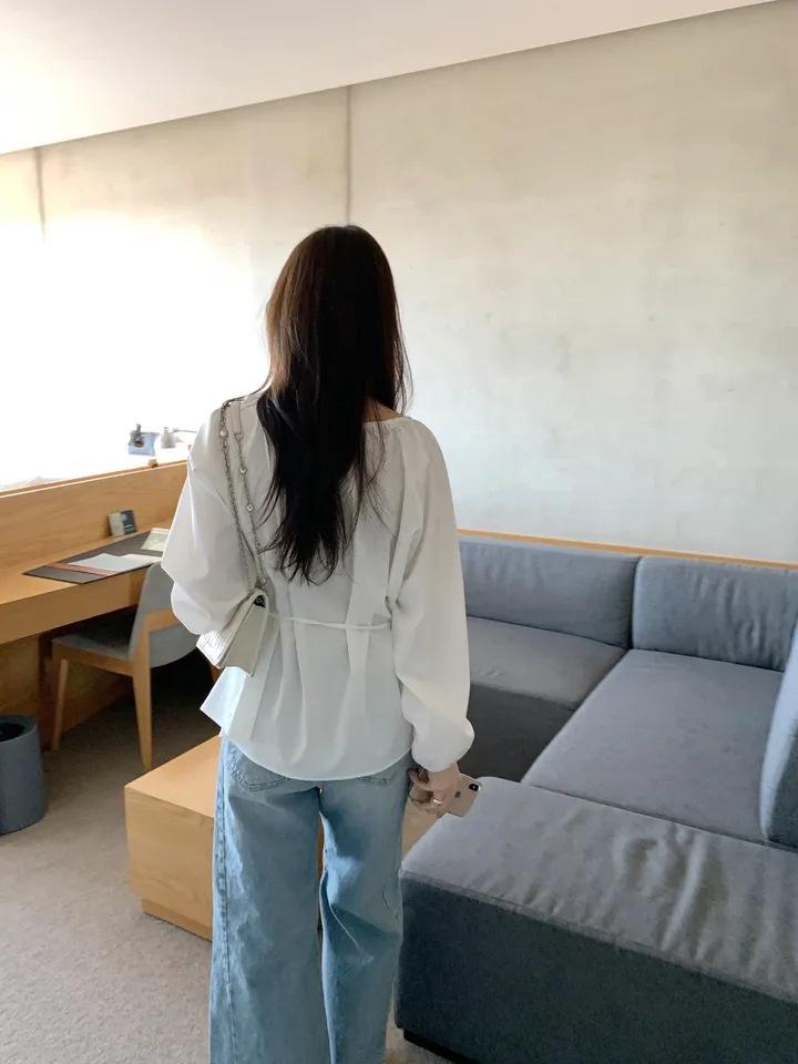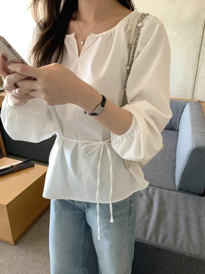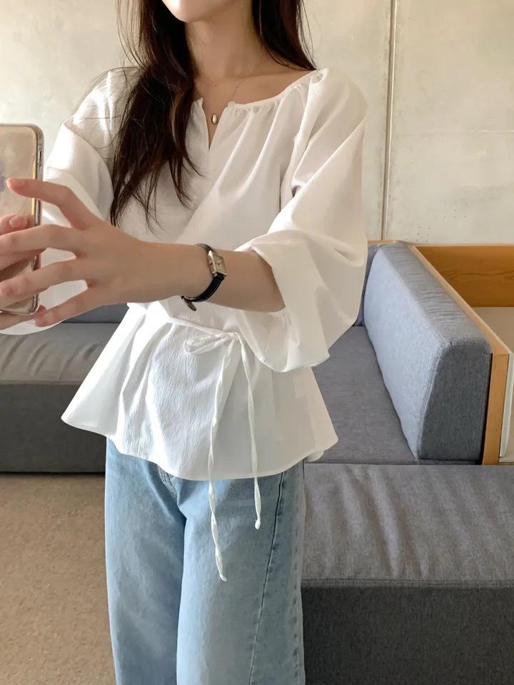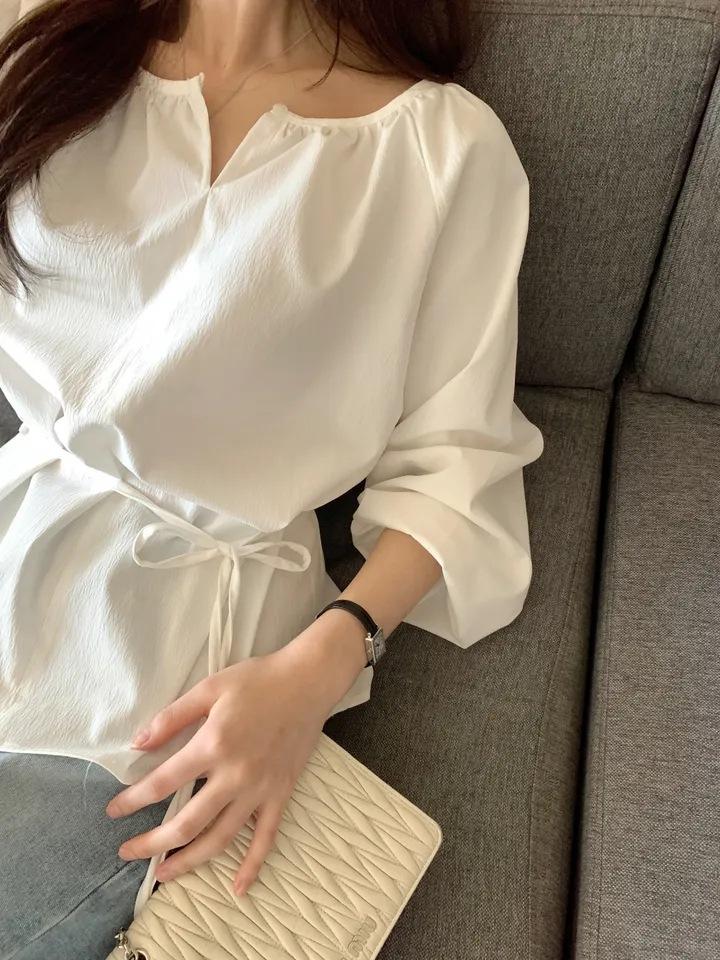 Chic Coreano Nicho Retro Cuello en V Cordón Cintura Holgado Look Adelgazante Casual Versátil Camisa Top