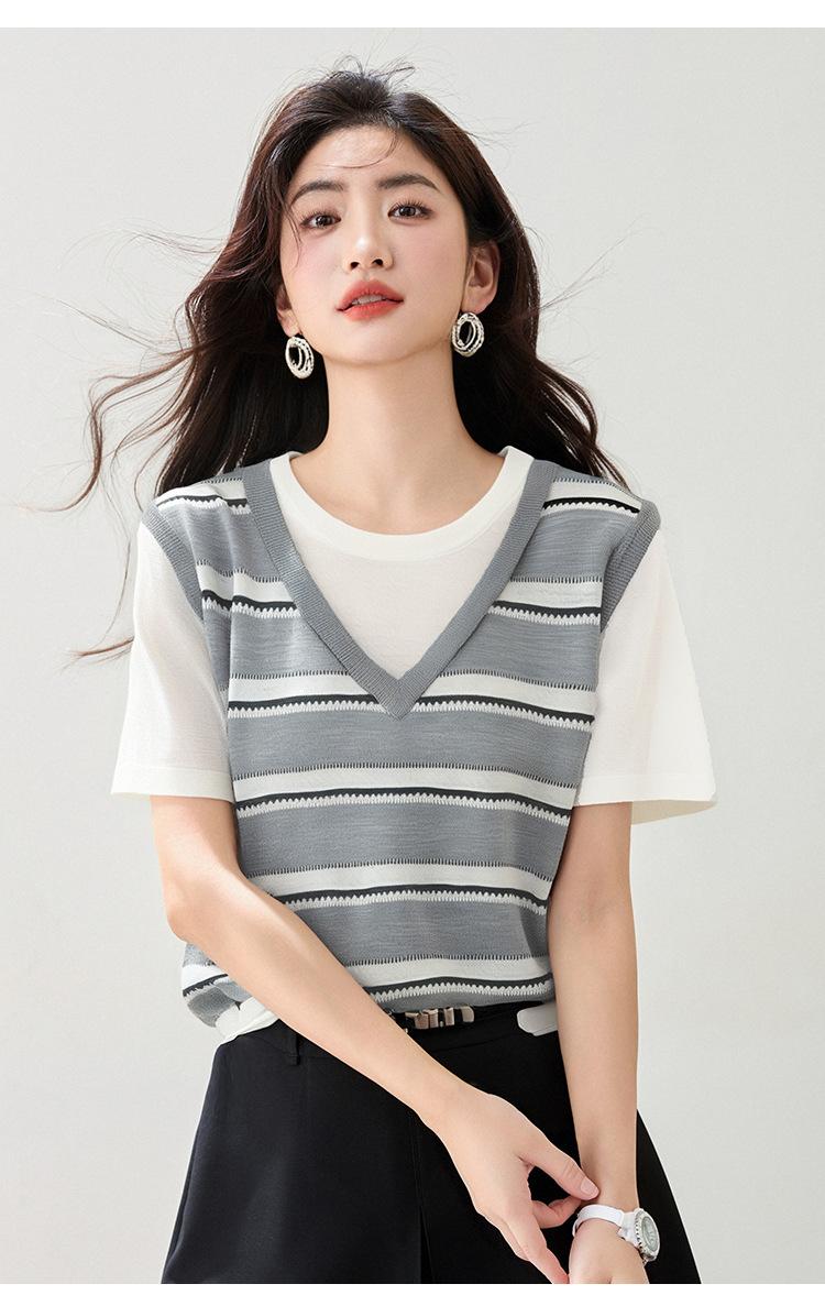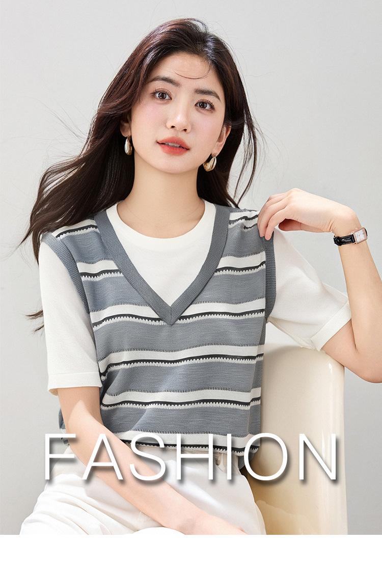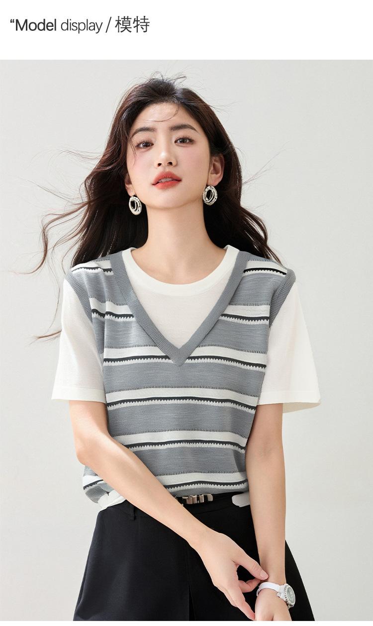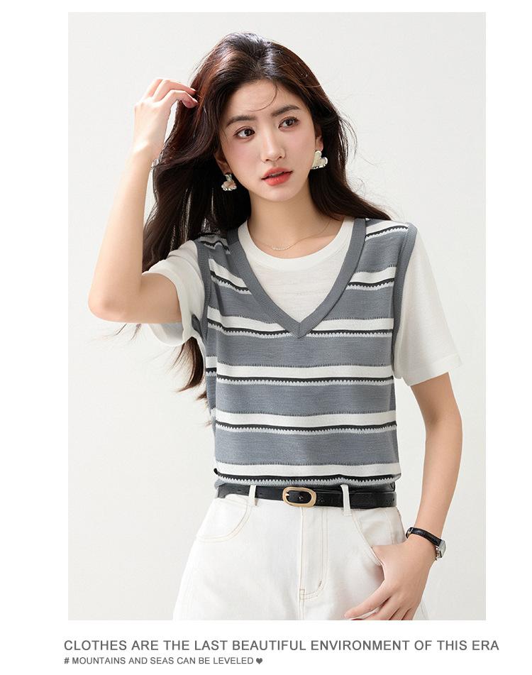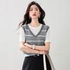 2025 Nuevo Verano Estilo Coreano Estilo Preppy Falso Dos Piezas Costuras de Color en Contraste Rayas Tejido de Punto Camisetas de Manga Corta Tops para Mujer