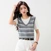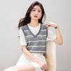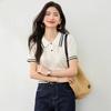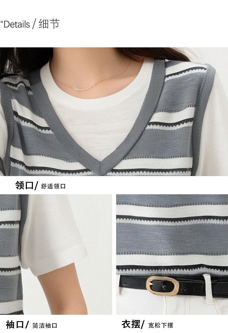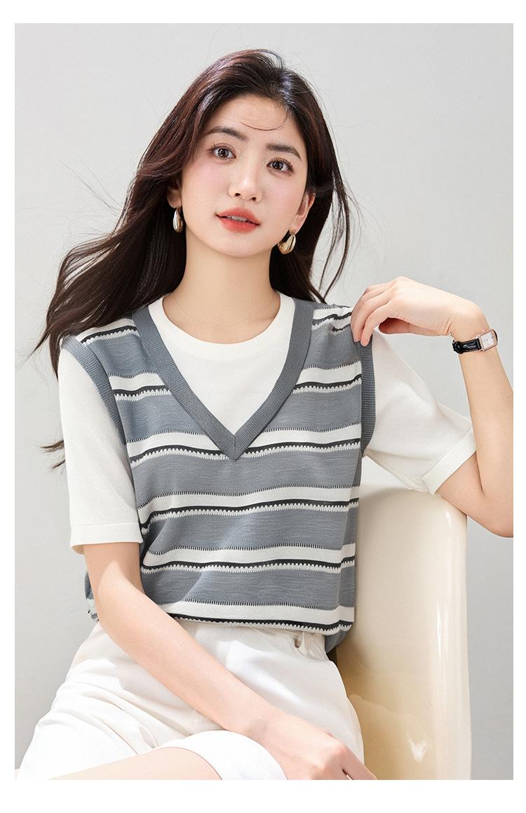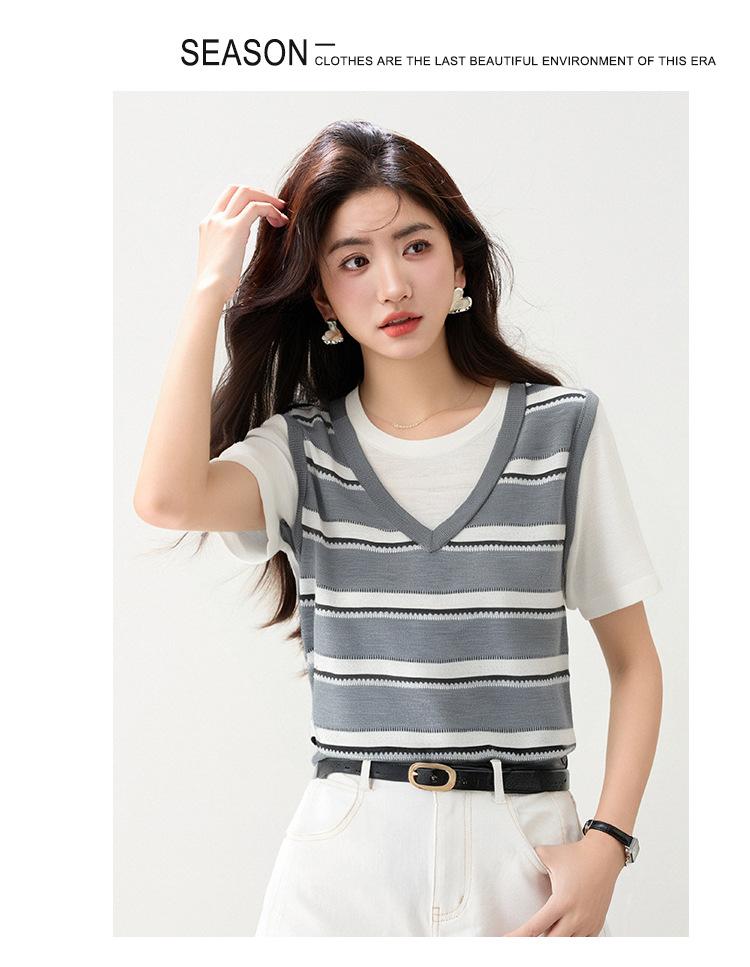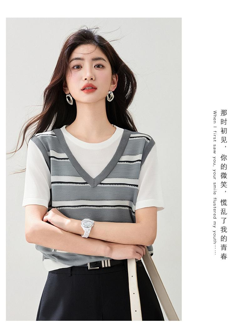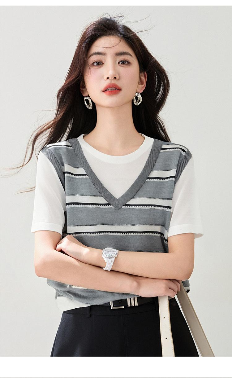 2025 Nuevo Verano Estilo Coreano Estilo Preppy Falso Dos Piezas Costuras de Color en Contraste Rayas Tejido de Punto Camisetas de Manga Corta Tops para Mujer