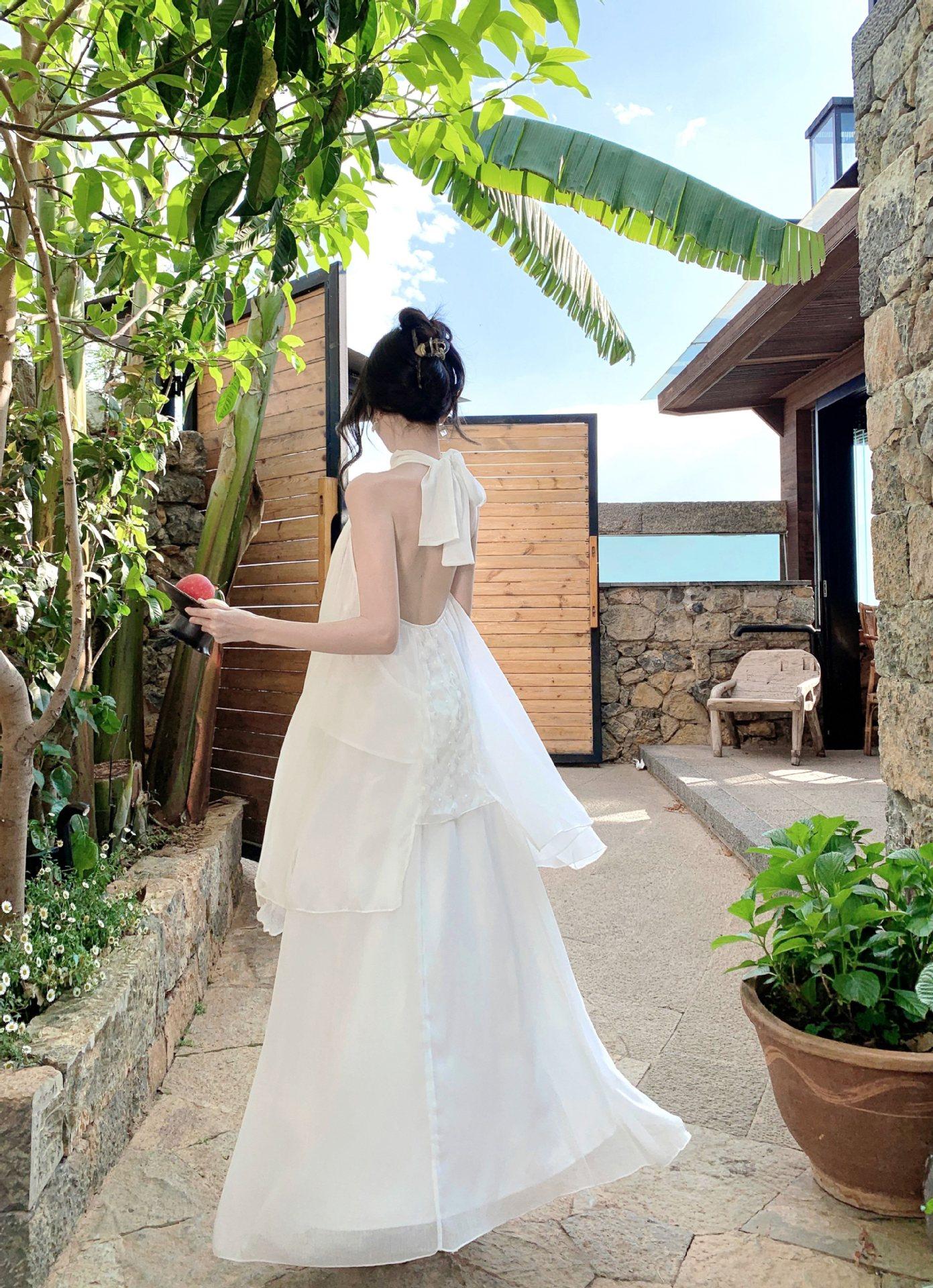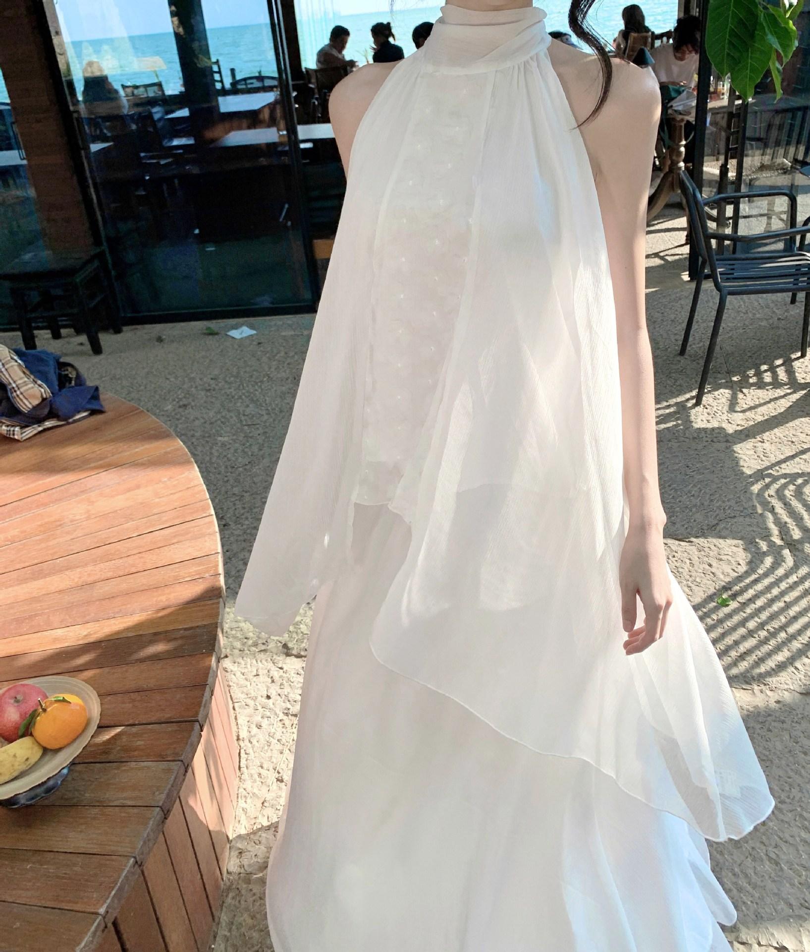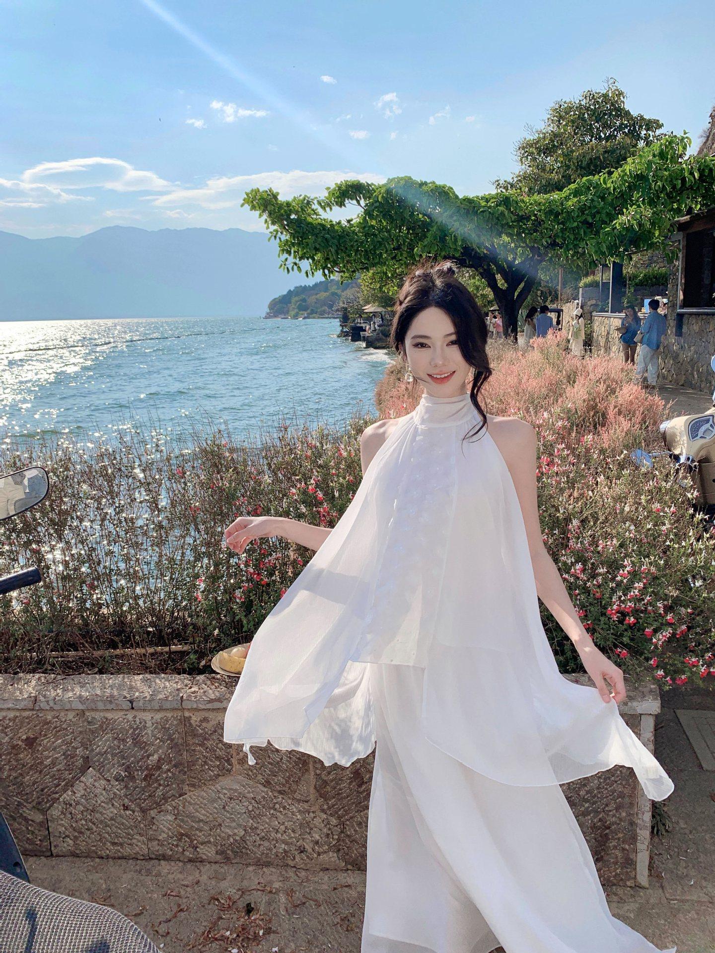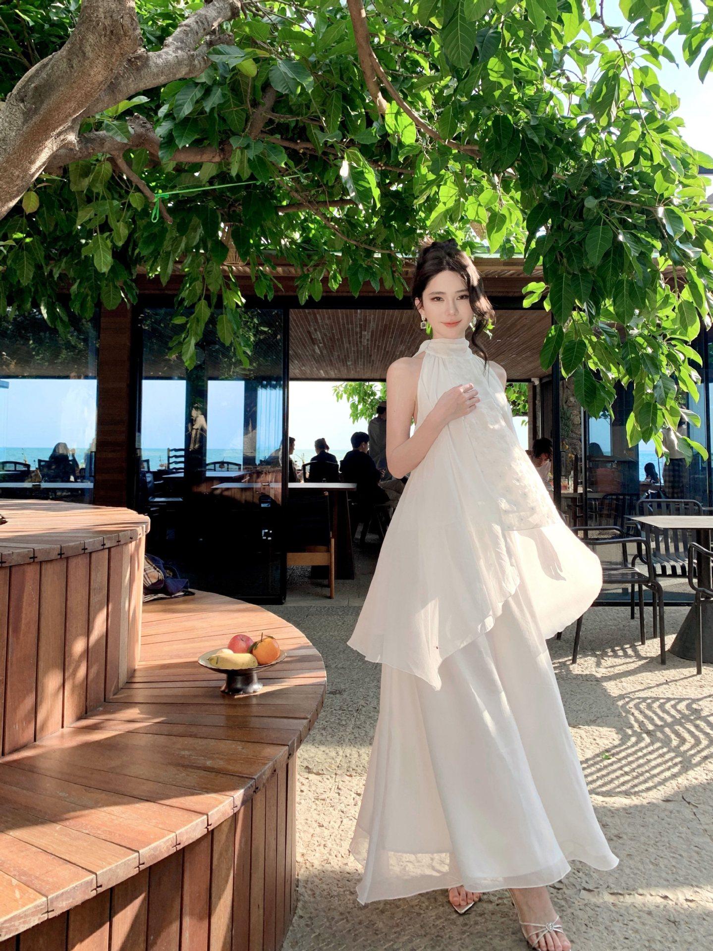 Conjunto de Verano Estilo Resort Costero, Top Halter Blanco Único y Hermoso, Falda Línea A, Conjunto de Dos Piezas para Mujer
