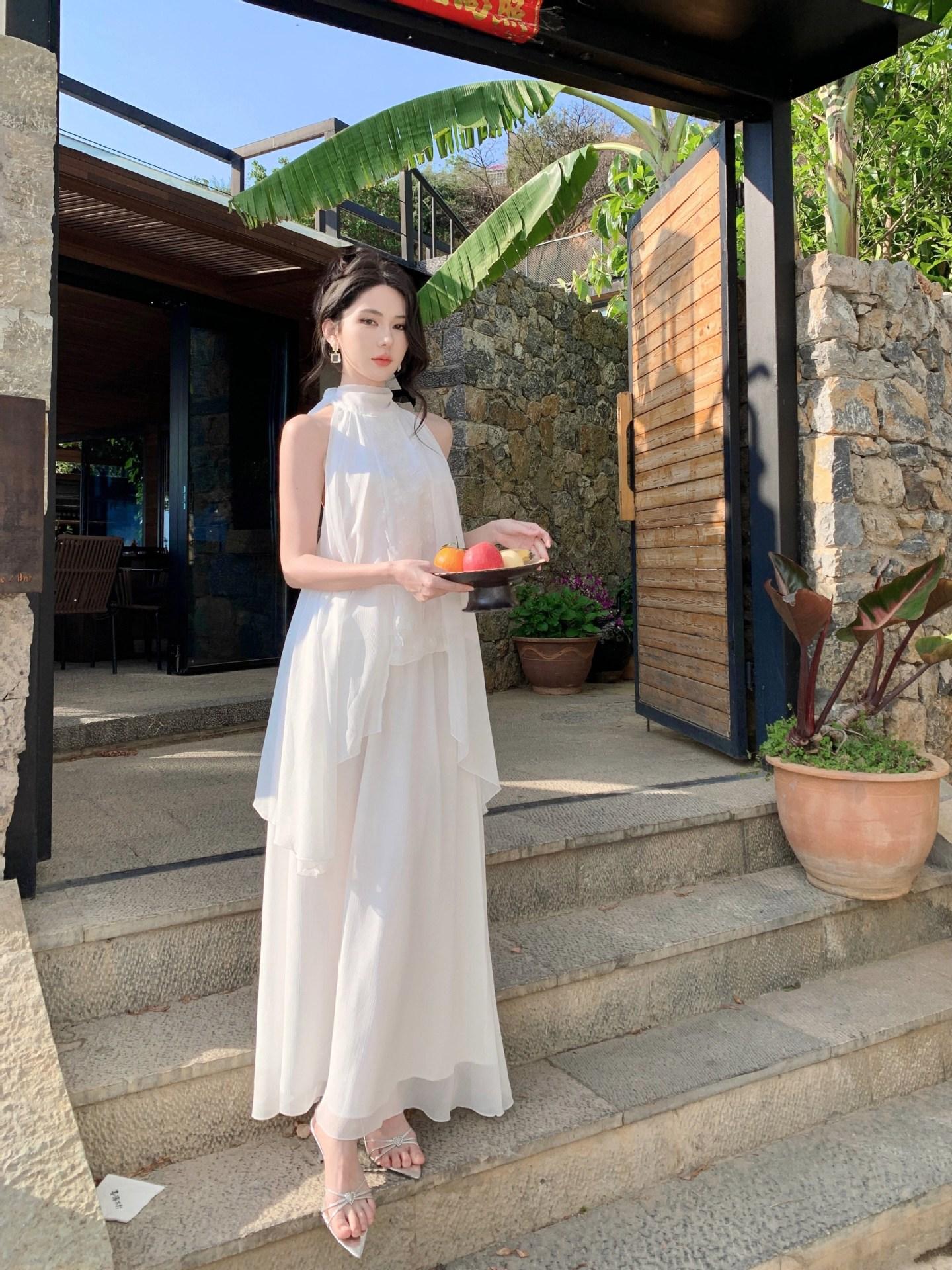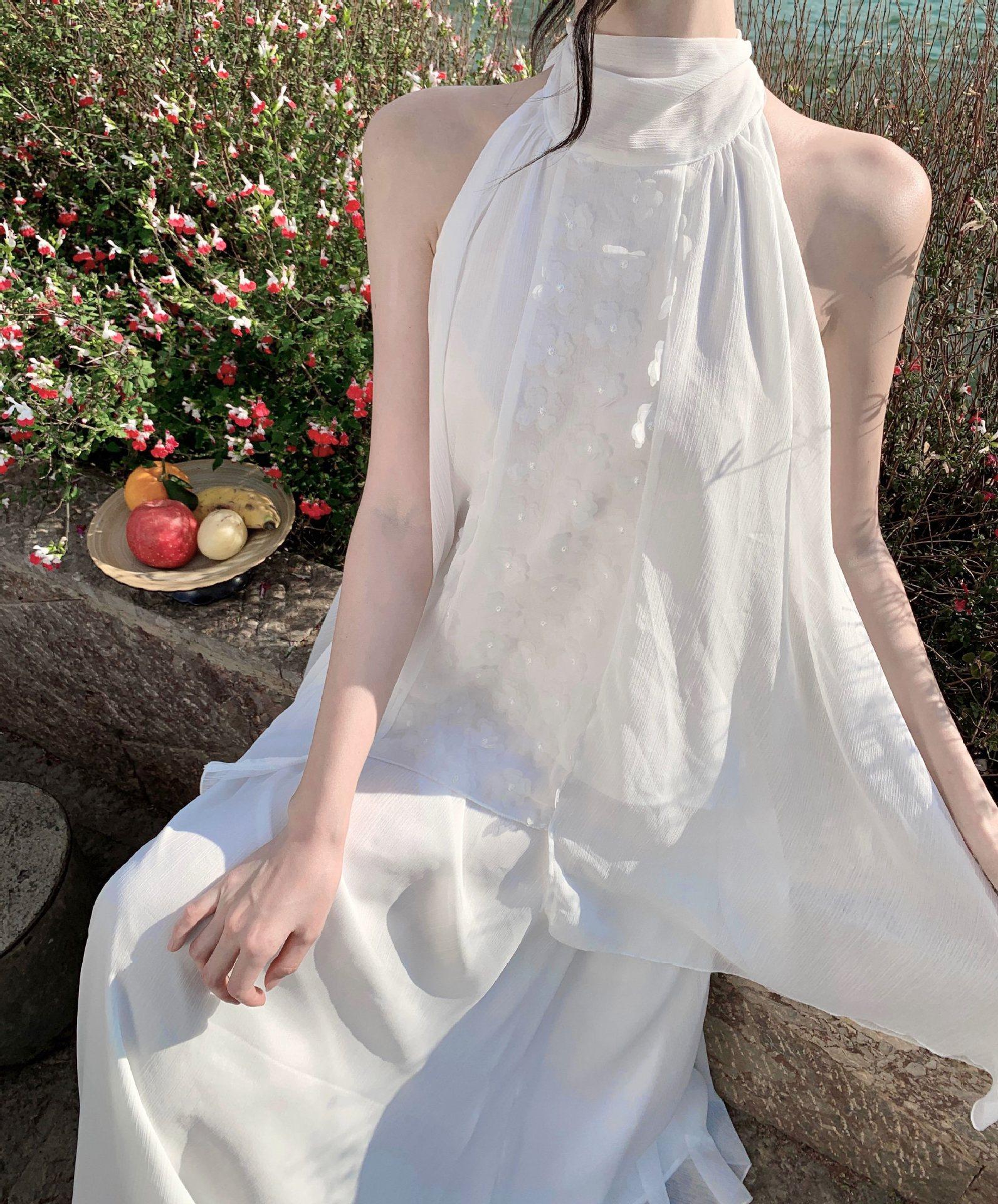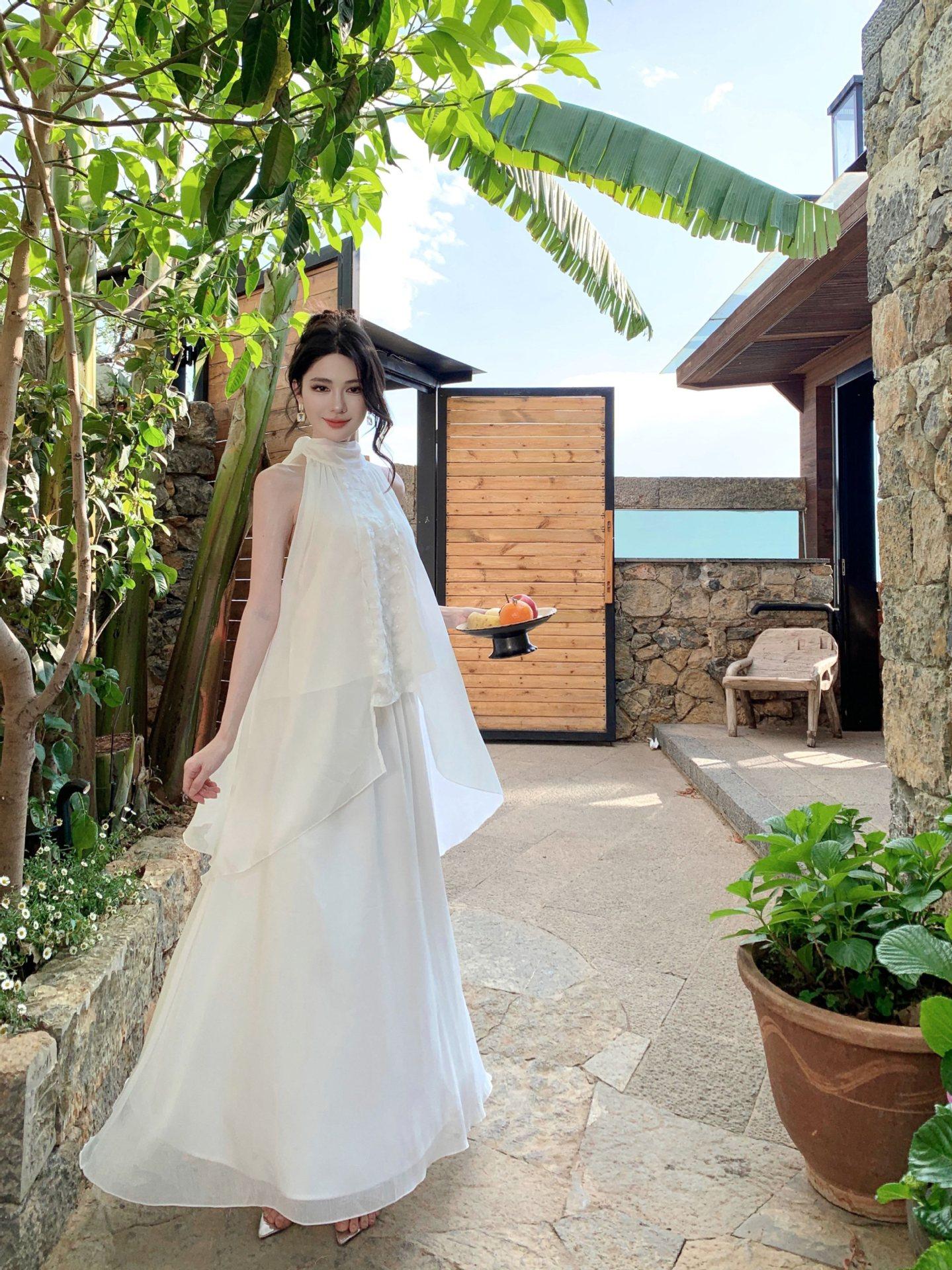 Conjunto de Verano Estilo Resort Costero, Top Halter Blanco Único y Hermoso, Falda Línea A, Conjunto de Dos Piezas para Mujer
