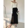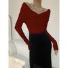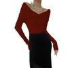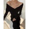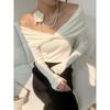 Suéter Otoño e Invierno Ajustado Hombro Descubierto Top Interior de Manga Larga Francés Kink Hombro Camisa Base Tejida para Mujer Primavera