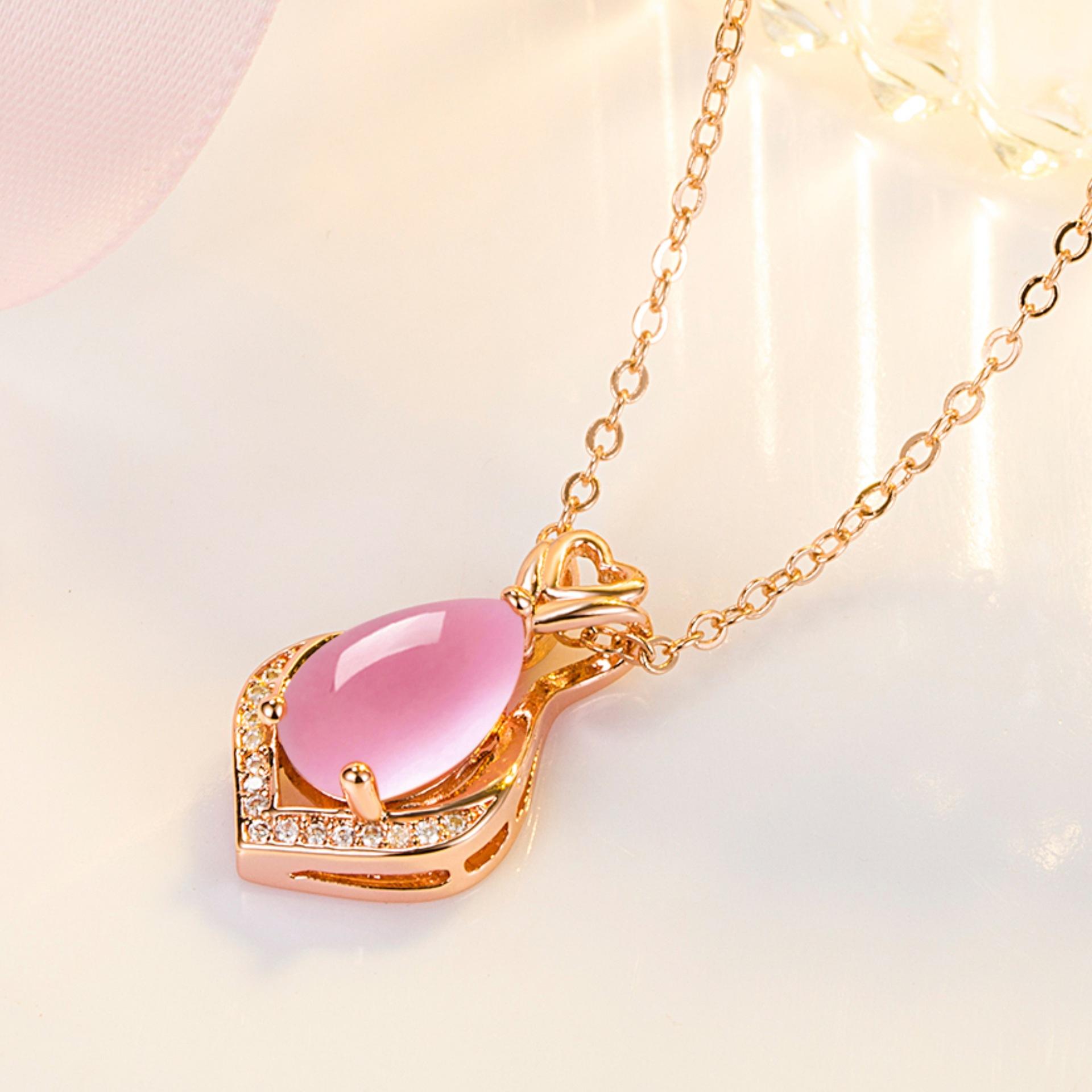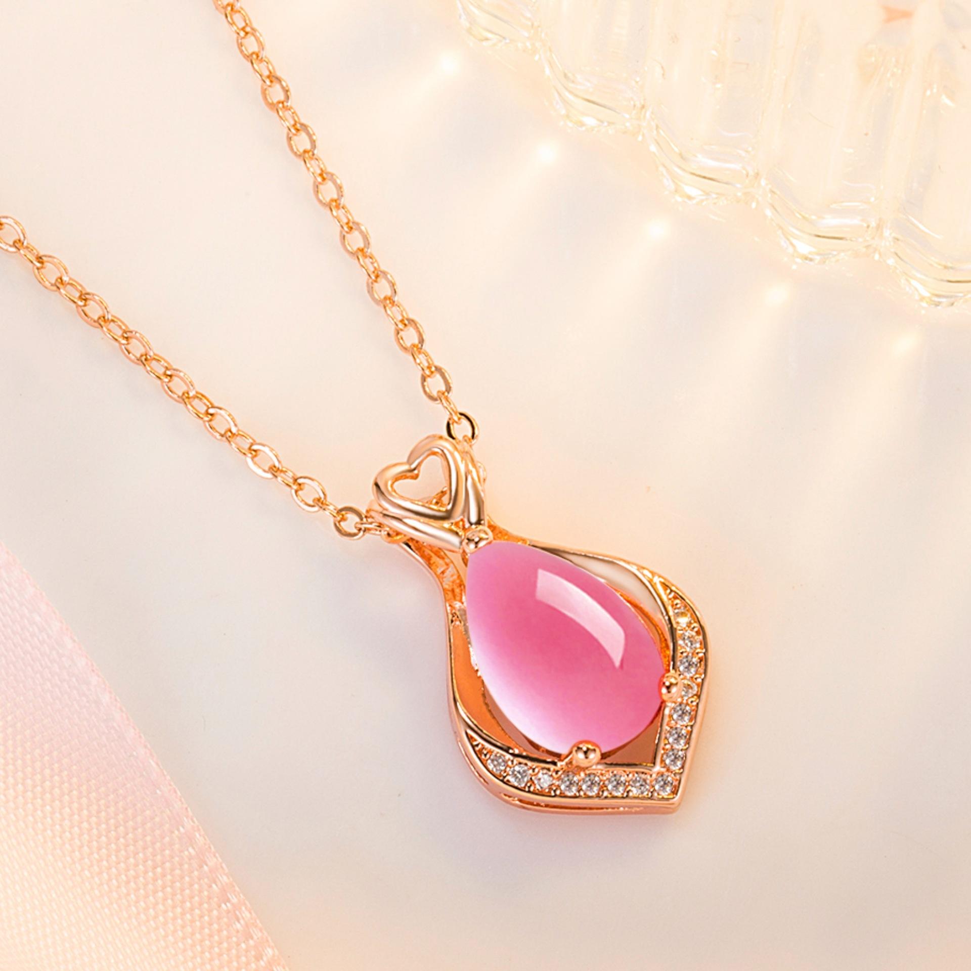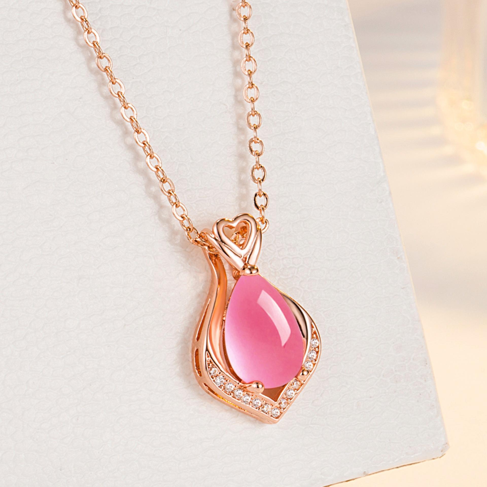 Colgante de cristal rosa con forma de corazón y gota de moda, cadena de clavícula, temperamento, diamante en forma de pera, hibisco, piedra, corazón hueco.