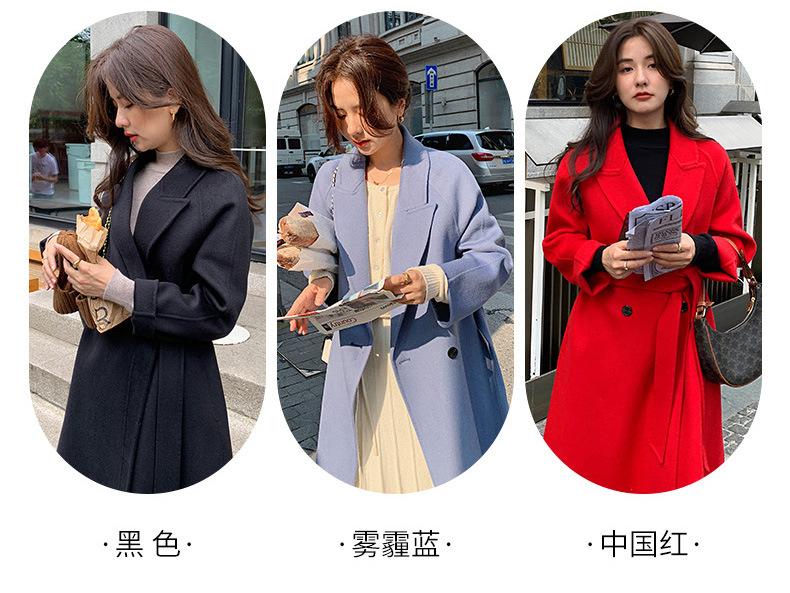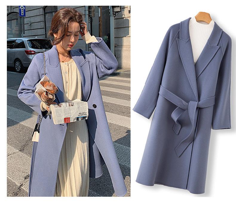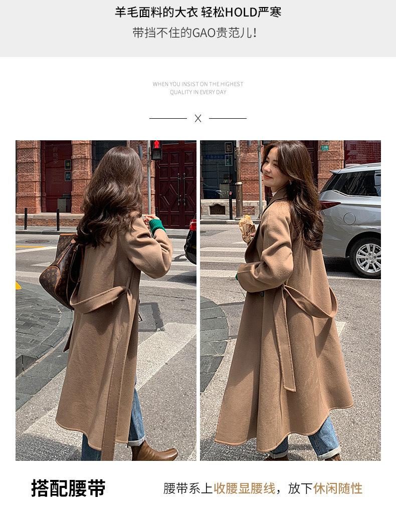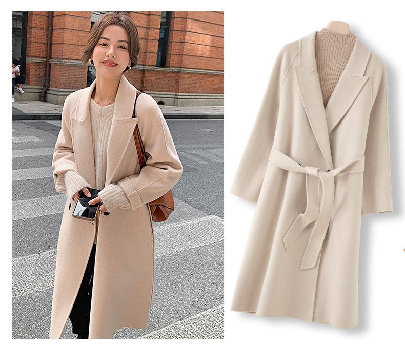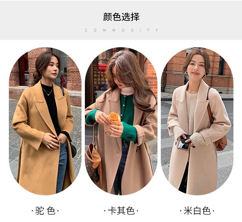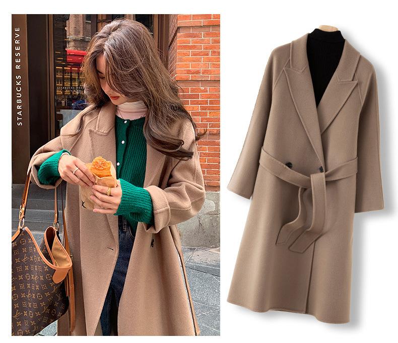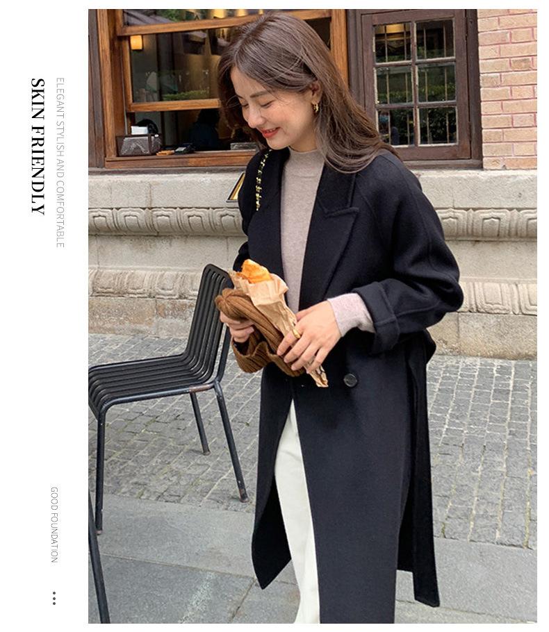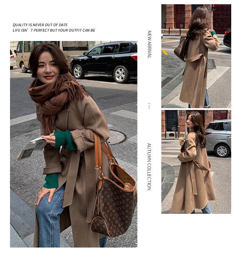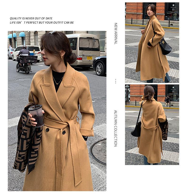 24 Otoño e Invierno Abrigo de Lana de Doble Vista de Largo Medio para Mujer con Cinturón Abrigo de Lana Estilo Coreano Cuello de Traje Abrigo Elegante Casual