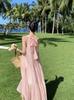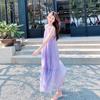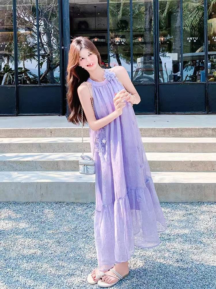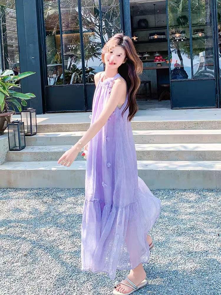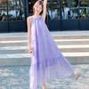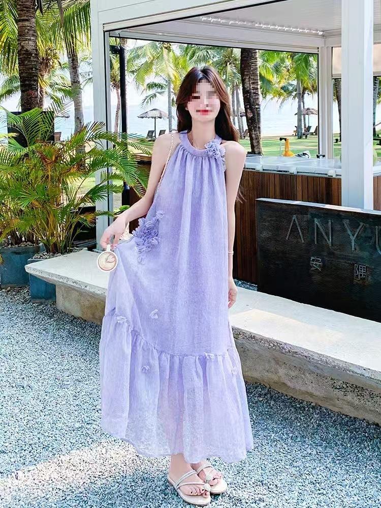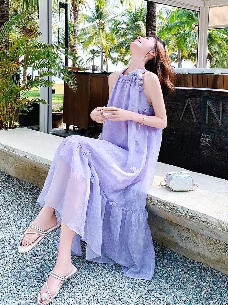 Vestido Lacio Morado Estilo Vacacional con Cuello Halter, Diseño Holgado y Falda Larga Francesa sin Mangas Adelgazante