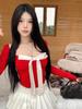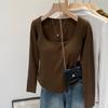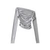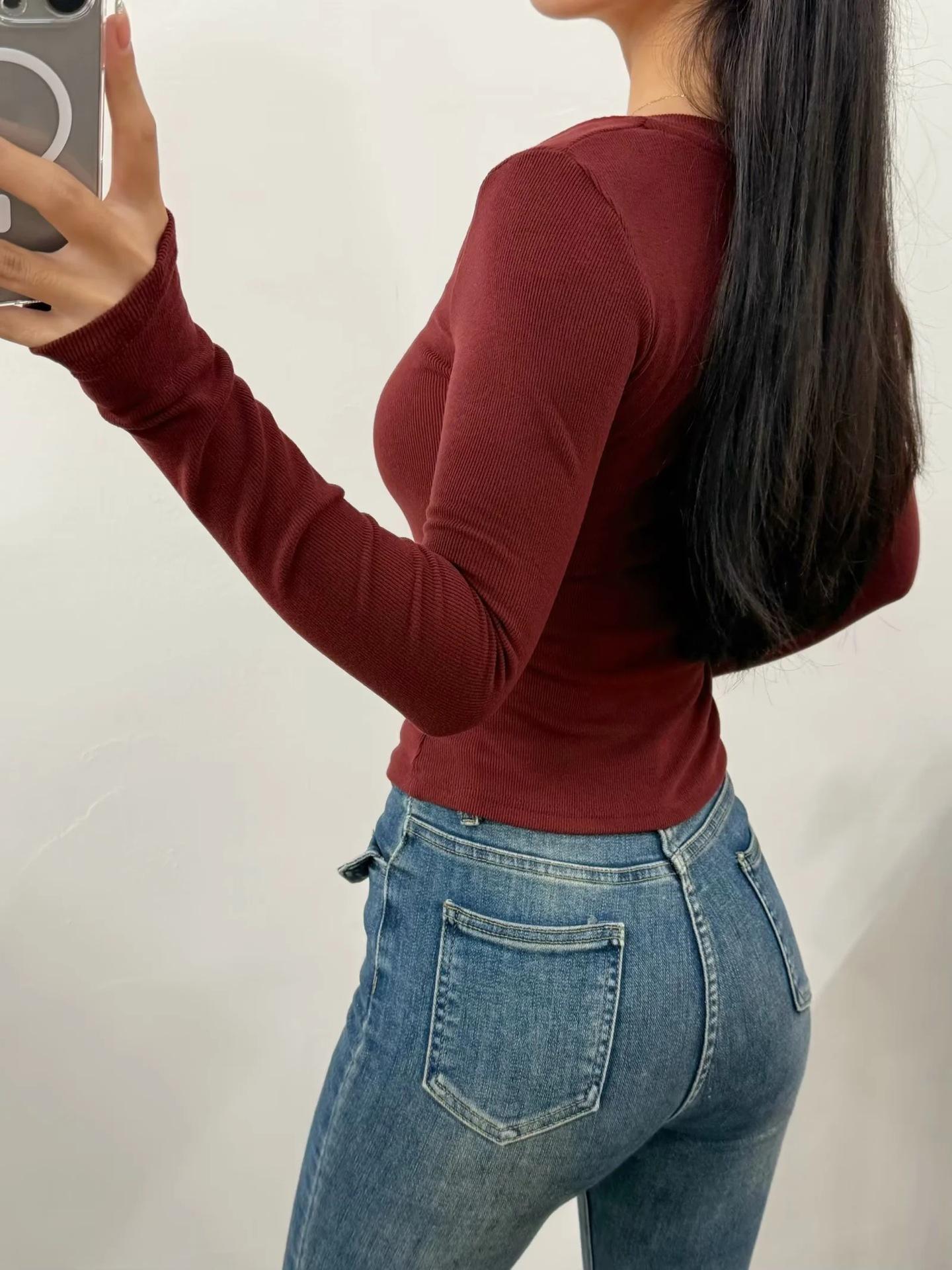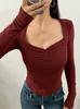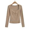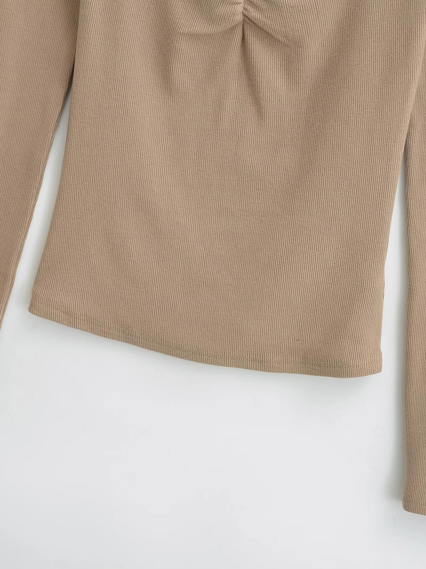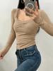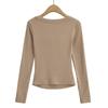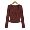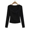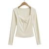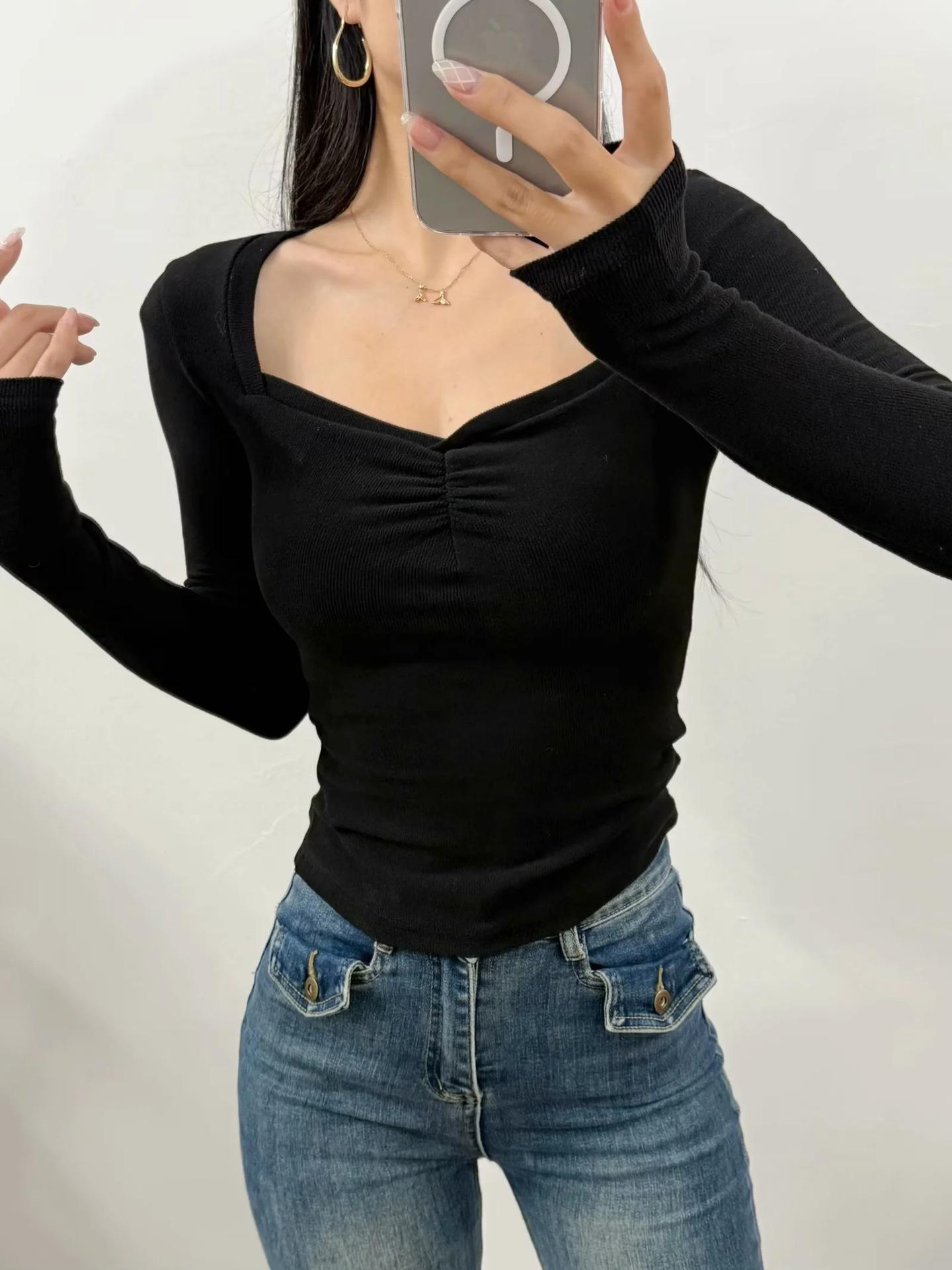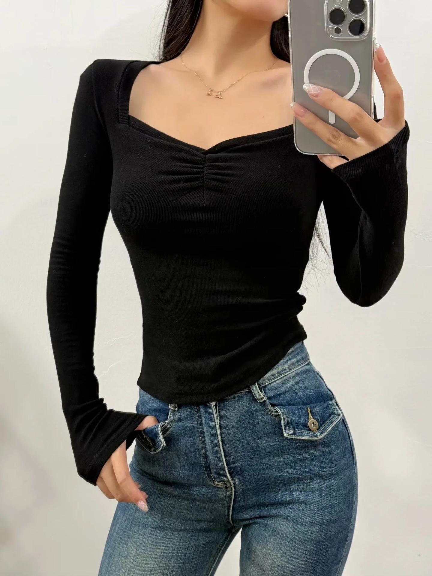 Camiseta de manga larga con cuello cuadrado grande, estilo europeo y americano, pecho plisado, hilo elástico en el bajo pecho, color base