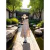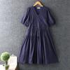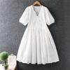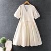 Verano Ropa Nueva para Mujer Estilo Japonés Dulce Encaje Cuello en V Color Sólido Bordado Vestido Largo Manga Corta Algodón Lino Vestido Holgado