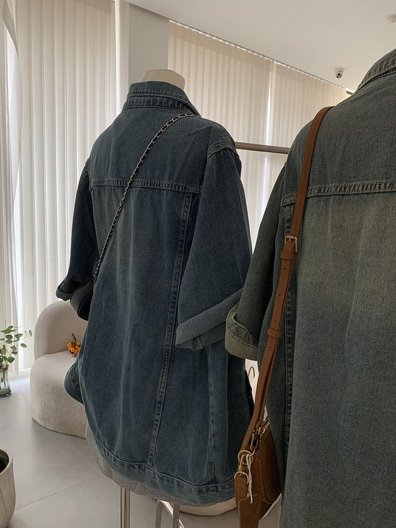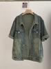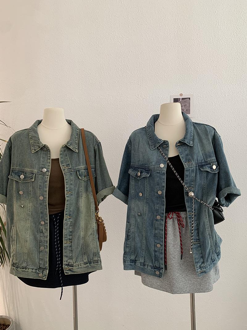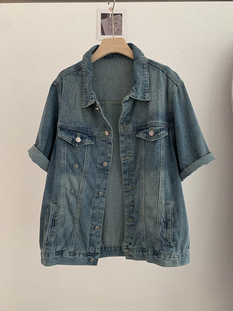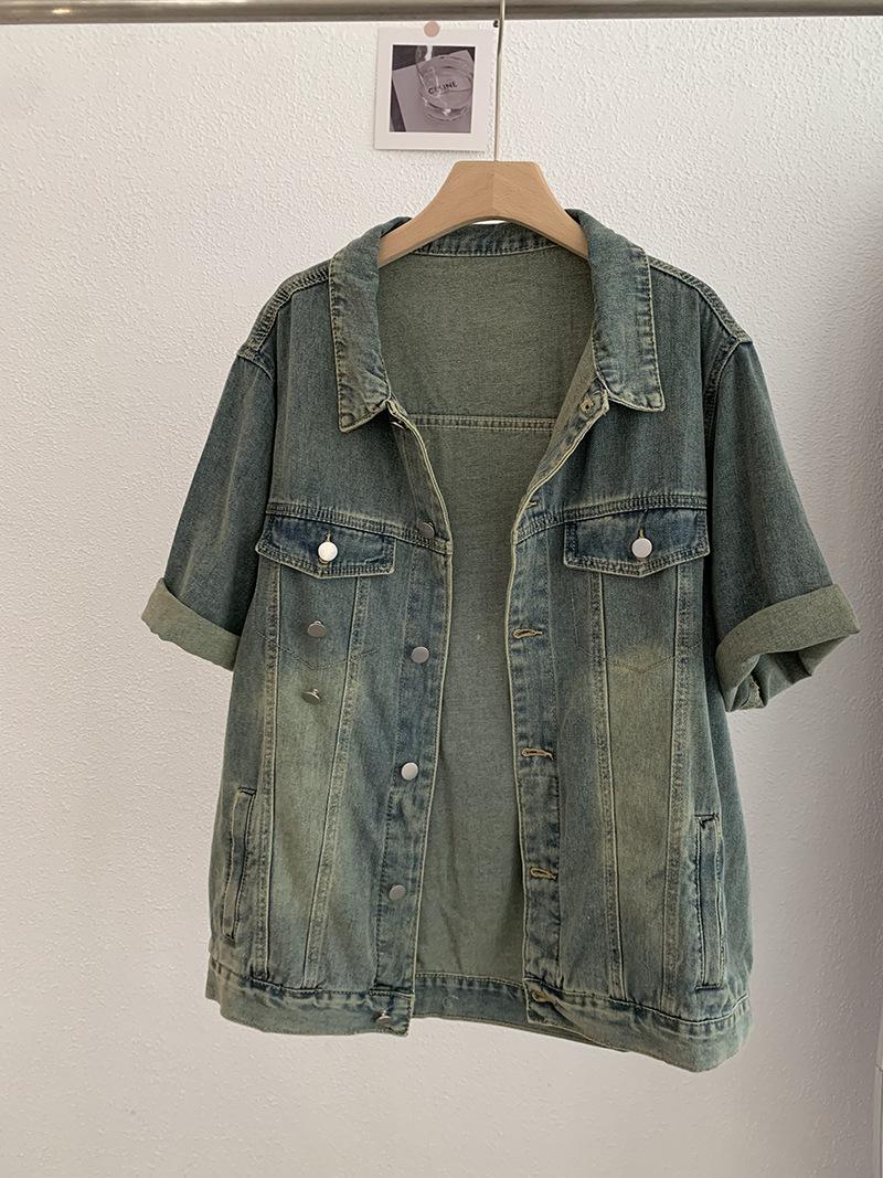Omalai Retro Coreano Moda Verano Chaqueta de Mezclilla de Manga Corta de Moda Solapa Pecho Sencillo Top 3625
