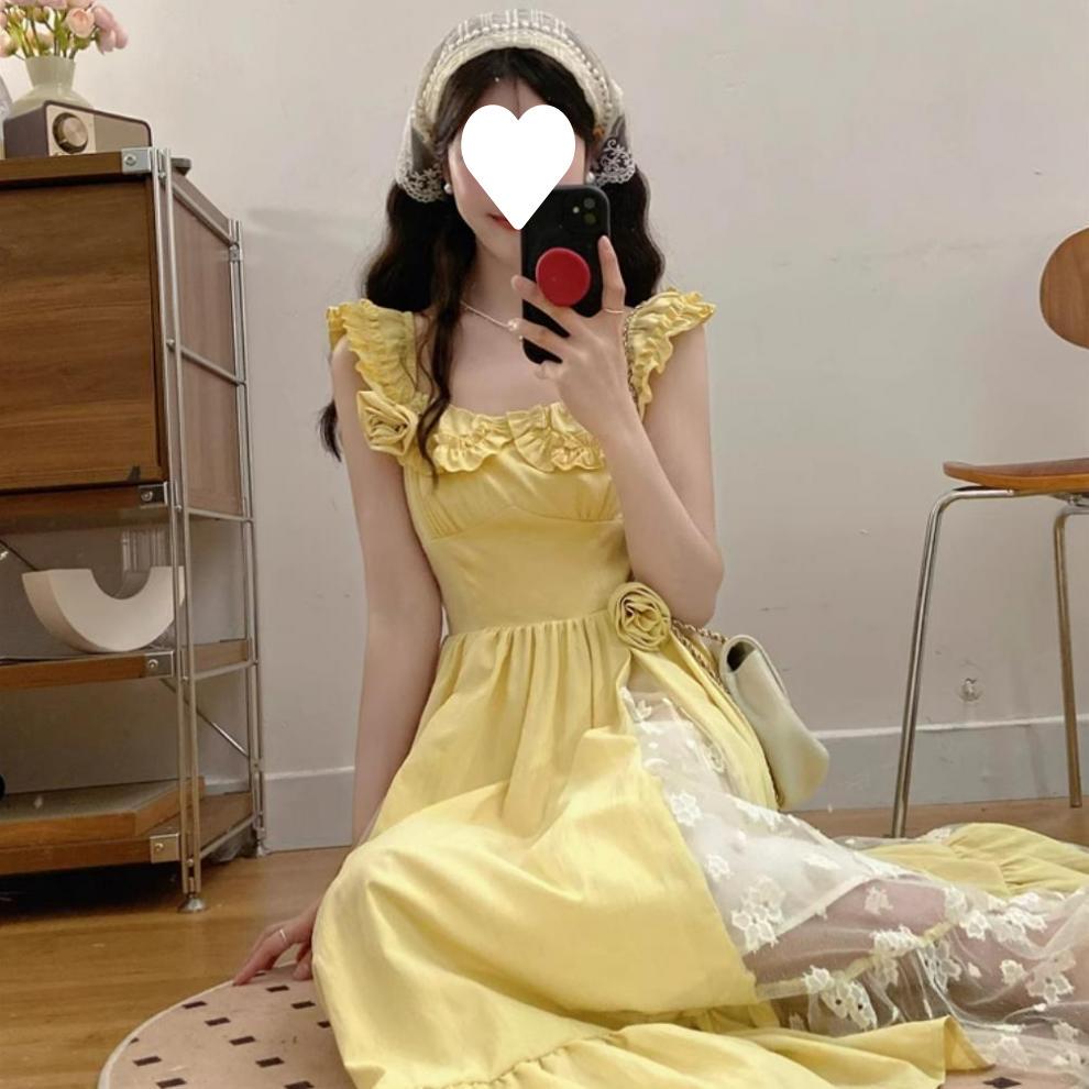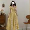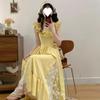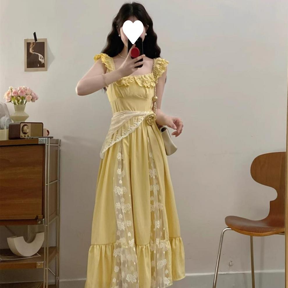 Vestido de Tirantes Bohemio de Verano para Mujer 2025 Nuevo Estilo Mangas Cortas con Vuelo Encaje Empalmado Cintura Falda Larga