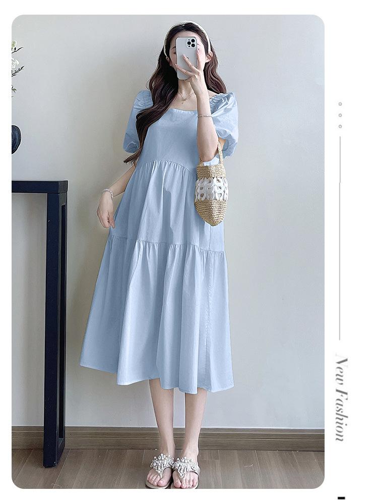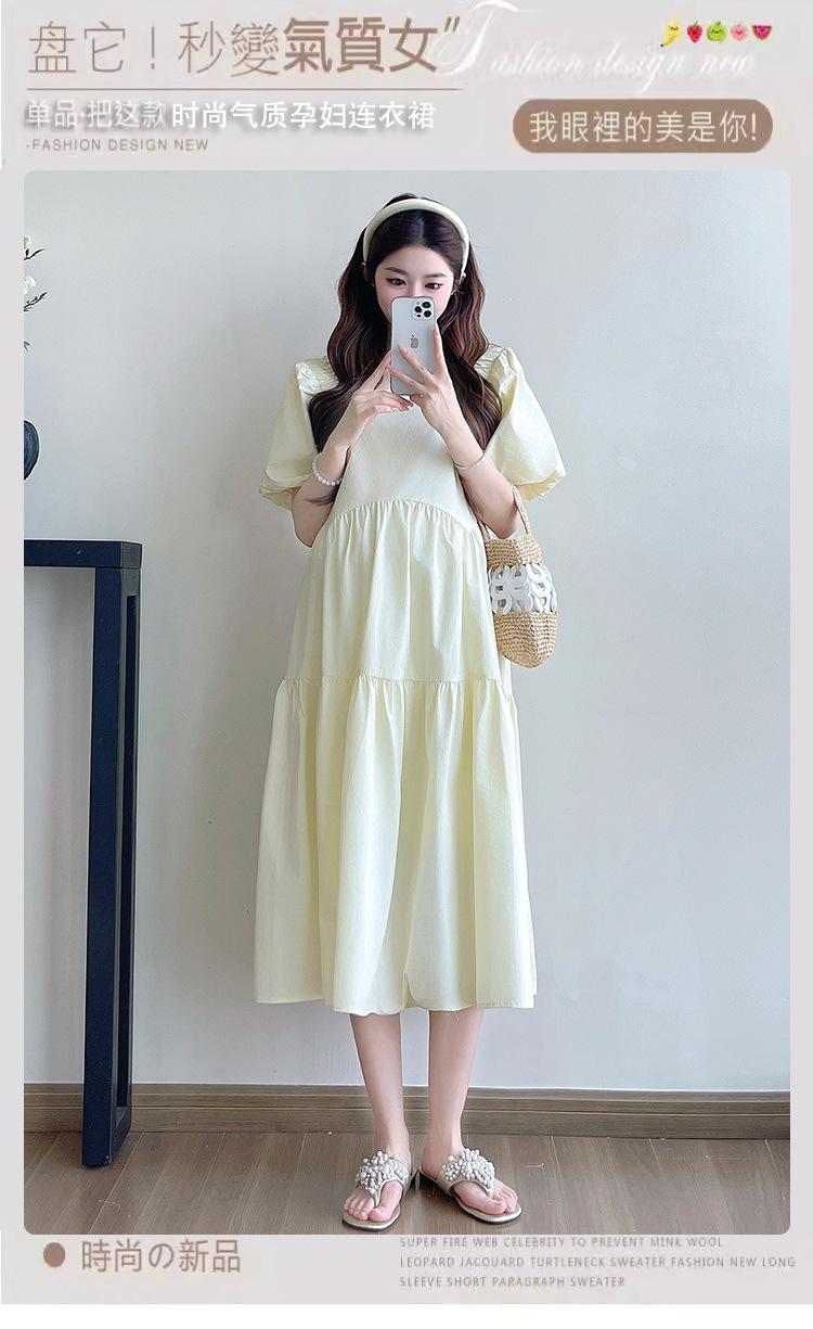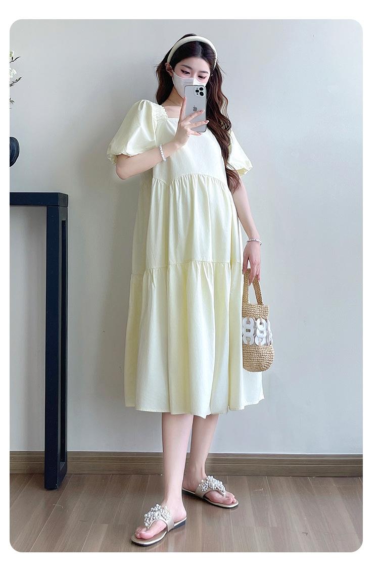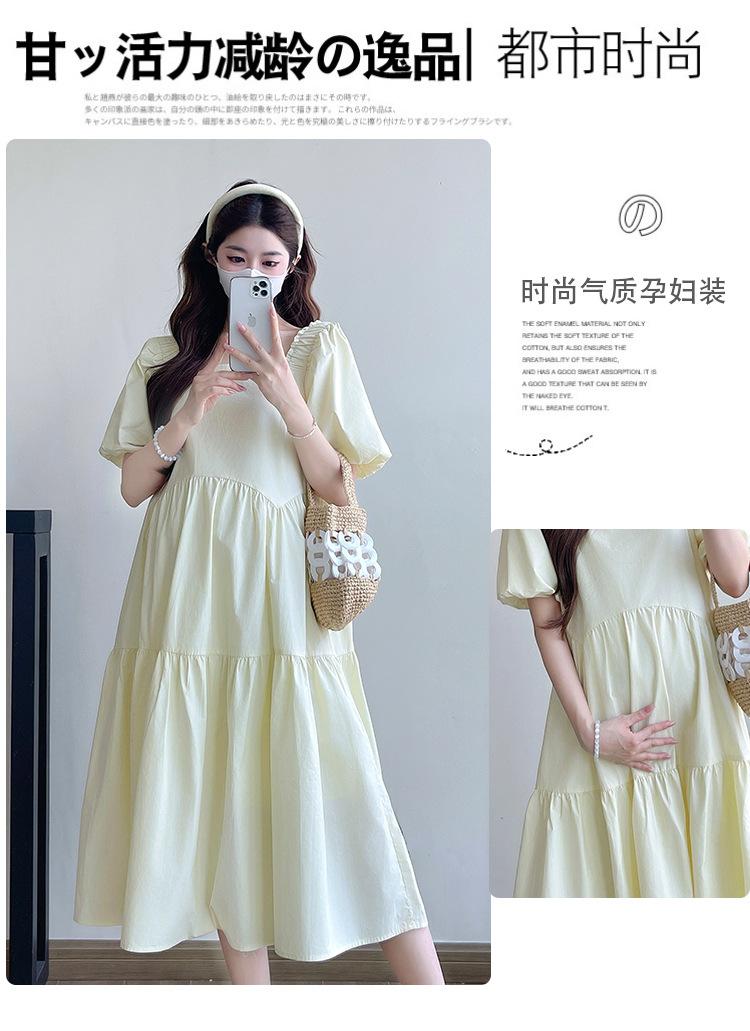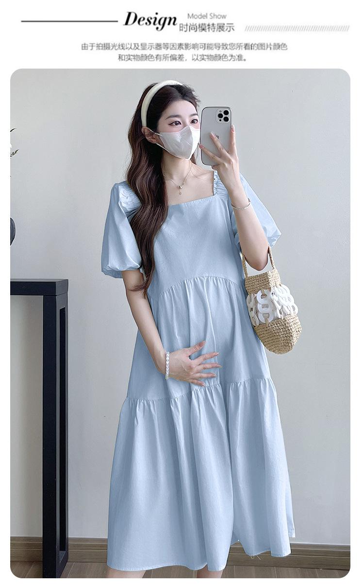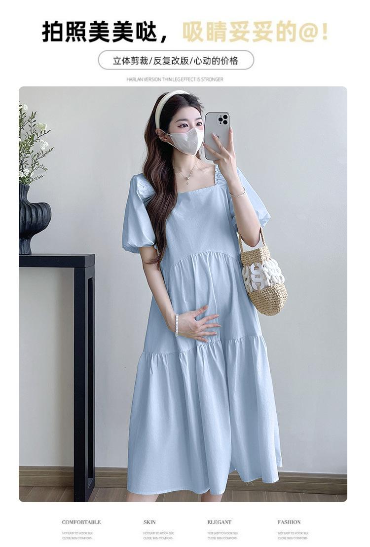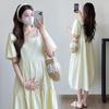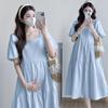 Ropa de Maternidad 2025 Verano Nuevo Estilo Cuello Cuadrado Manga Abullonada Dulce Francés Vestido de Maternidad Midi