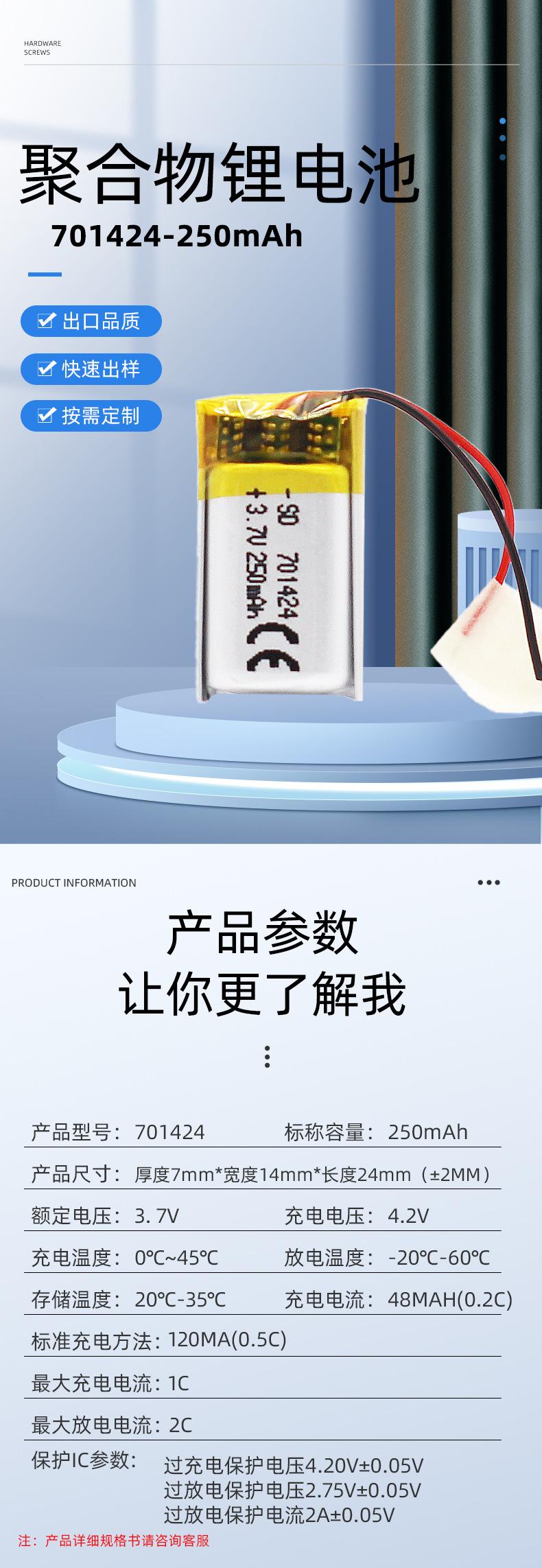 Batería de Polímero de Litio 3.7V 701424 250mAh Puede Agregar Terminal de Enchufe Control de Temperatura NTC Código de Inyección de Tinta