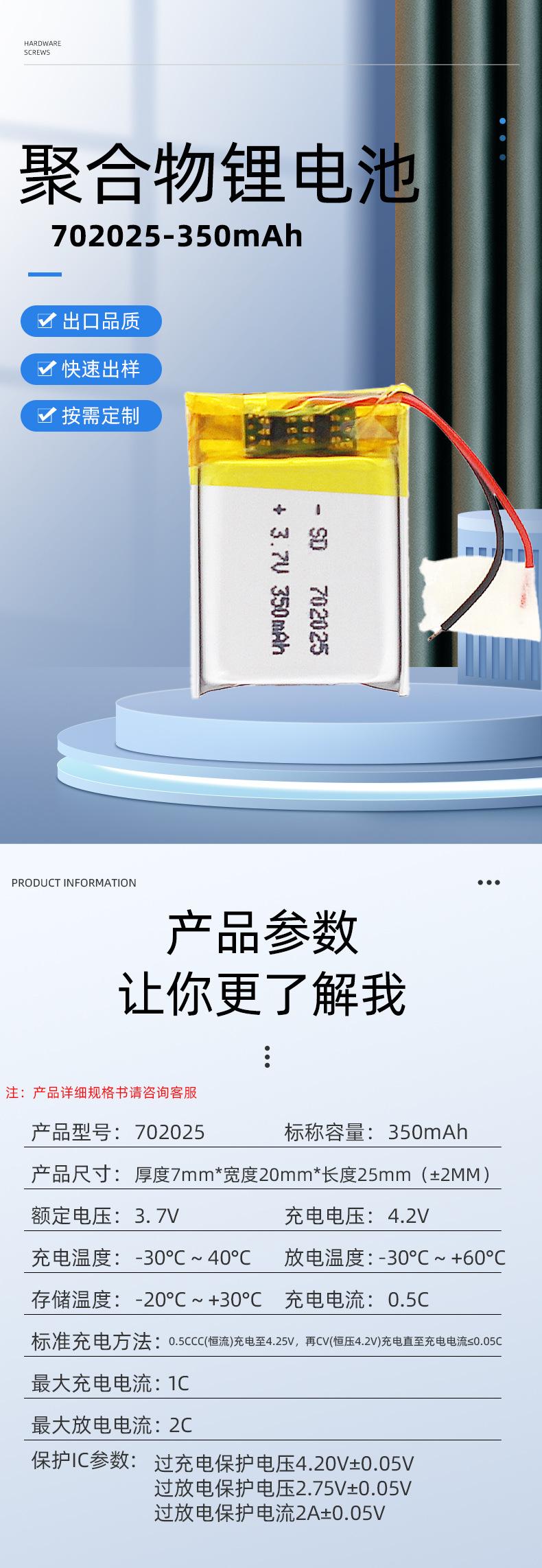 Batería de Polímero de Litio 3.7V 702025 350Mah Productos Digitales Instrumento Led Batería Incorporada