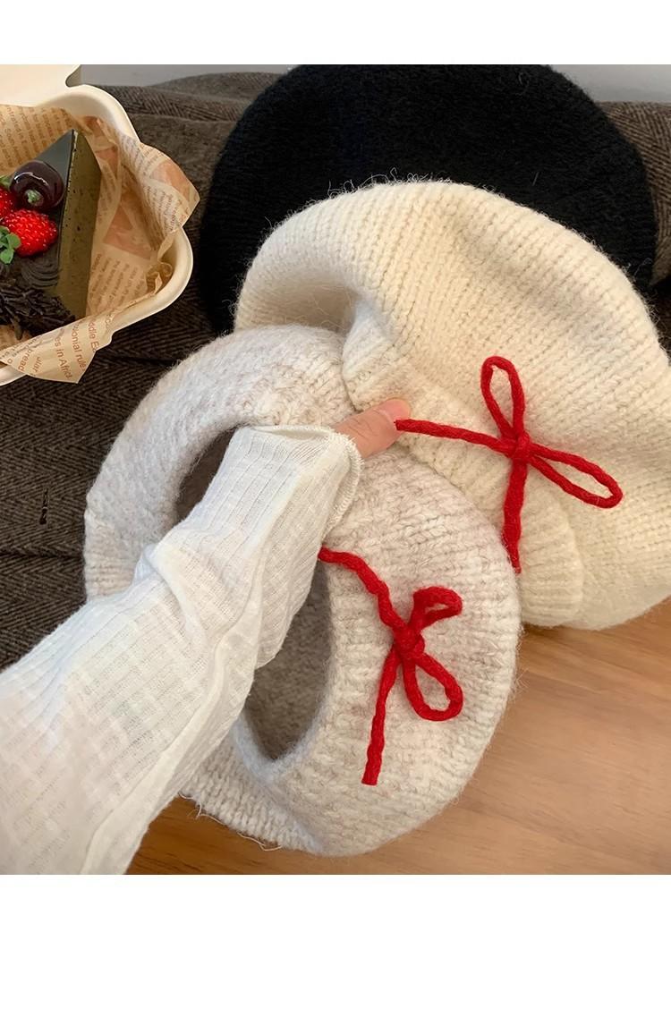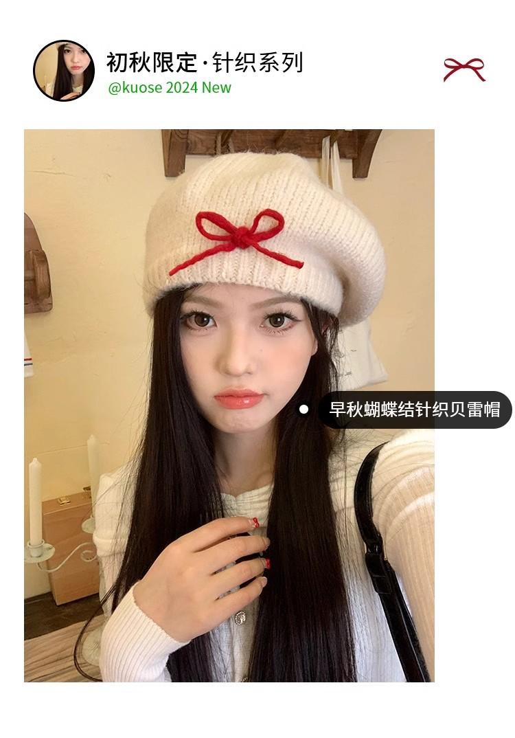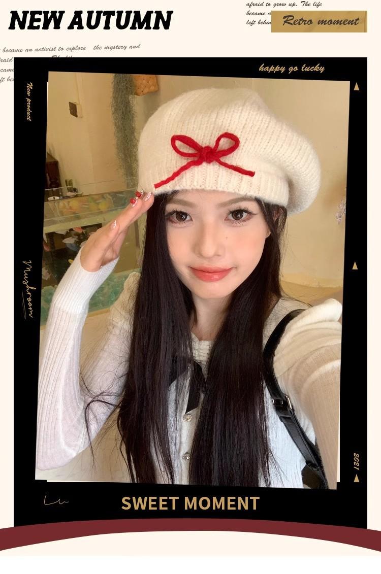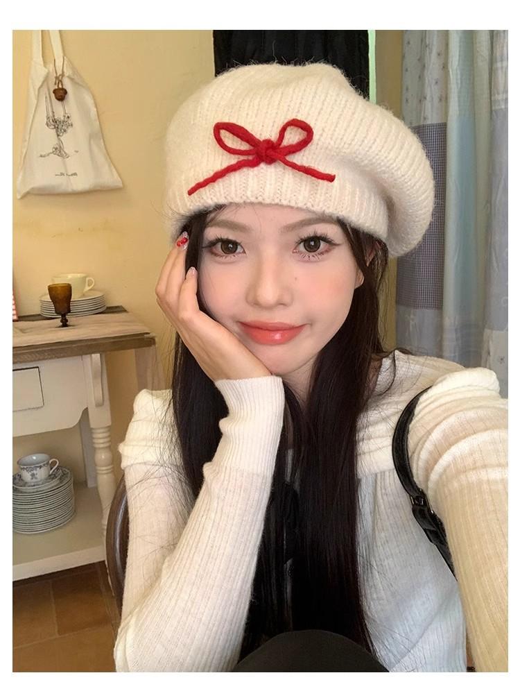 Boina de Punto de Felpa con Lazo Estilo Coreano para Mujer Otoño e Invierno a Prueba de Frío Cálido Lana Sombrero Cabeza Grande Circunferencia Sombrero Pequeño