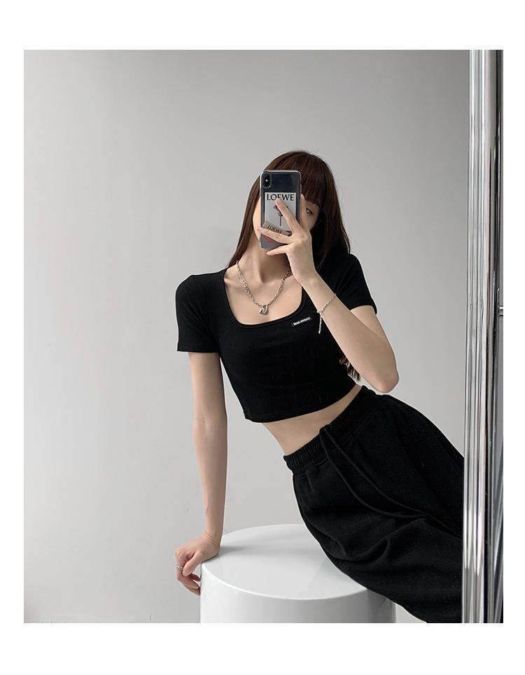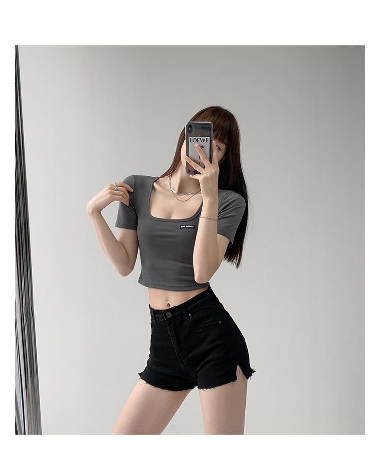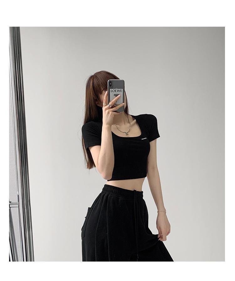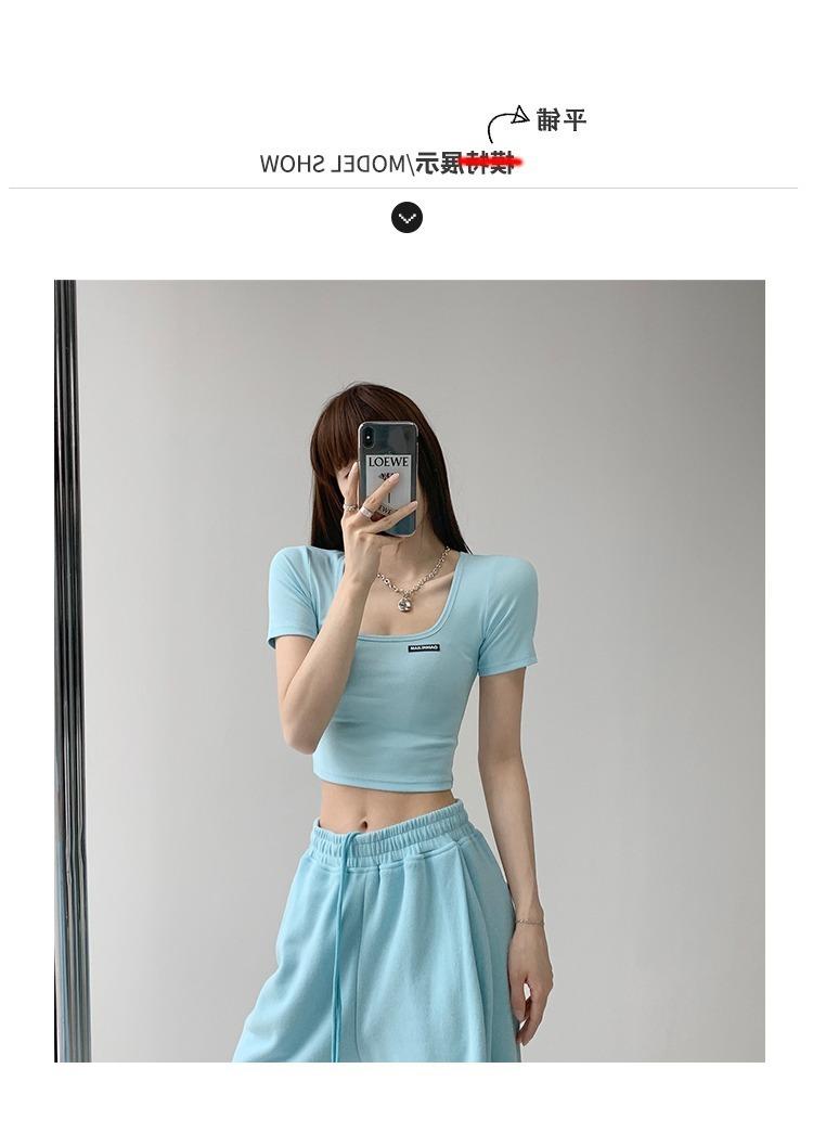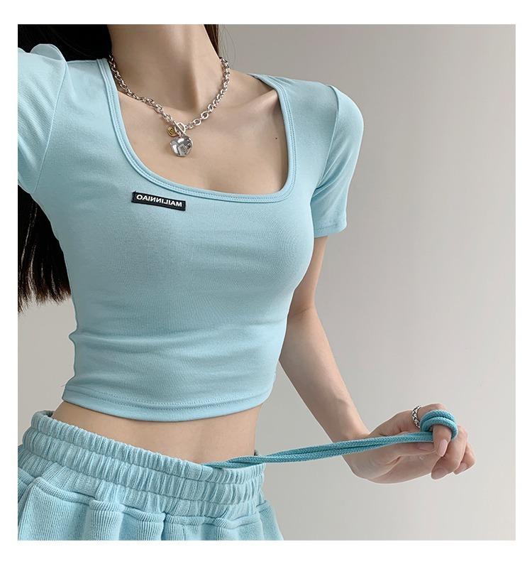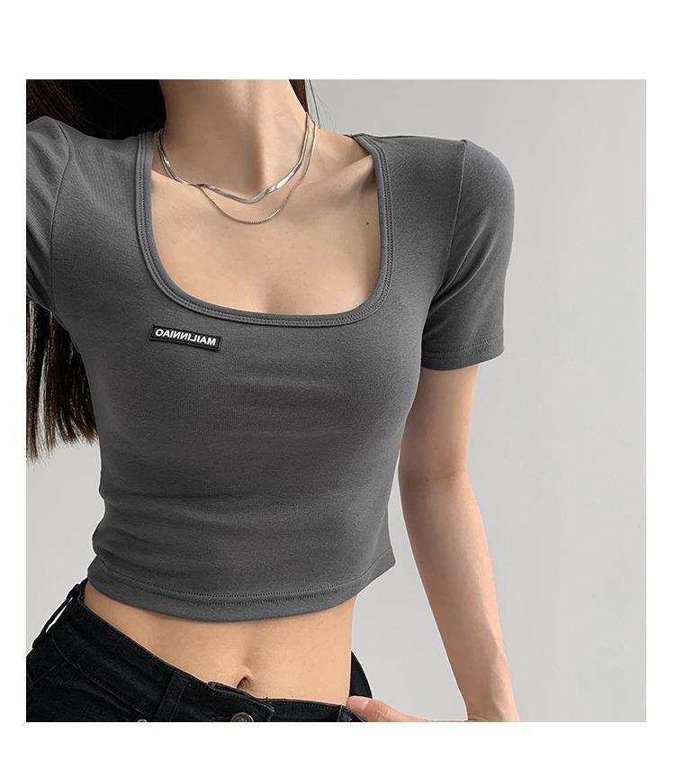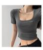 2025 Cuello Cuadrado Clavícula Expuesta Slim Camiseta Básica de Manga Corta Ombliguera Estudiante Top Corto Estudiante Chica Trbottomy Exportación