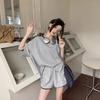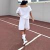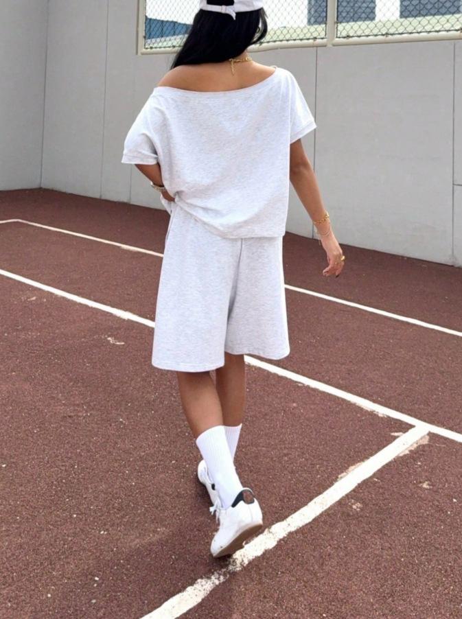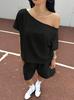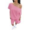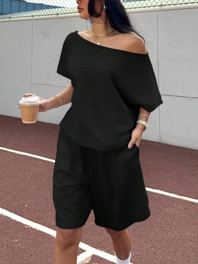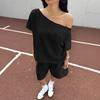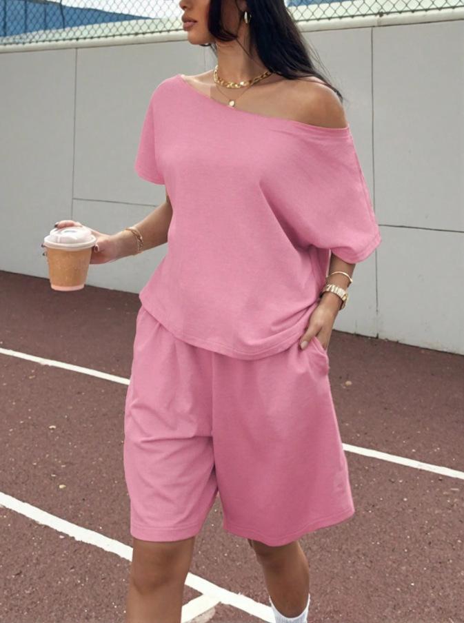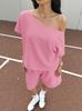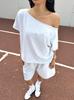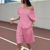 Traje de Moda 2025 Europeo y Americano Transfronterizo Casual Deportivo Sexy Hombro Inclinado Manga Corta Holgado Shorts Cinco Puntos Conjunto de Dos Piezas para Mujer