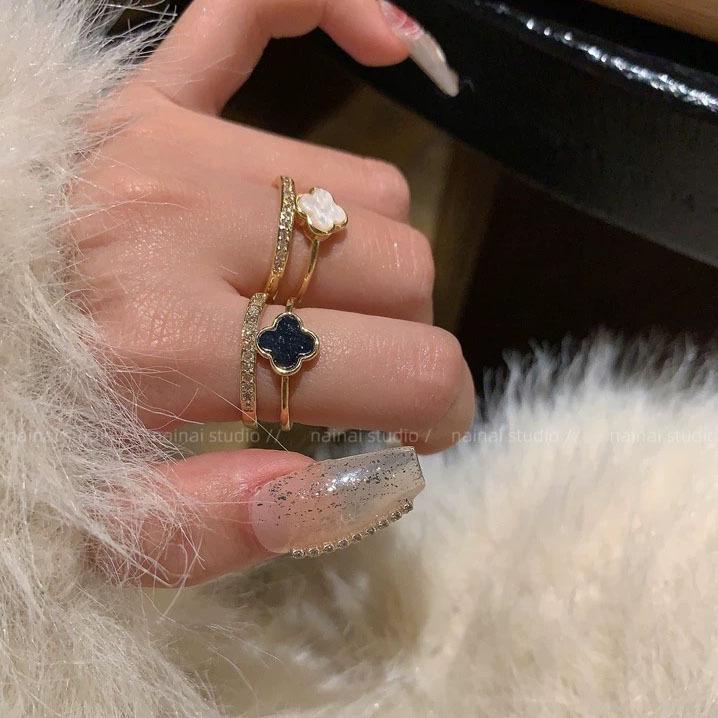 Anillo Abierto de Trébol de Cuatro Hojas de Doble Capa Negro para Mujer, Lujo Accesible, Súper Brillante, Nuevo Elegante 2025, Anillo Versátil para el Dedo Índice