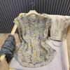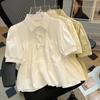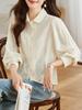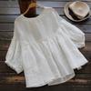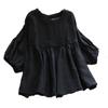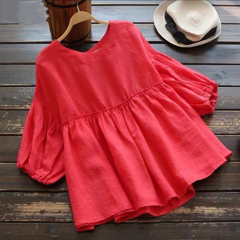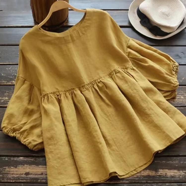 2023 Nuevo Estilo Estilo Occidental Reductor de Edad Camisa de Muñeca de Cuello Redondo Estilo Coreano Top Suelto Plisado Camisa de Manga Linterna para Mujer de Imitación Algodón y Lino