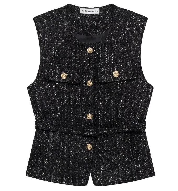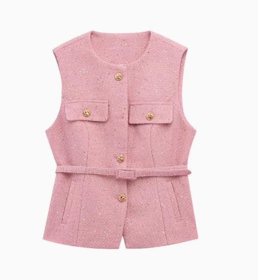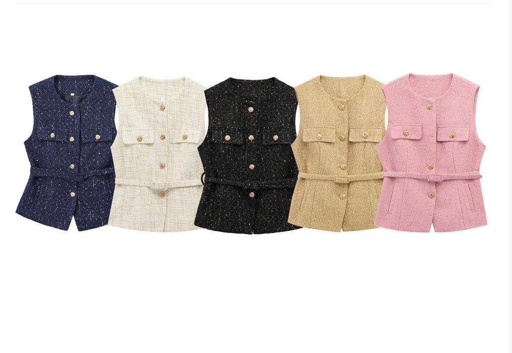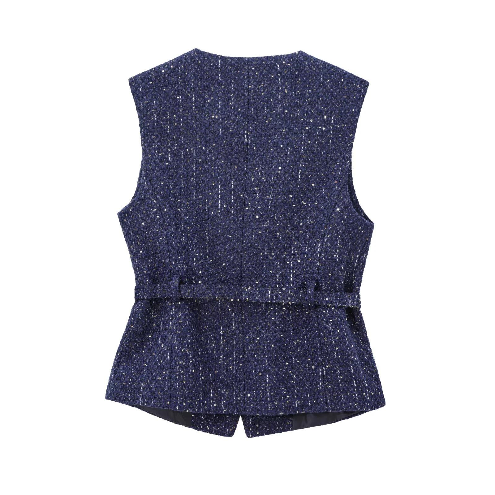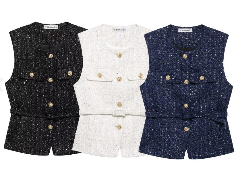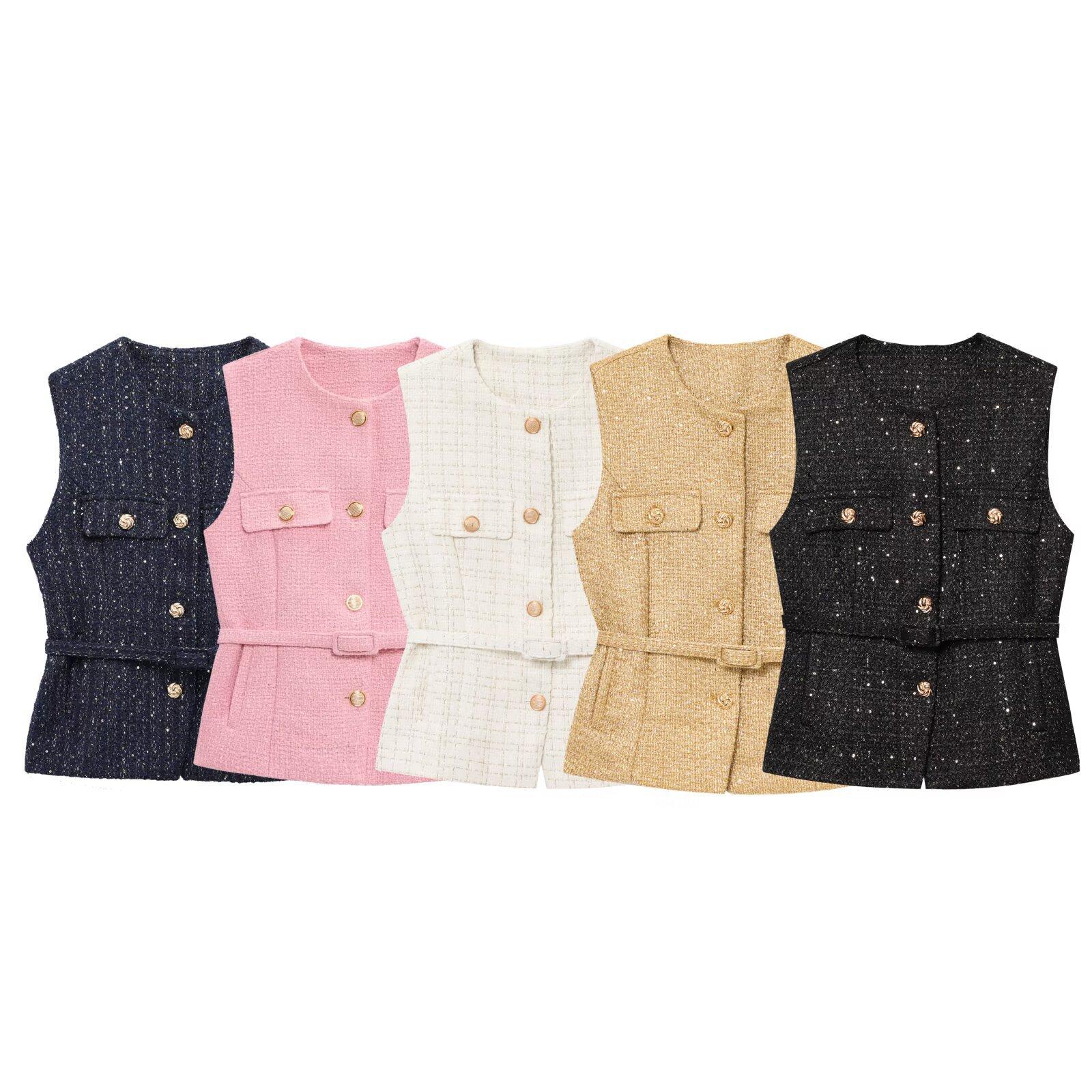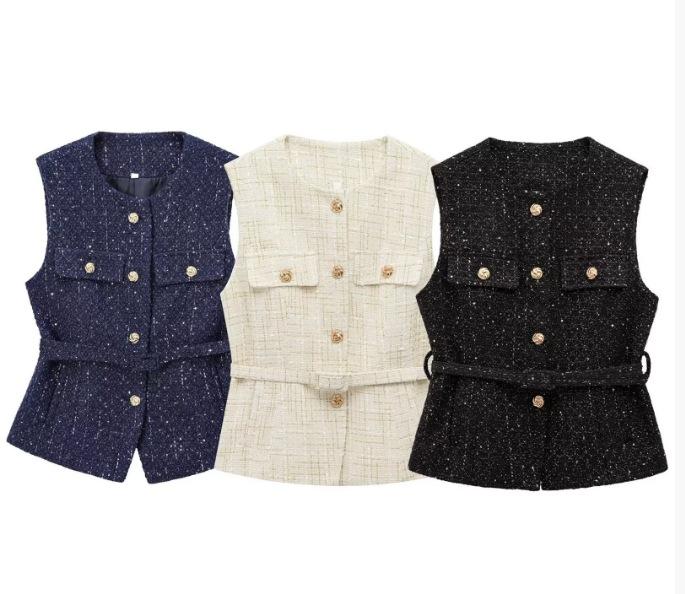 2025 Ropa al por mayor transfronteriza europea y americana Ins Celebridad de Internet Estilo caliente Chaleco con cinturón y textura de lentejuelas Yf-21186