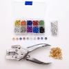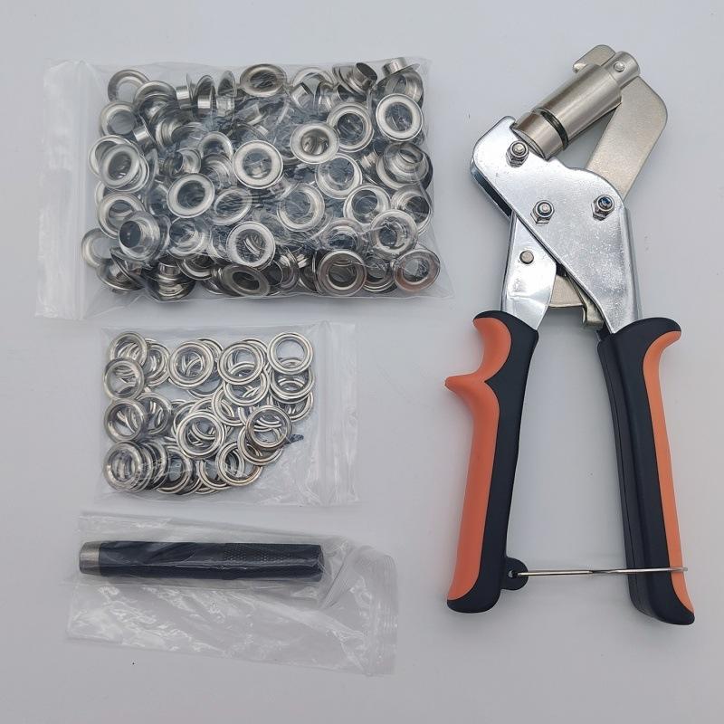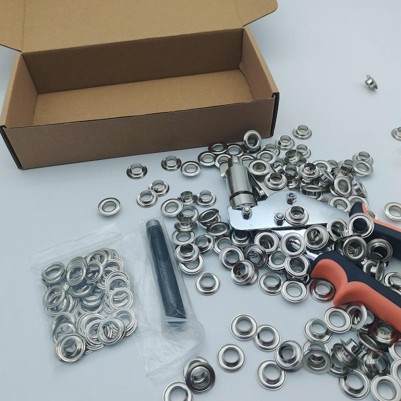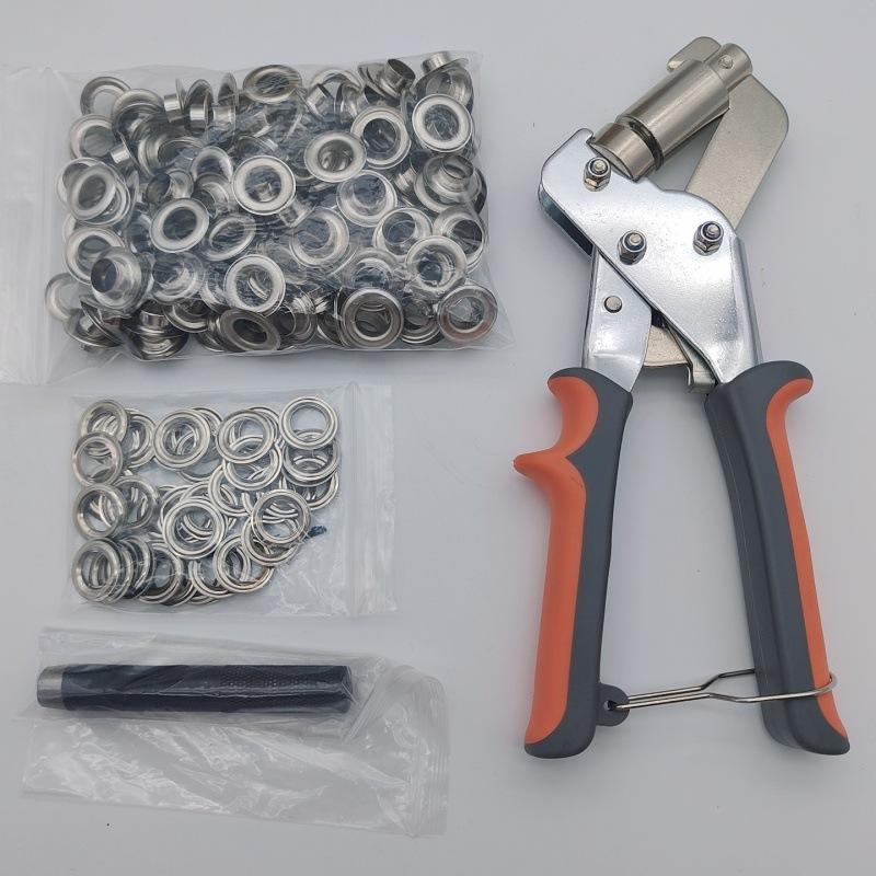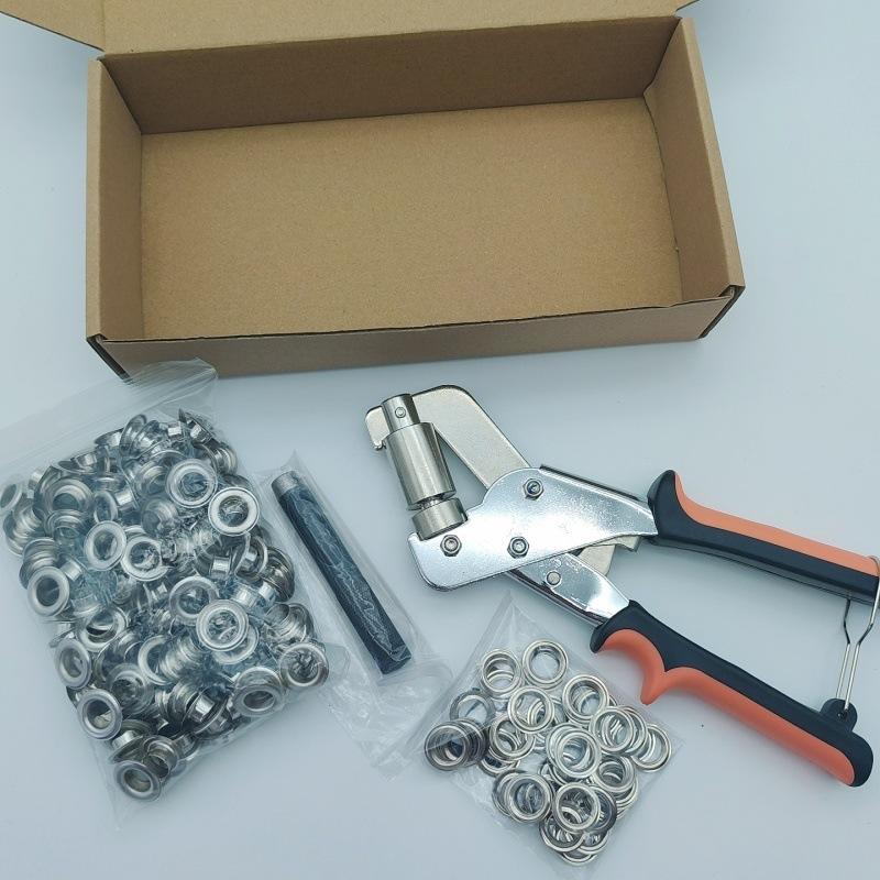 Ojetes plateados*100 juegos ojetes de 10 mm+ponchadora negra+ (alicates gris-naranja embolsados) caja de avión 700 gramos