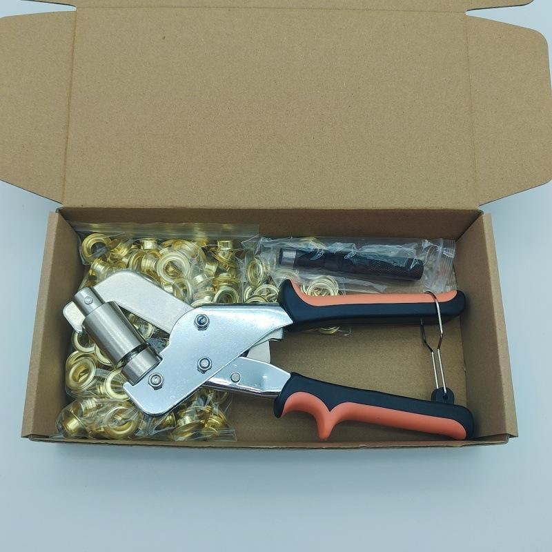 Ojal dorado*100 juegos ojal de 10 mm+ponchadora negra+ (alicates gris-naranja embolsados) caja avión 700 gramos