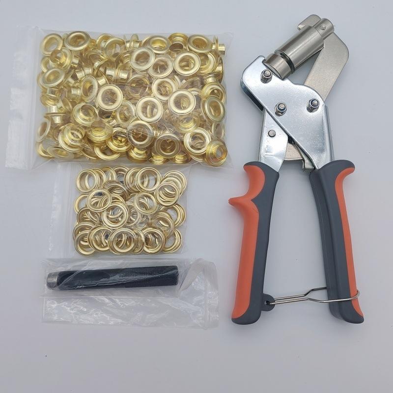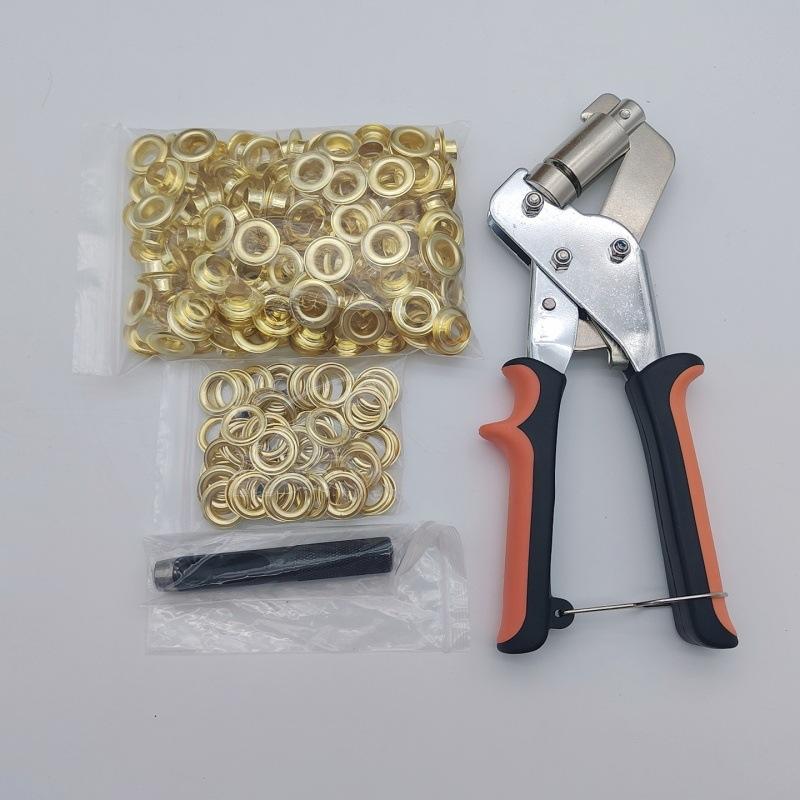 Ojetes dorados*300 juegos ojetes de 10 mm+ponchadora negra+ (alicates gris-naranja embolsados) caja de avión 880 gramos