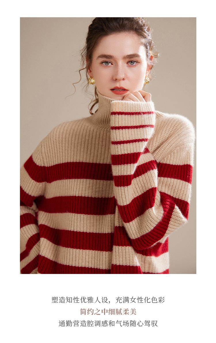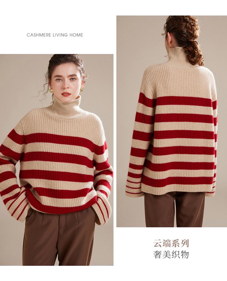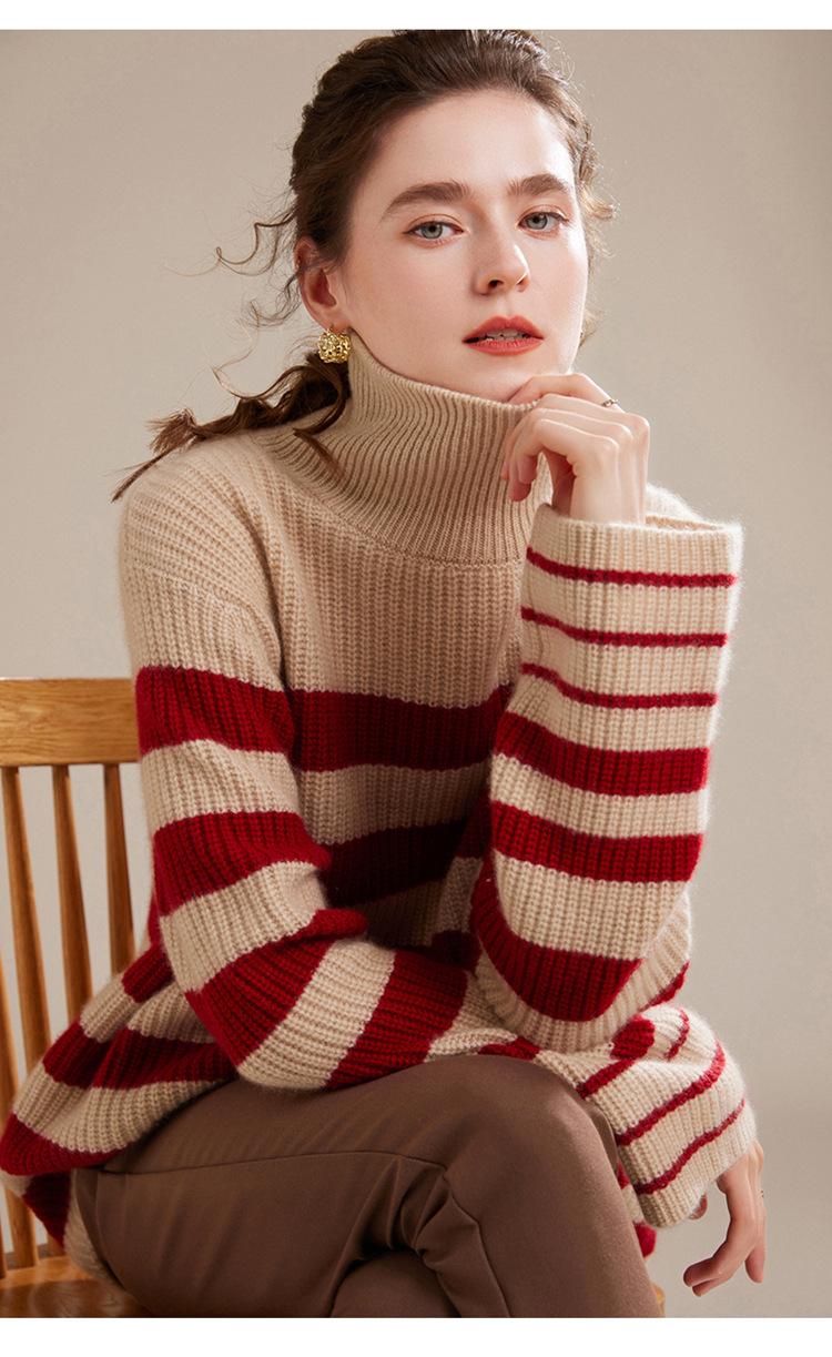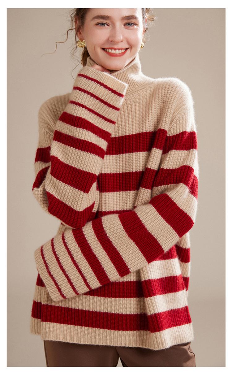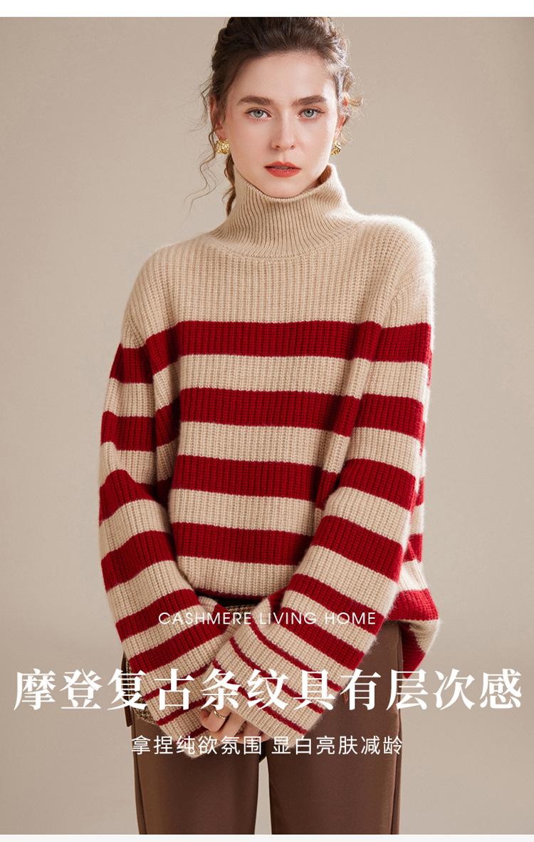 2023 otoño e invierno nuevo cuello alto de mujer cachemira pura cinco agujas grueso retro a rayas suéter de cachemira tejido holgado