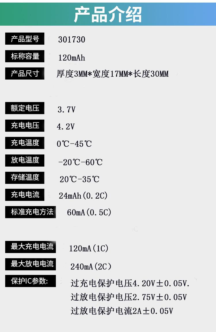 Batería de Polímero de Litio 3.7V 301730 160mAh Puede Agregar Terminal de Enchufe Control de Temperatura NTC Código de Inyección de Tinta