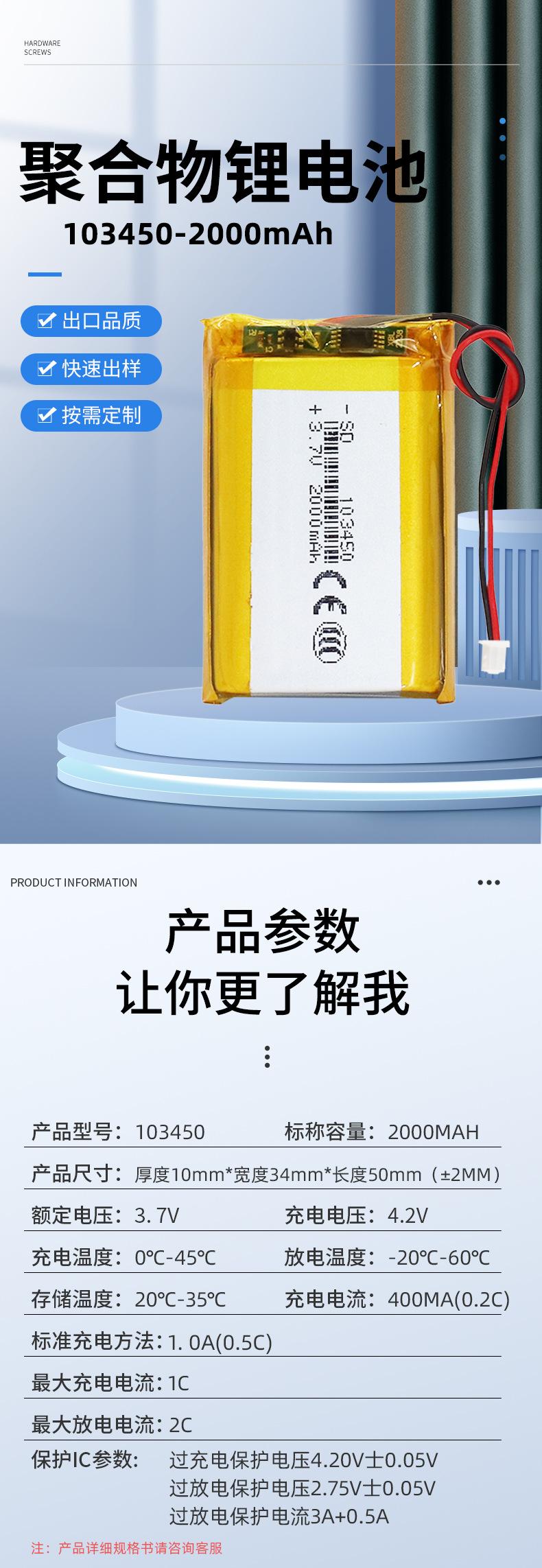 Batería de polímero de litio de 3.7V 103450 2000mAh se puede agregar con terminal de enchufe, control de temperatura NTC, código de rociado