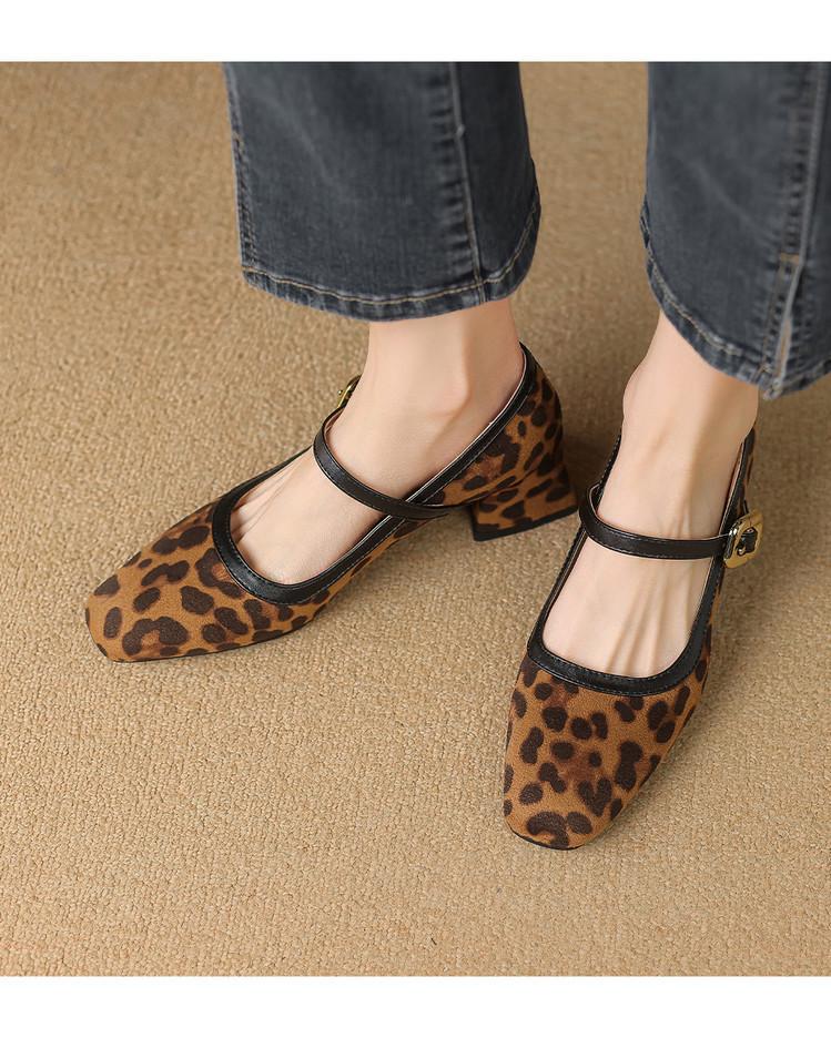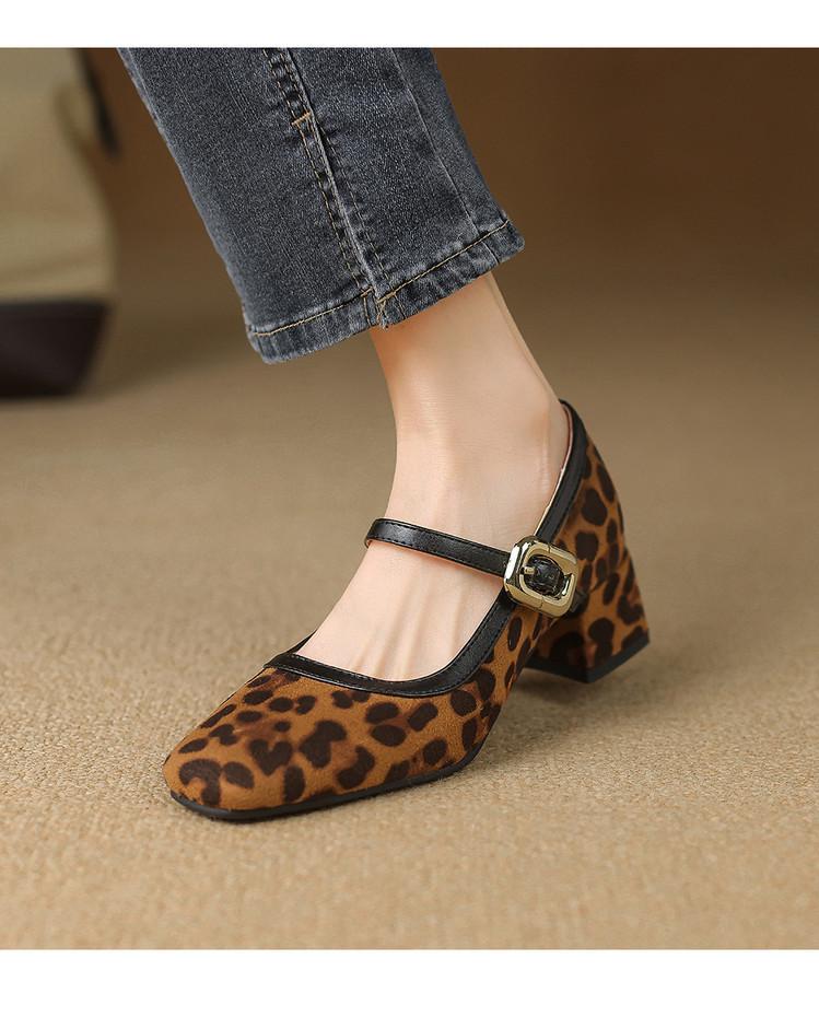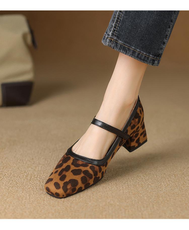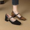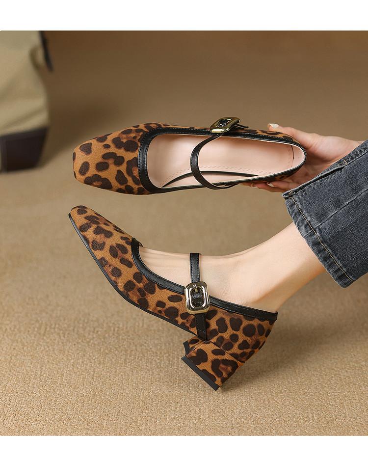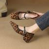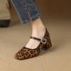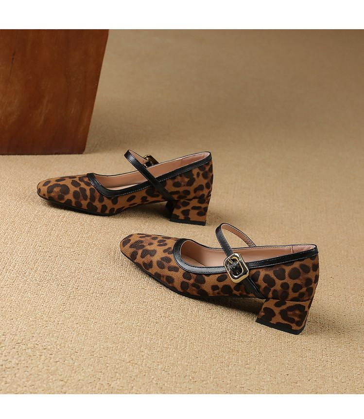 Zapatos de Cuero Pequeños para Mujer con Punta Redonda y Tacón Medio Estampado de Leopardo Zapatos de Moda para Mujer Suela de Goma Suave Slip-On Casual Tacón Cuadrado