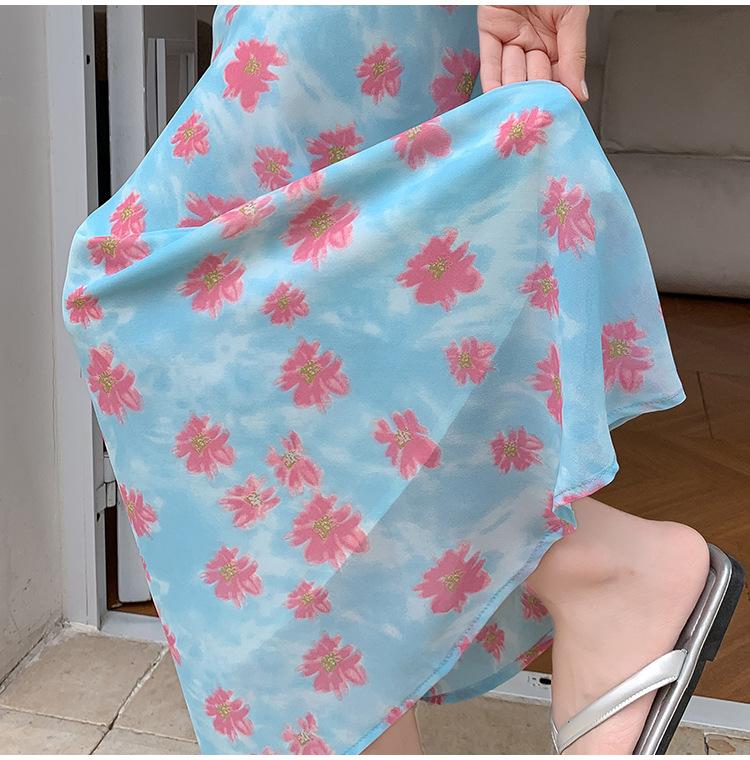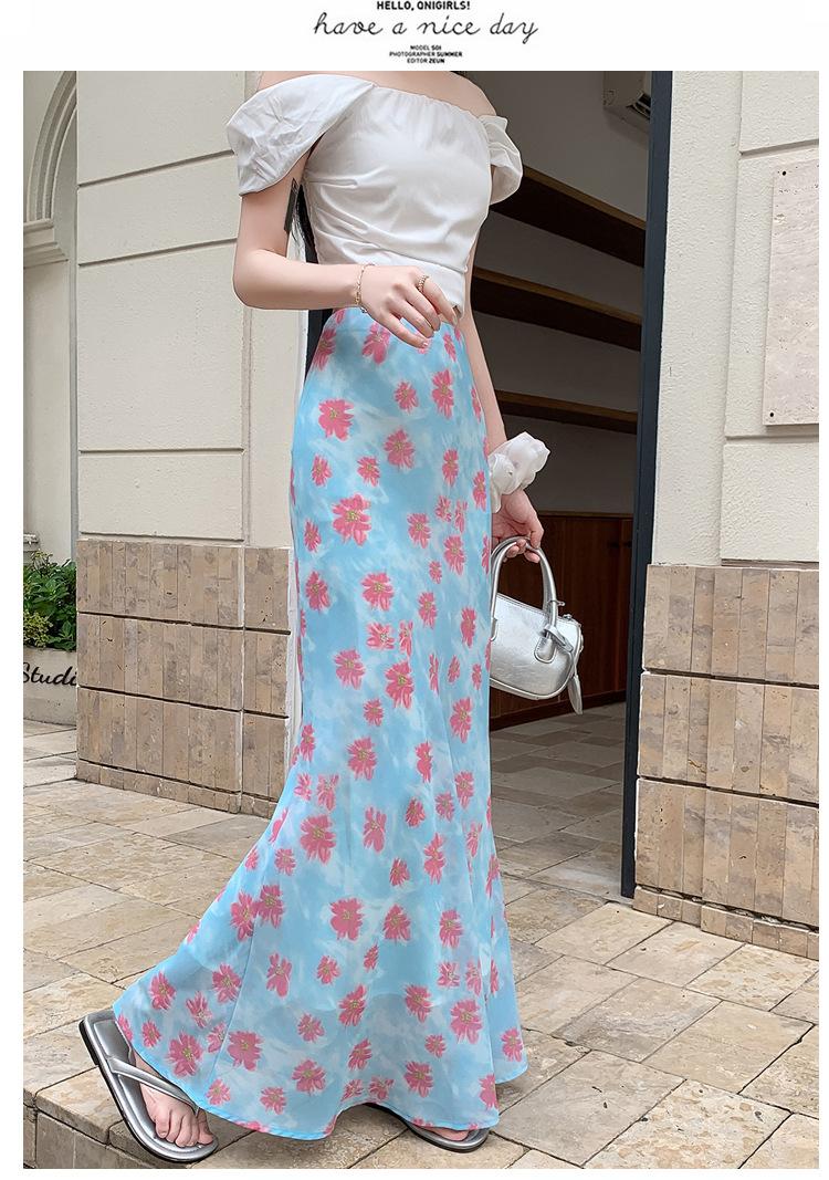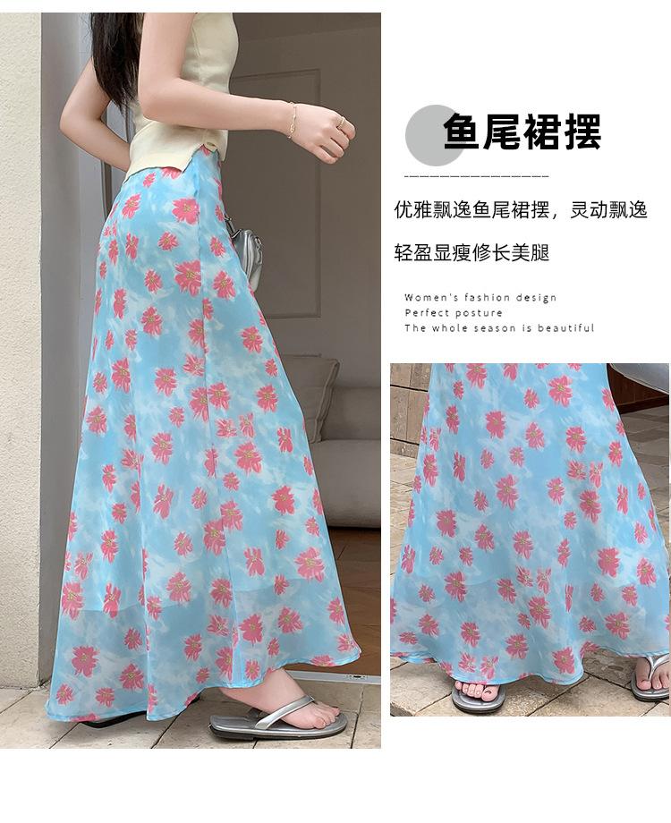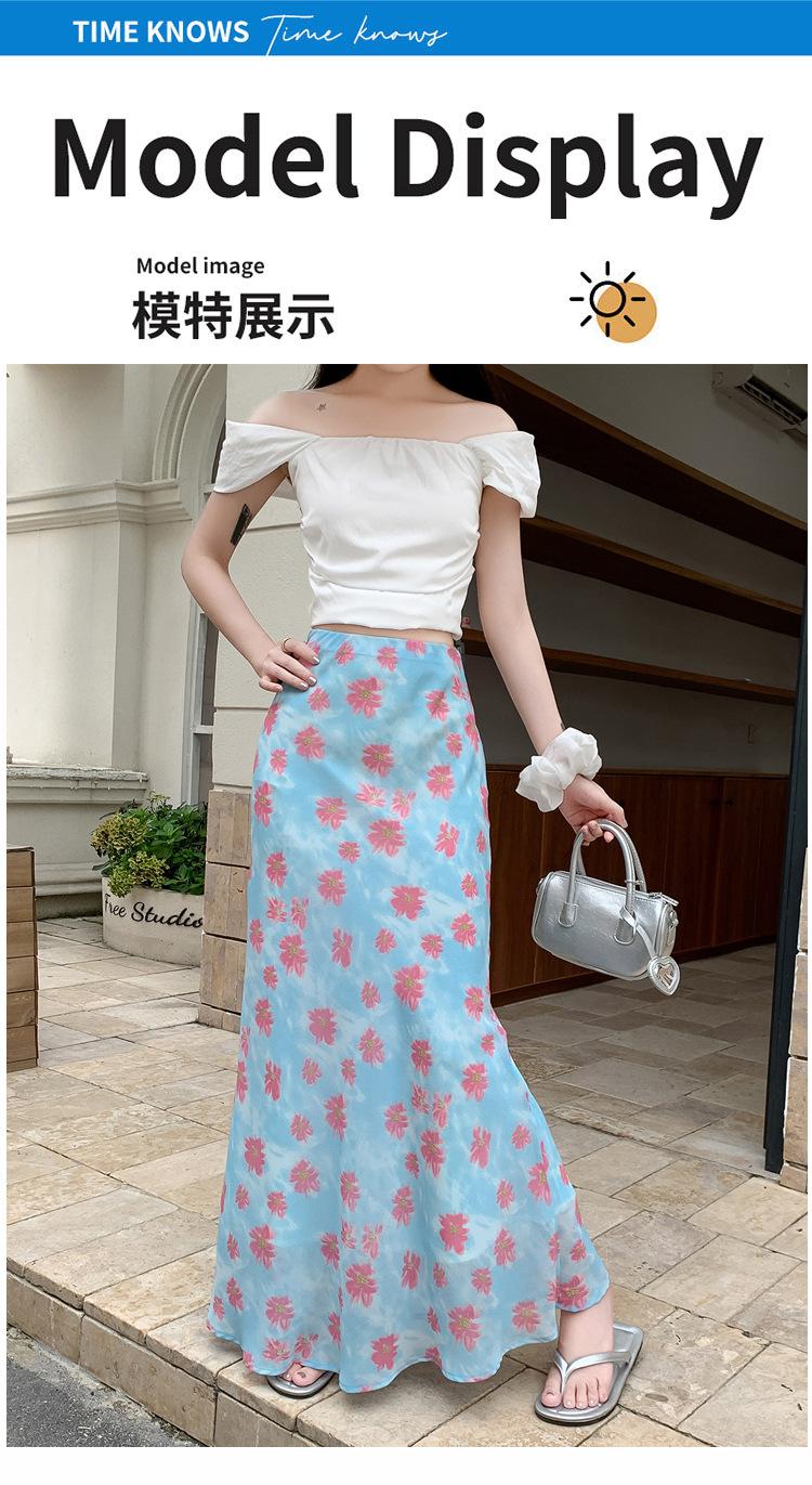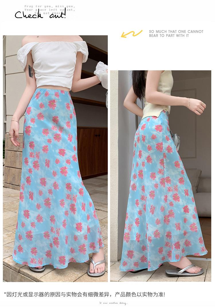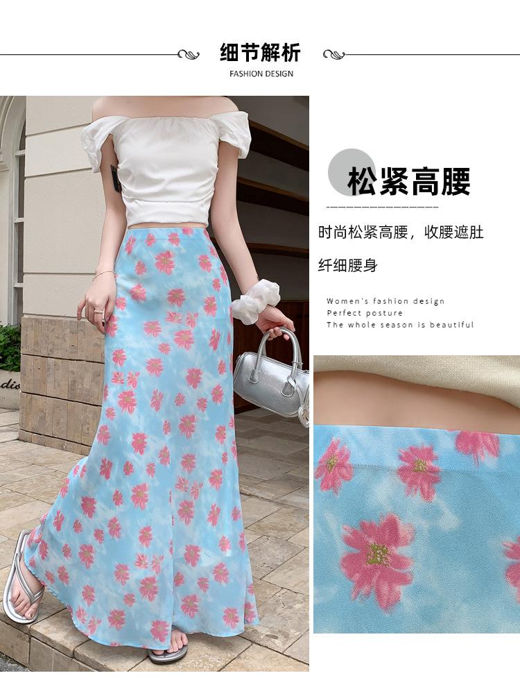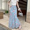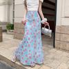 Falda Larga de Chifón Floral Azul con Cola de Pez para Mujer Verano Nuevo Estilo Pequeña Fresca Estampada con Volantes en la Cadera