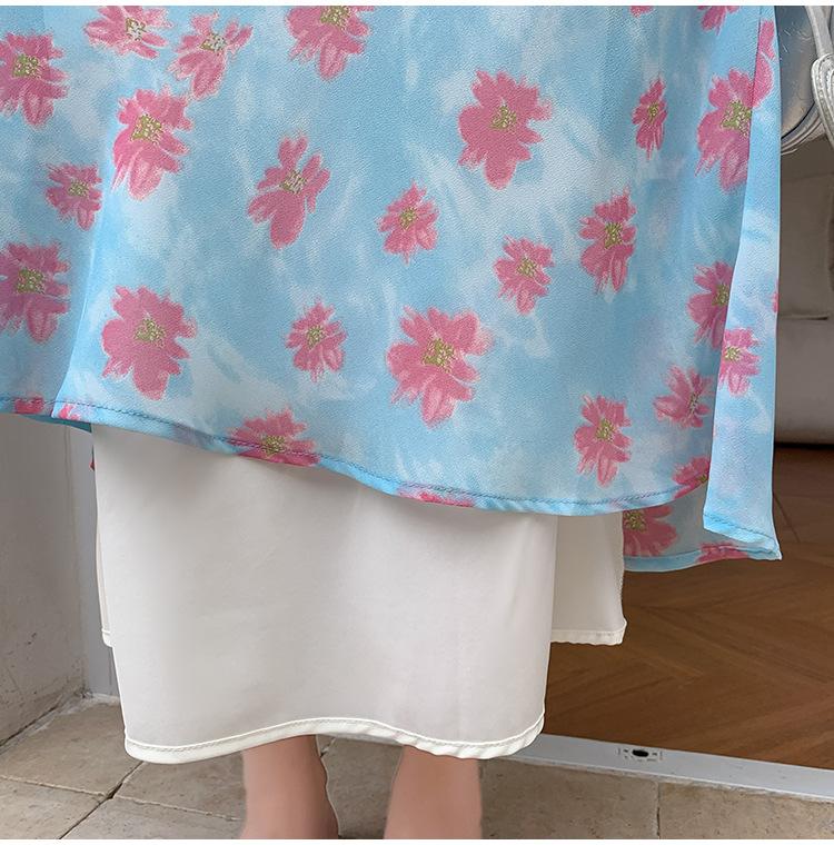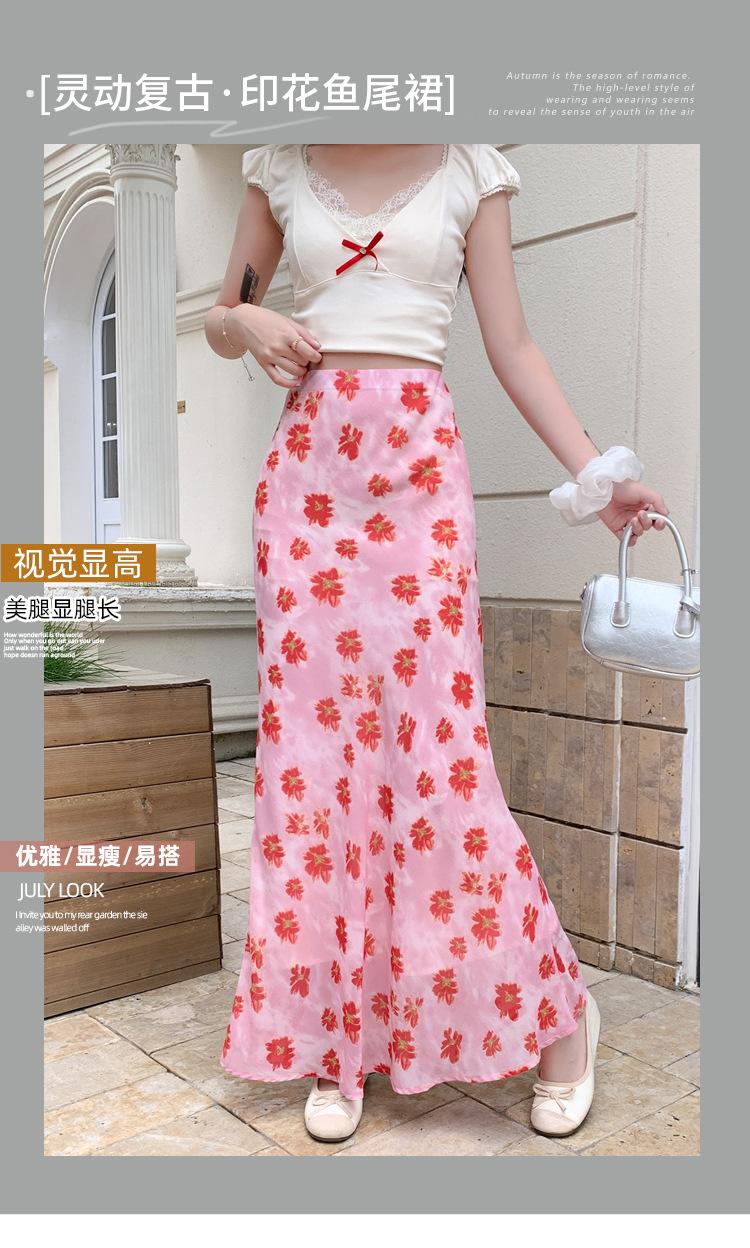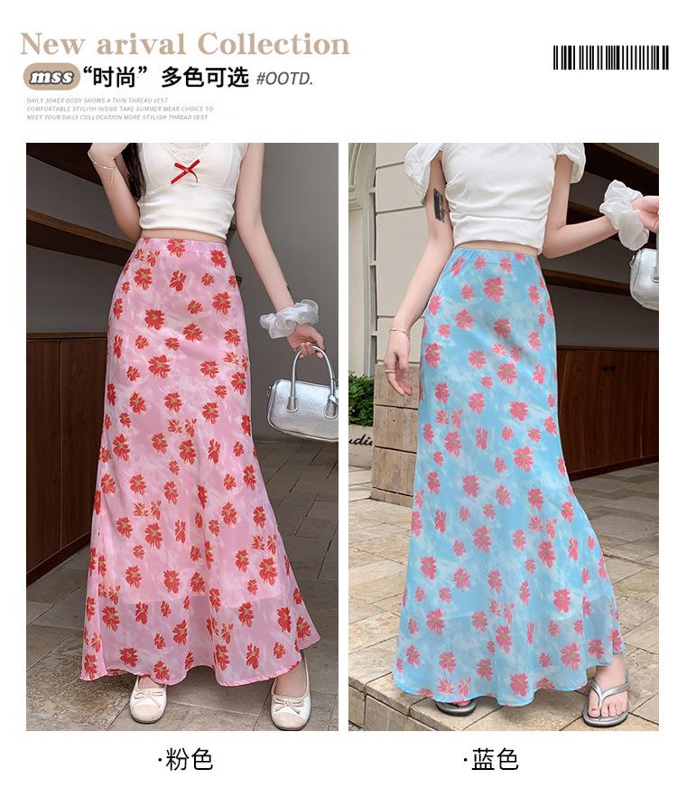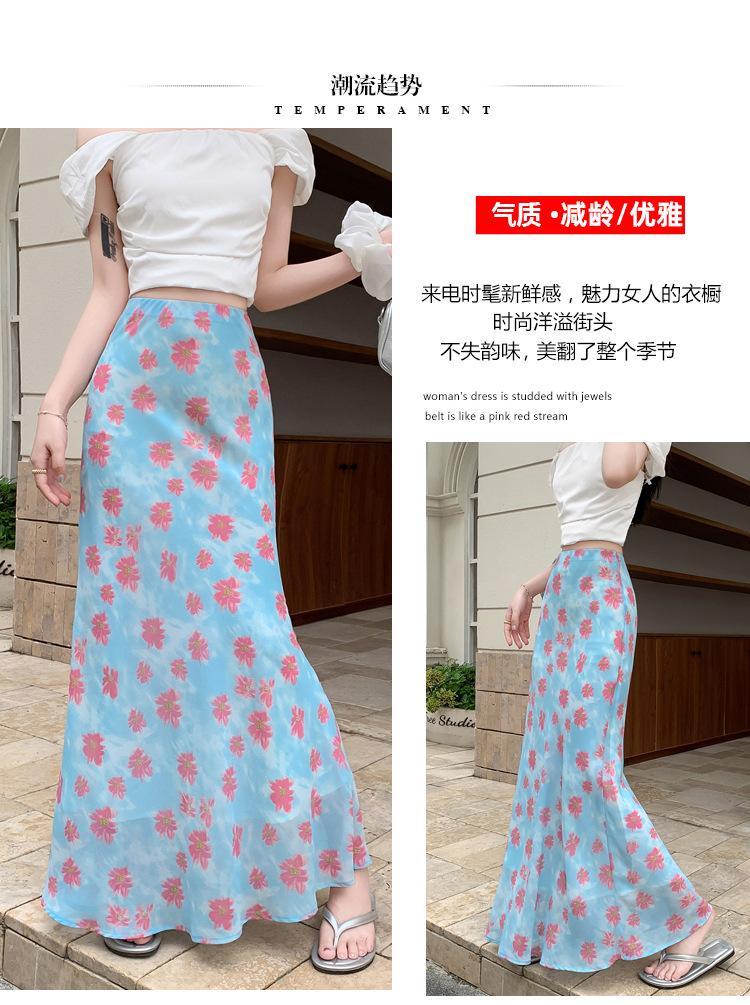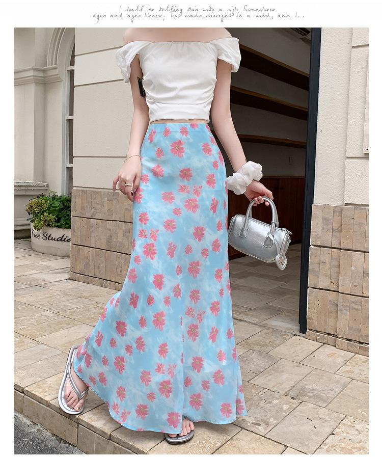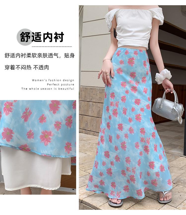 Falda Larga de Chifón Floral Azul con Cola de Pez para Mujer Verano Nuevo Estilo Pequeña Fresca Estampada con Volantes en la Cadera