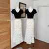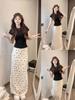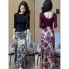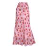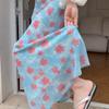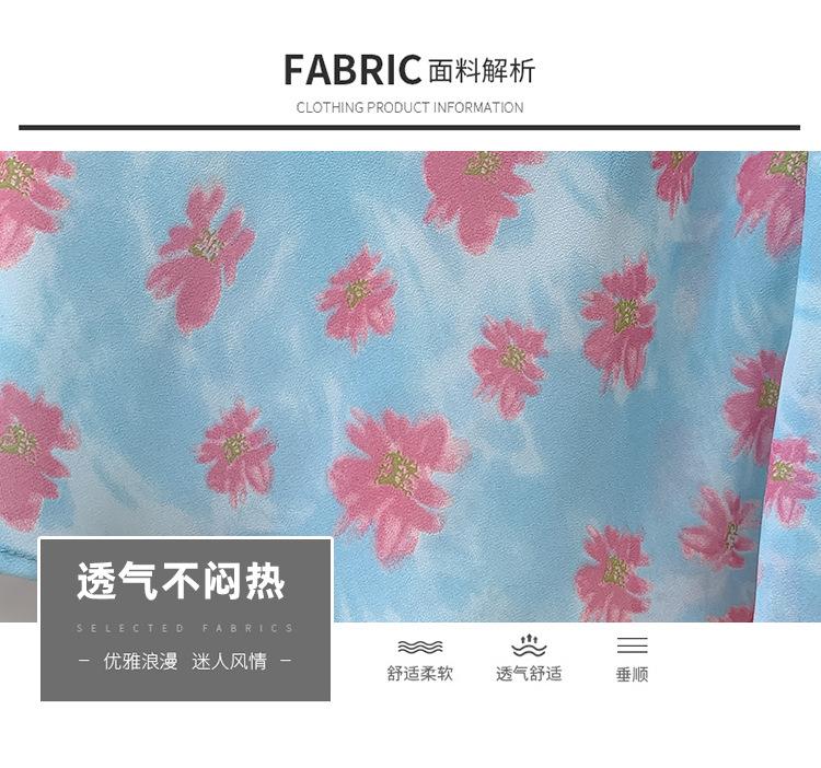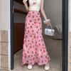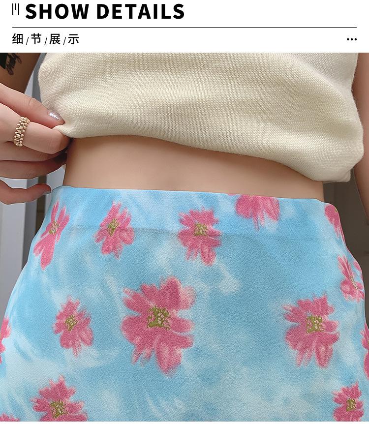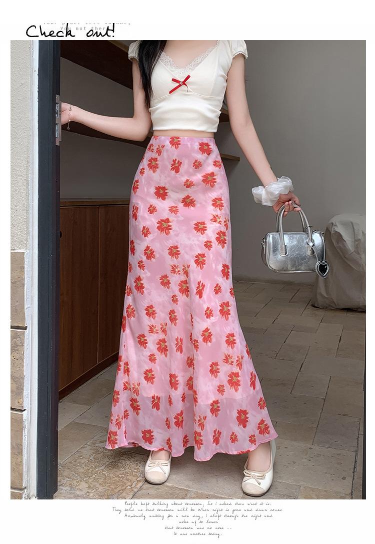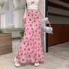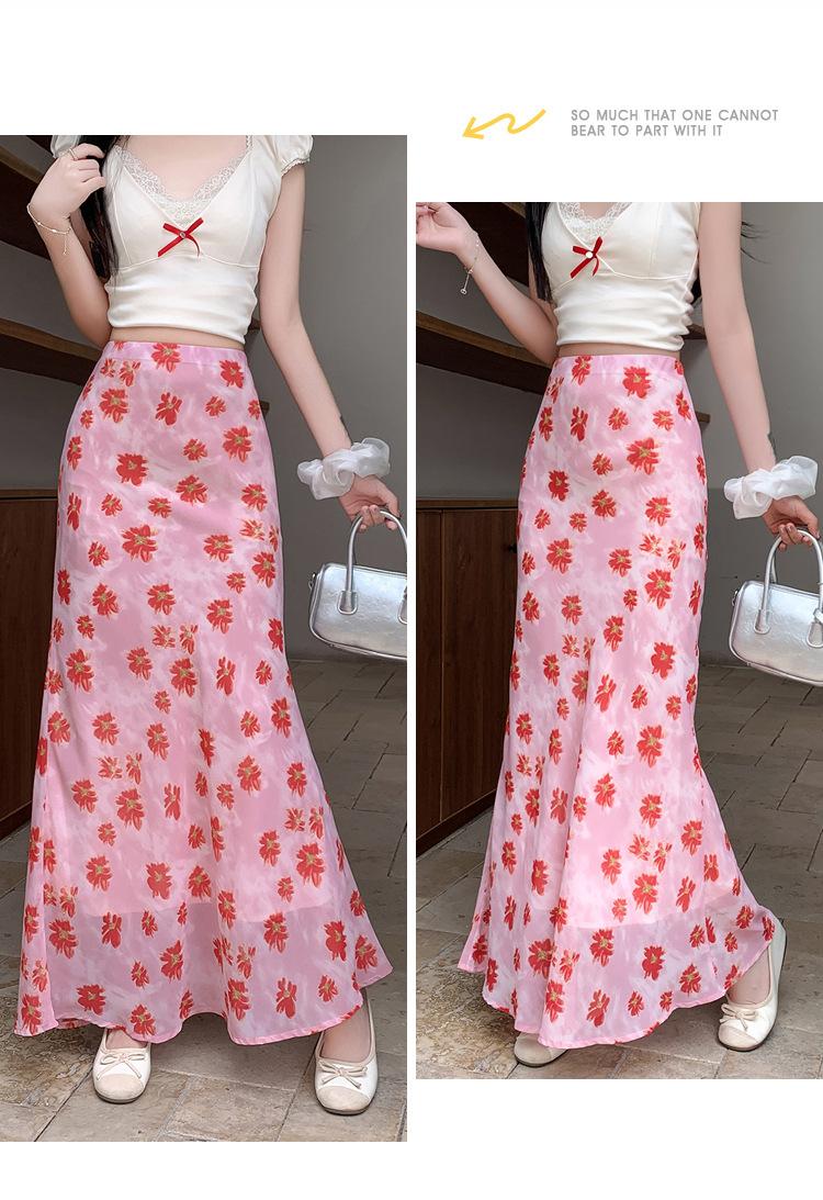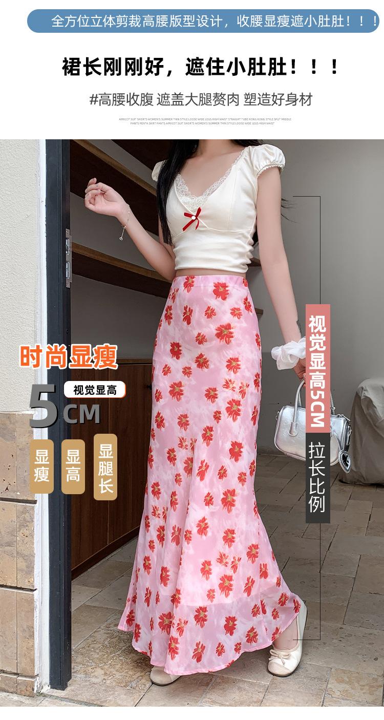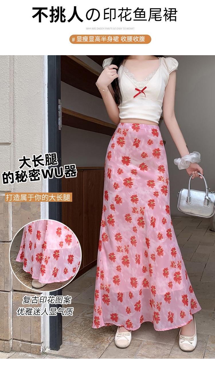 Falda Larga de Chifón Floral Azul con Cola de Pez para Mujer Verano Nuevo Estilo Pequeña Fresca Estampada con Volantes en la Cadera