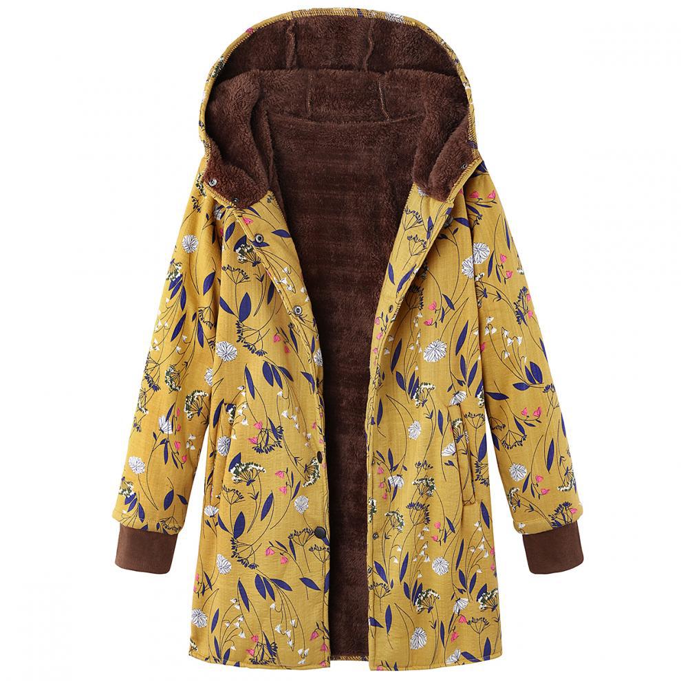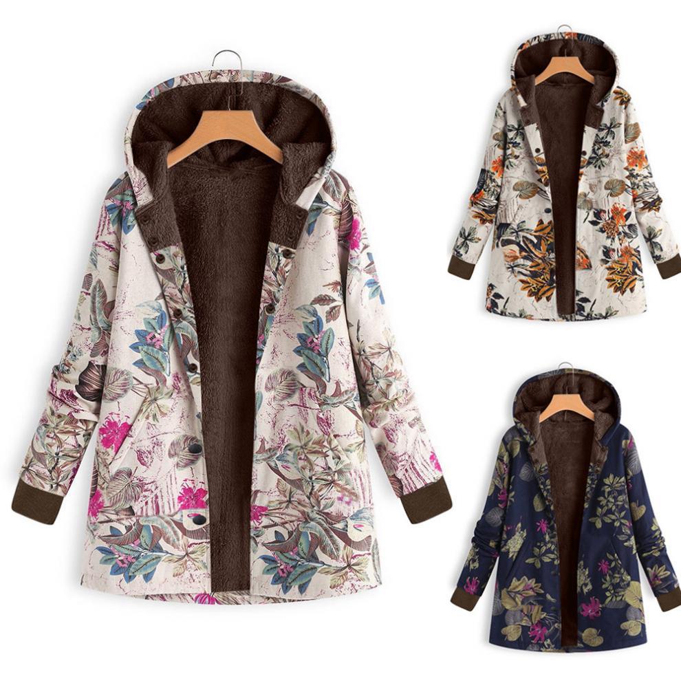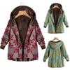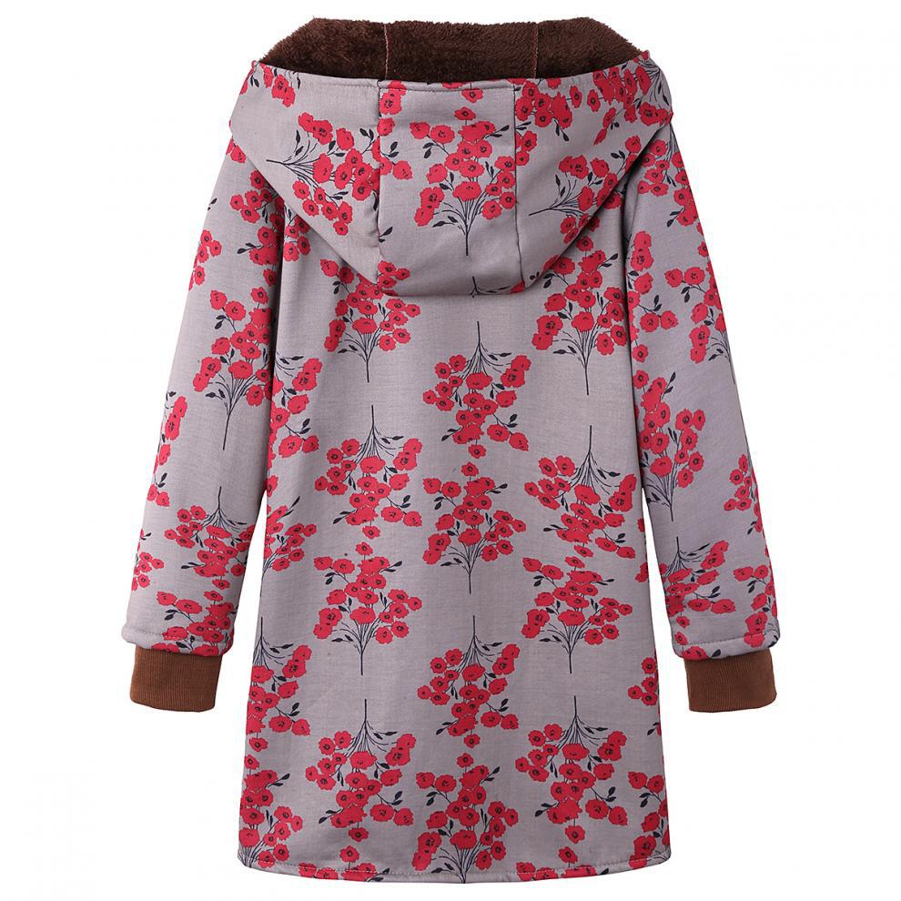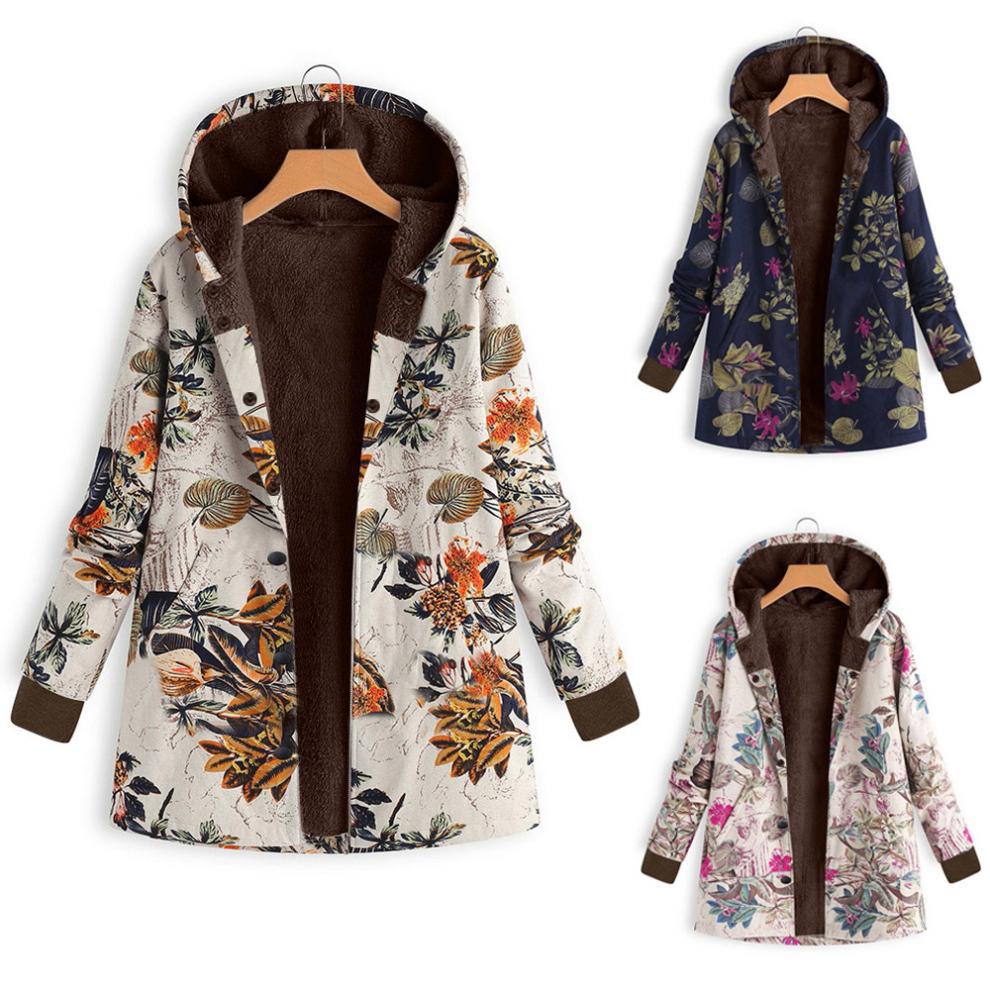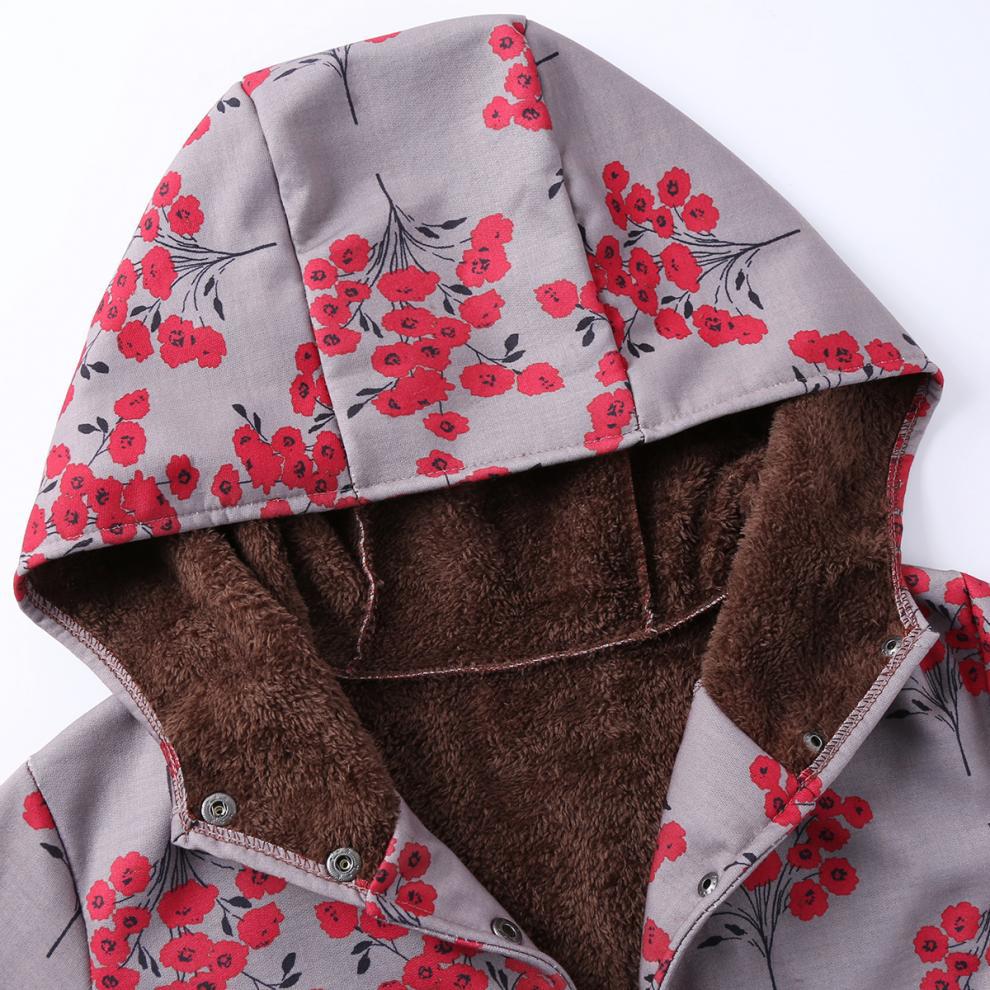 Foto Real de Ropa Exterior de Algodón Felpa Grueso con Capucha y Manga Larga para Mujer, Estampado de Flores Retro, Talla Grande, Chaqueta con Capucha