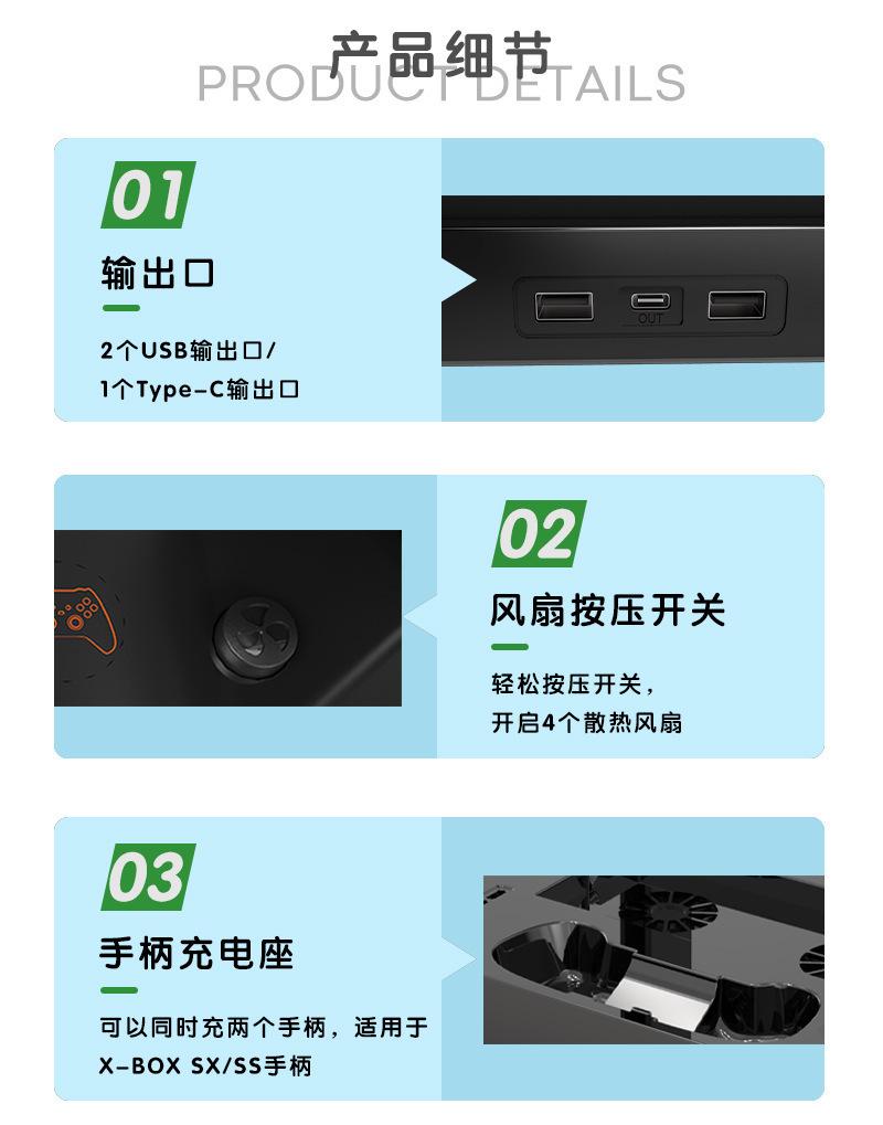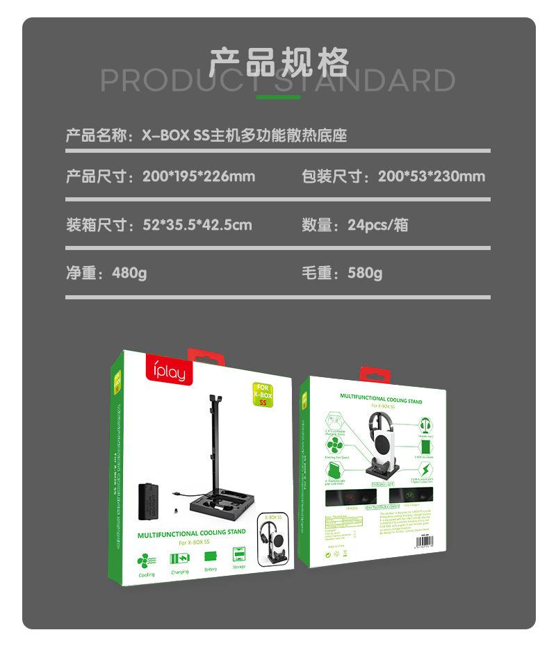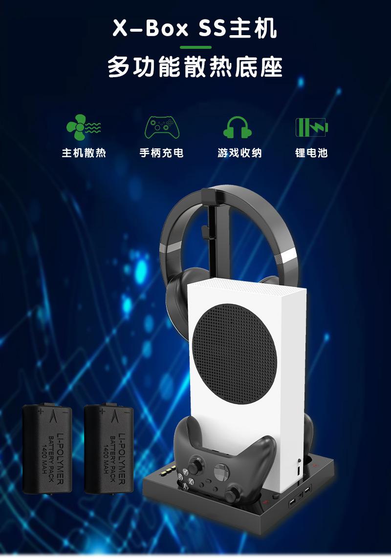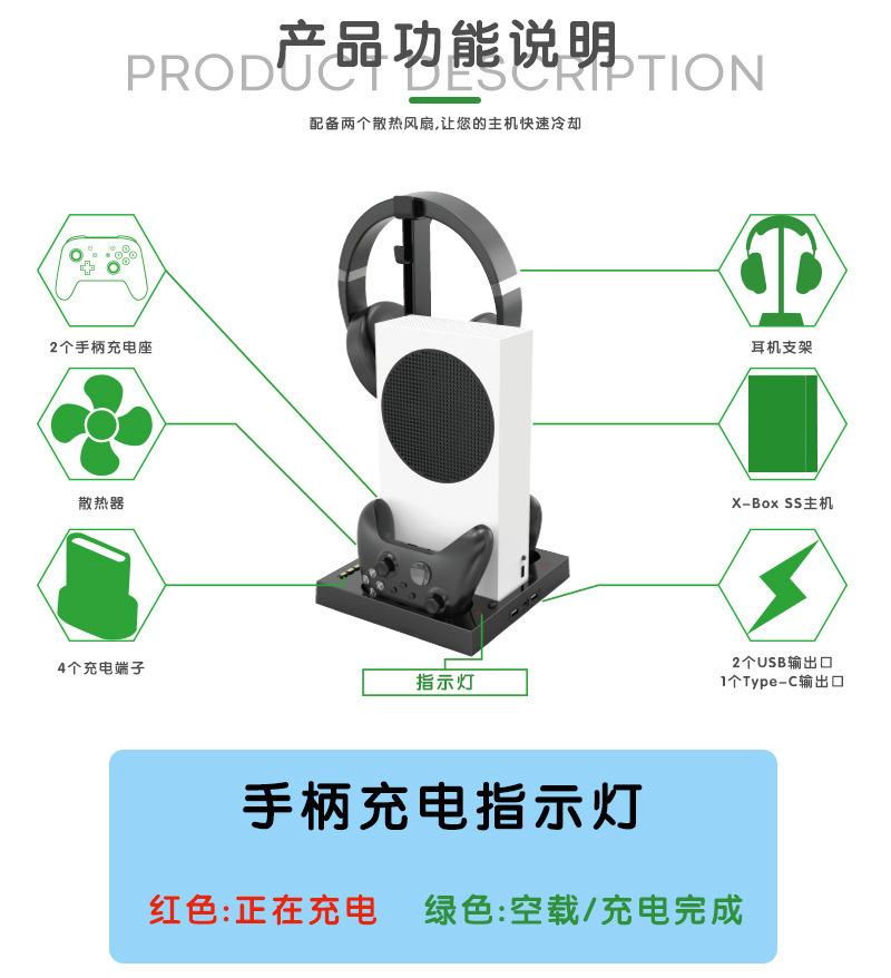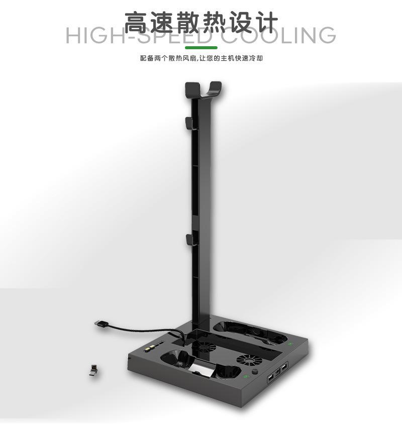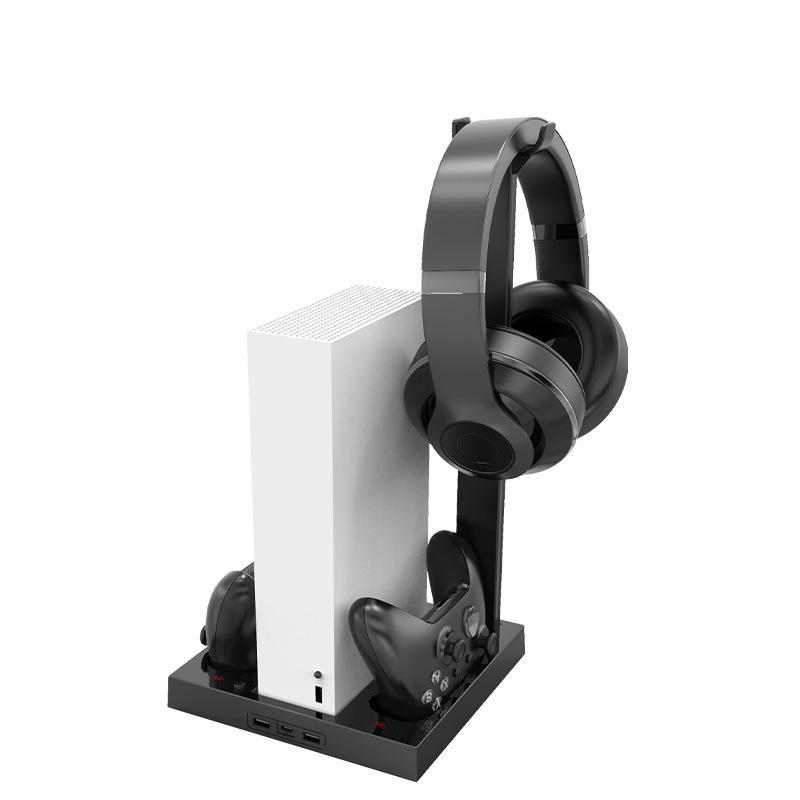 Este producto está diseñado para la consola X-Series S e integra funciones de refrigeración, carga y almacenamiento. Está equipado con dos ventiladores de refrigeración silenciosos, dos bases de carga para mandos y puertos de salida USB-A&C, así como función de almacenamiento para accesorios de auriculares.
