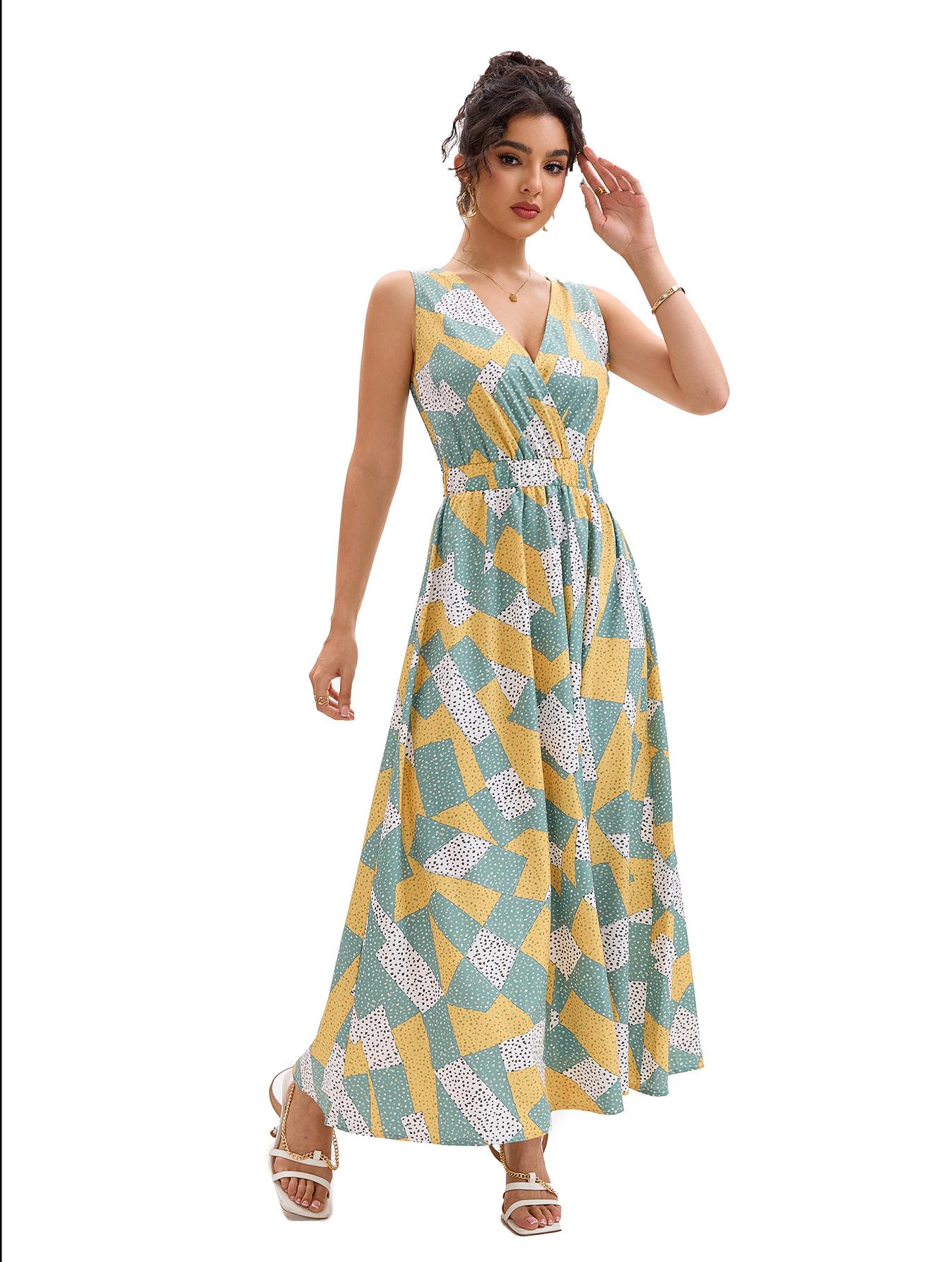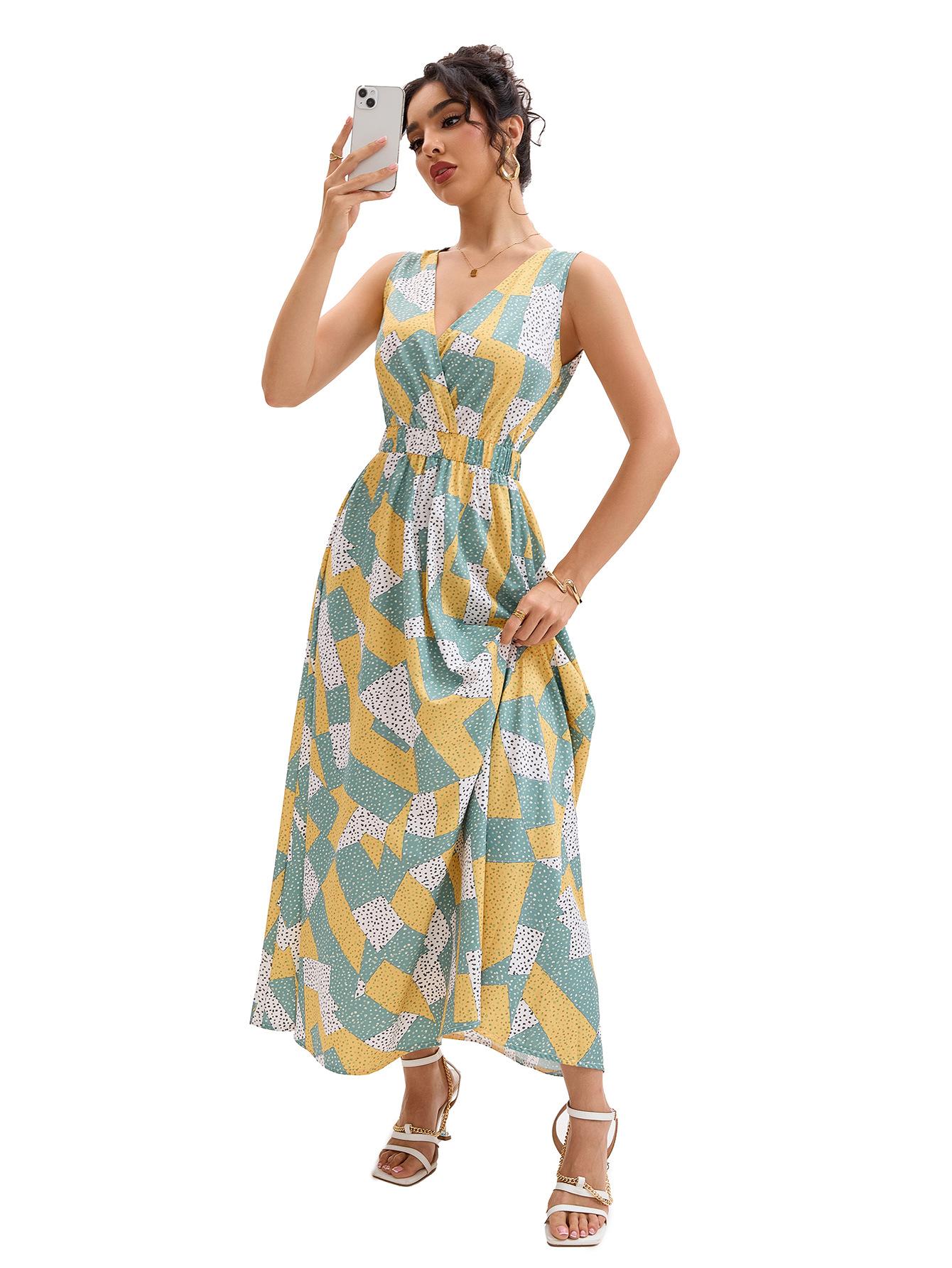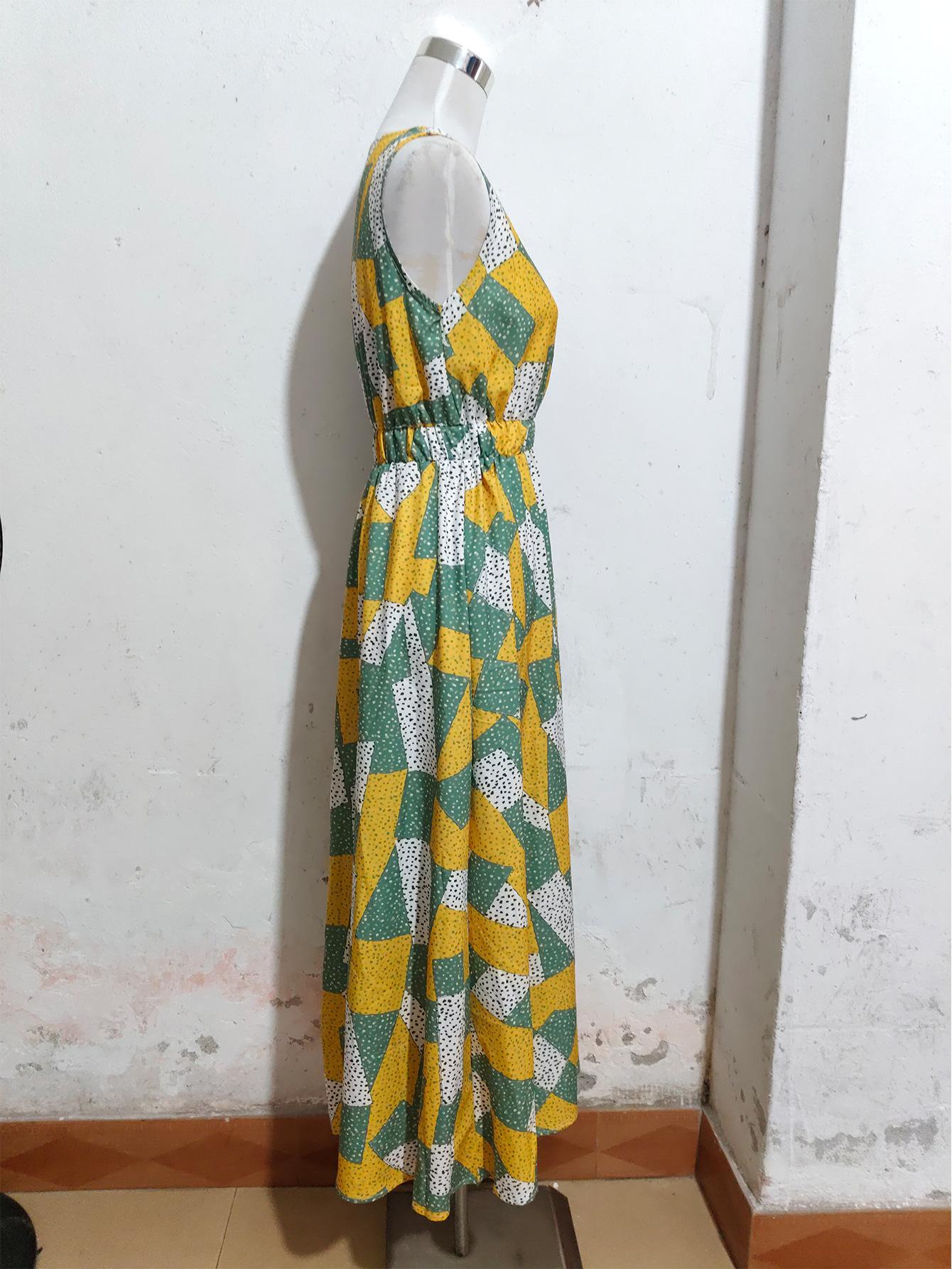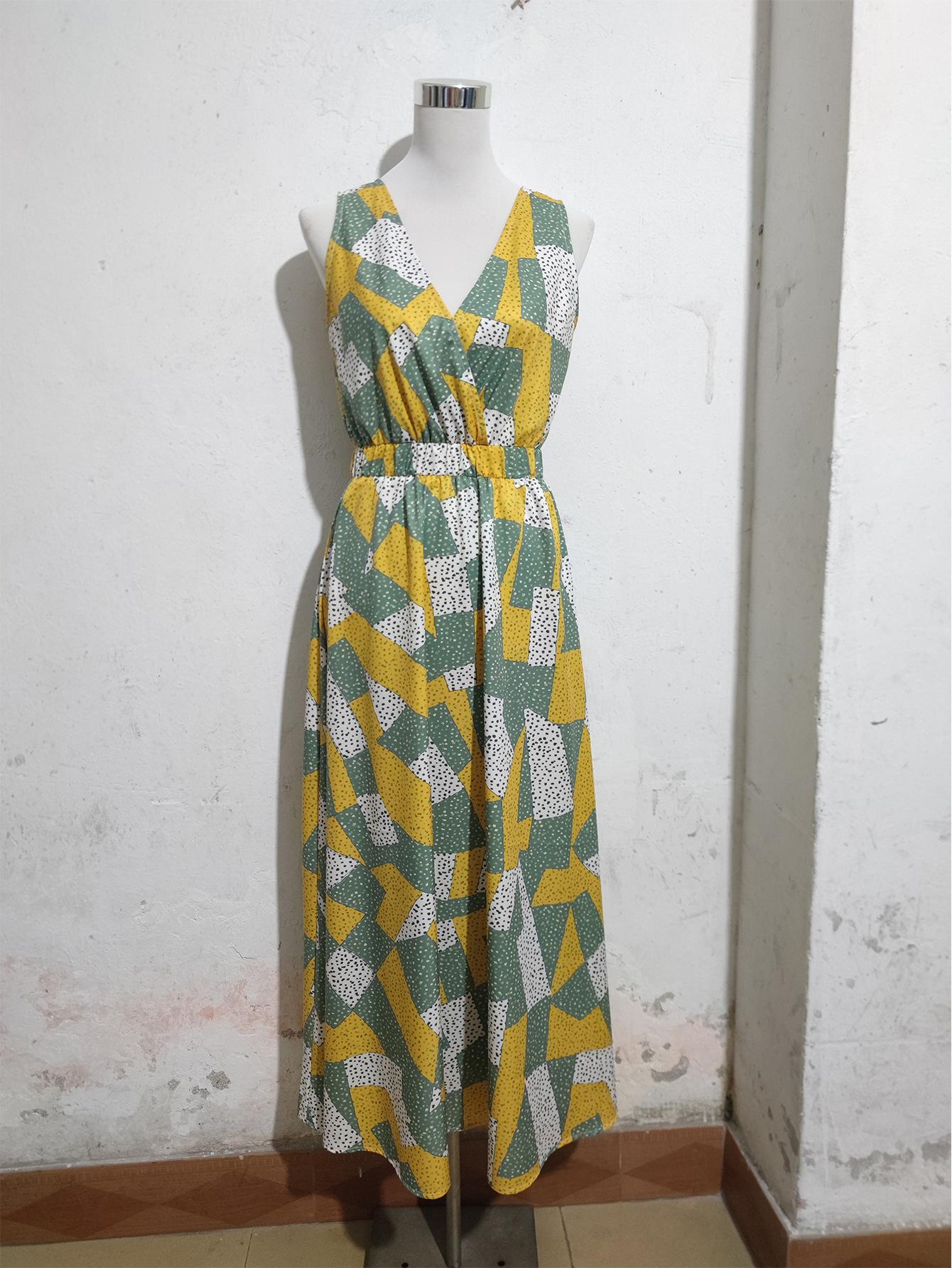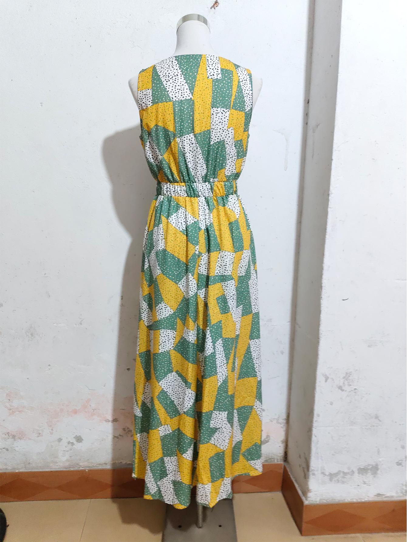 Foto real de vestido listo para usar cruzado asimétrico con estampado geométrico sin mangas con cuello en V elegante que estiliza la cintura y tiene dobladillo grande en múltiples colores