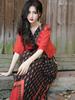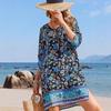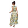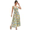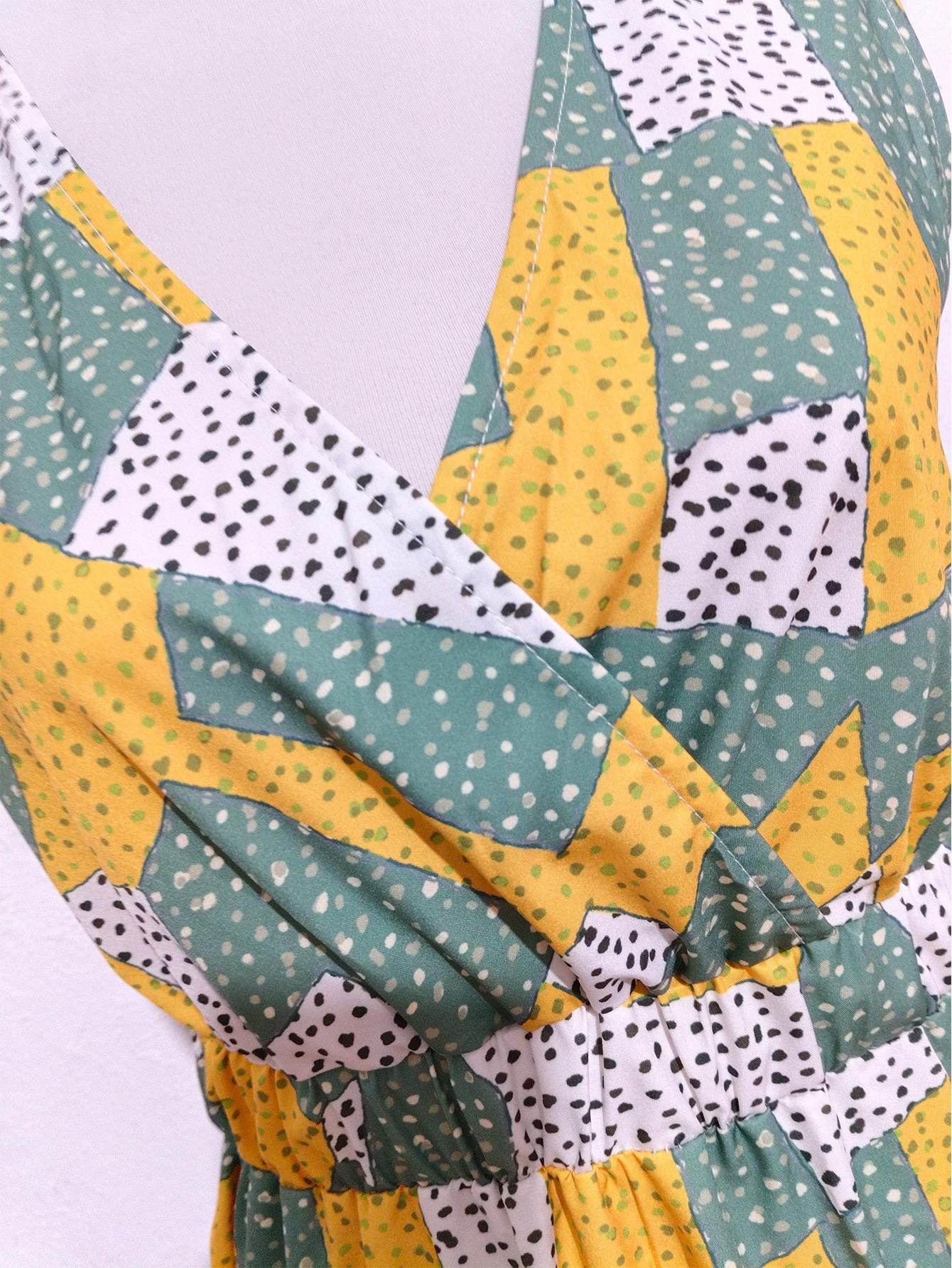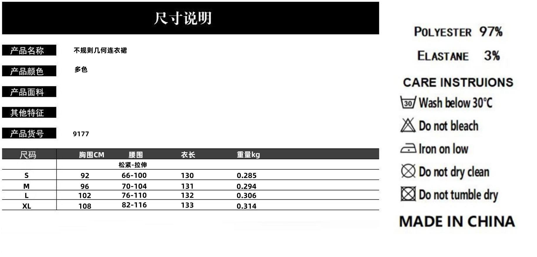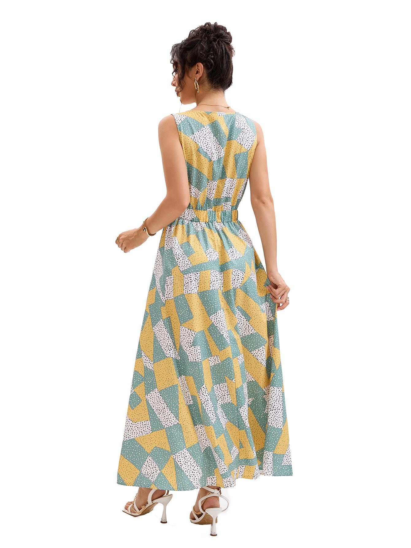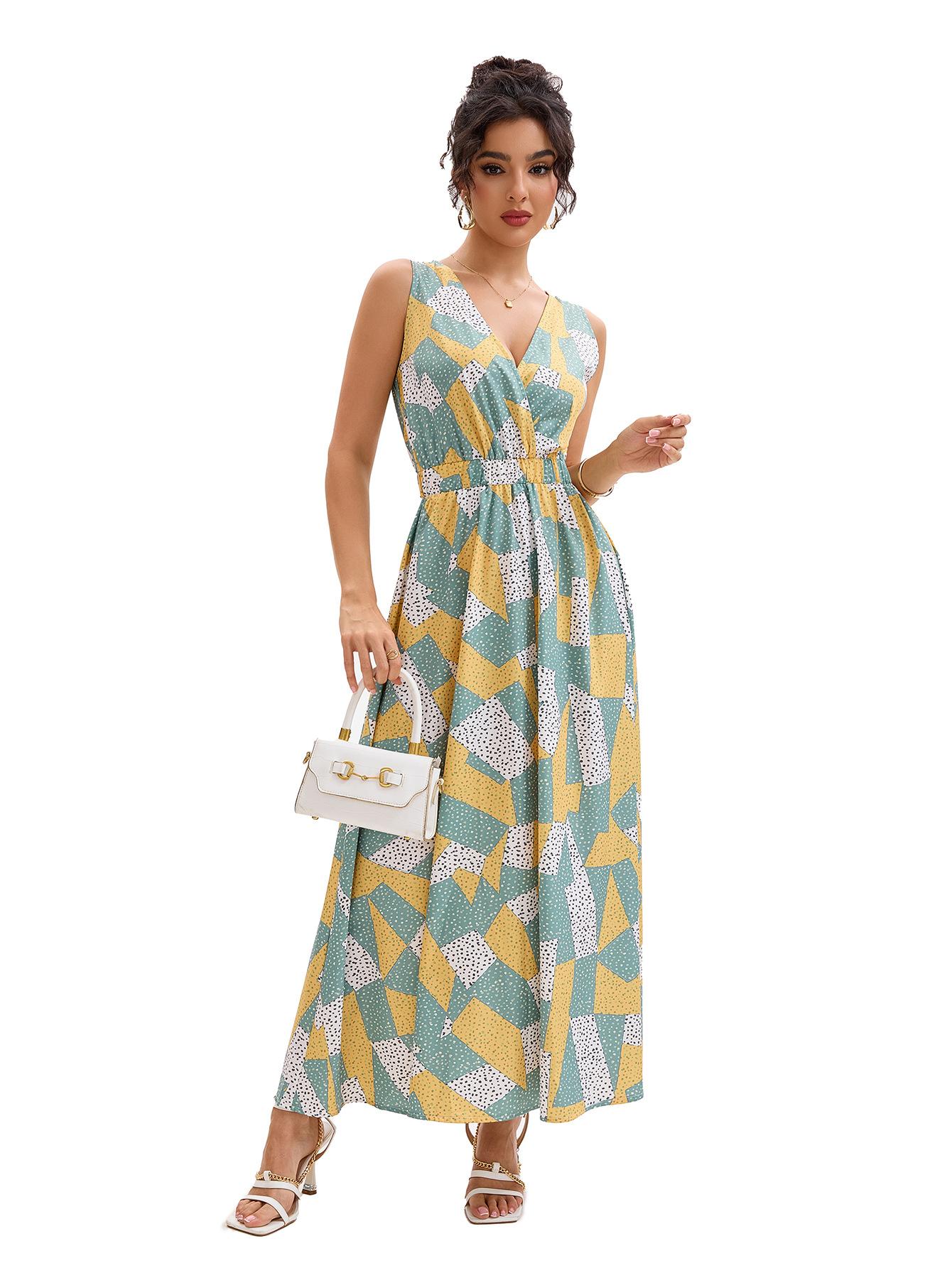 Foto real de vestido listo para usar cruzado asimétrico con estampado geométrico sin mangas con cuello en V elegante que estiliza la cintura y tiene dobladillo grande en múltiples colores