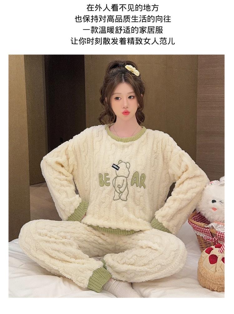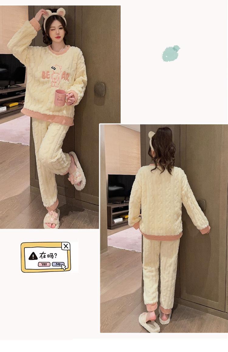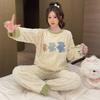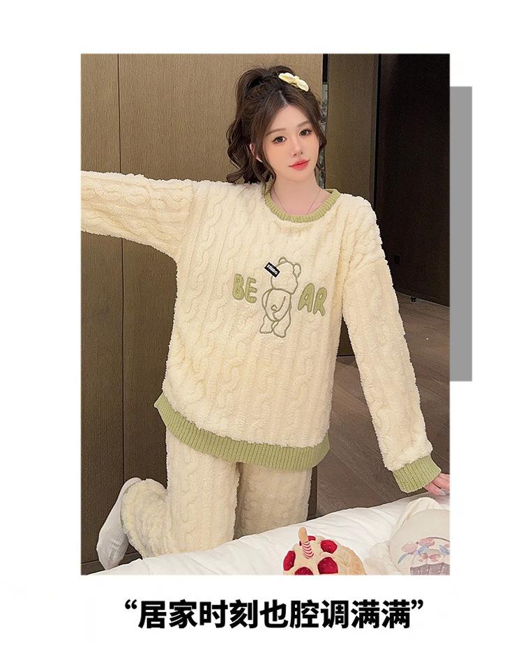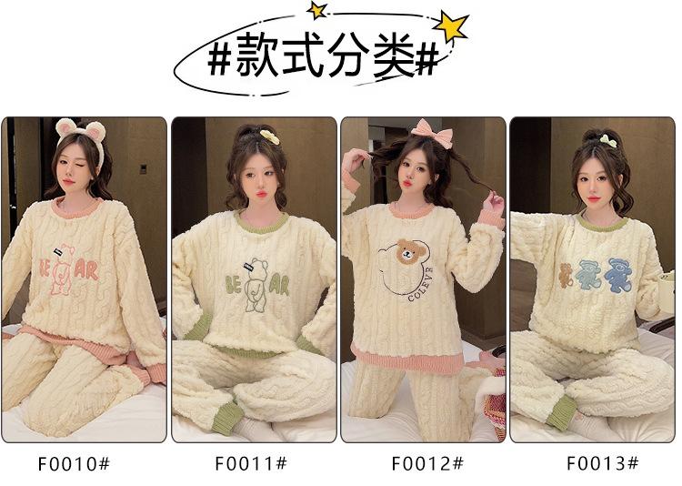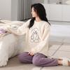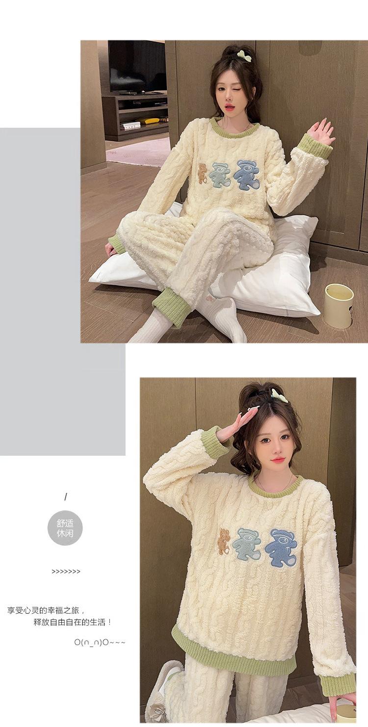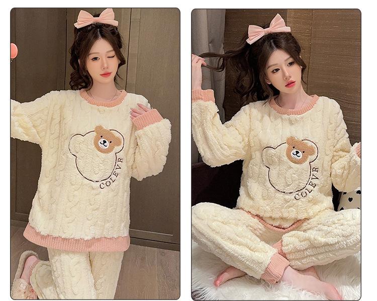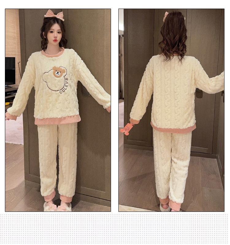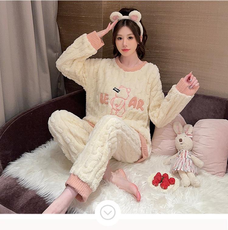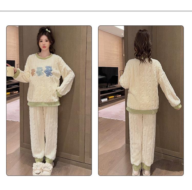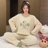 Pijamas de lana coral para mujer, otoño e invierno, nuevos pantalones de manga larga con cuello redondo, ropa de hogar cálida y gruesa con dibujos animados.