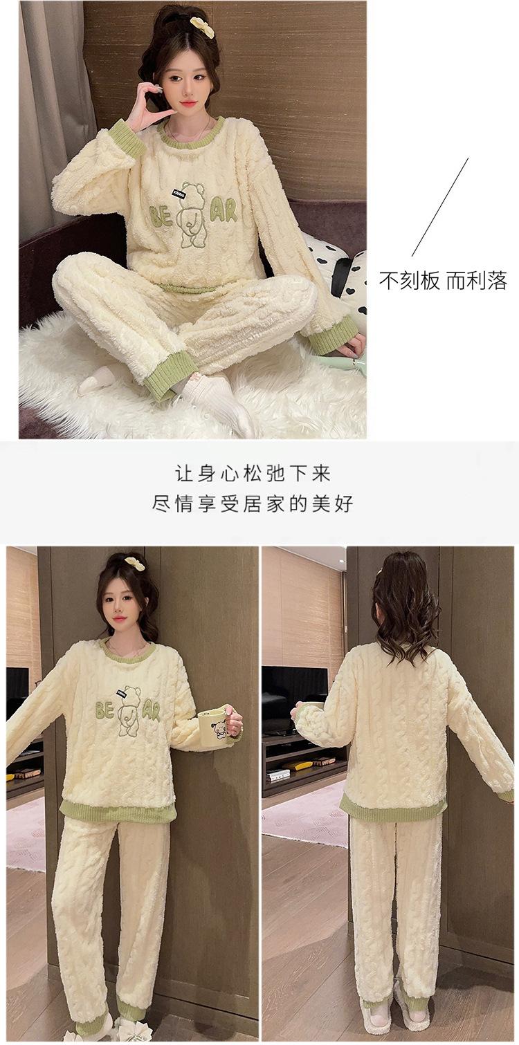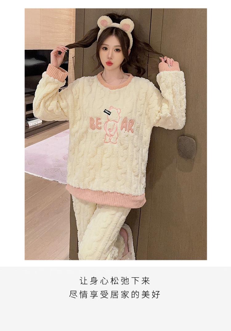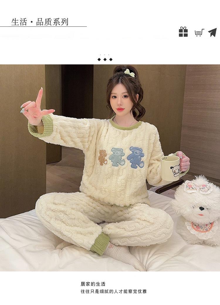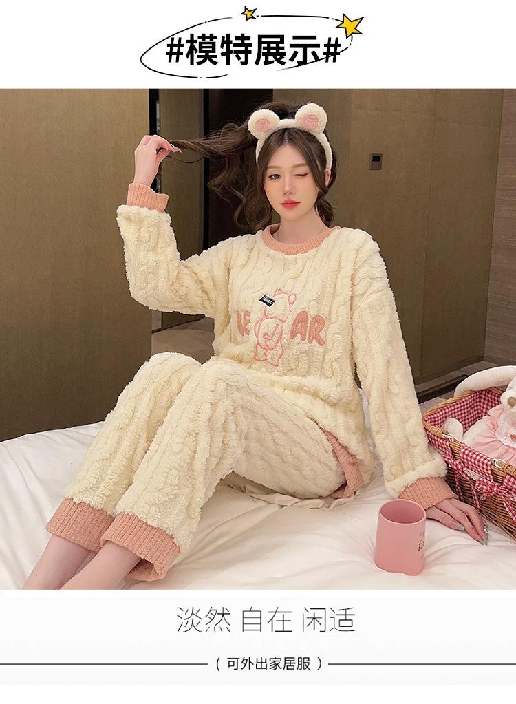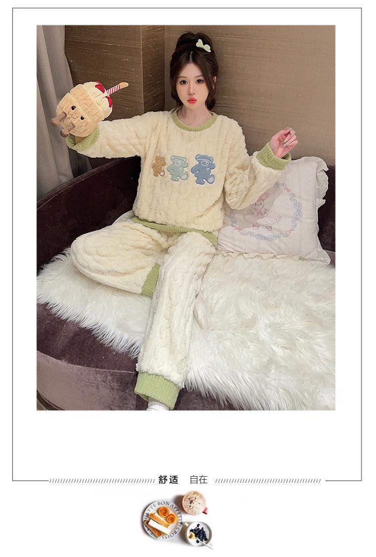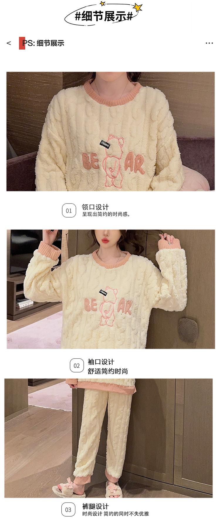 Pijamas de lana coral para mujer, otoño e invierno, nuevos pantalones de manga larga con cuello redondo, ropa de hogar cálida y gruesa con dibujos animados.
