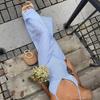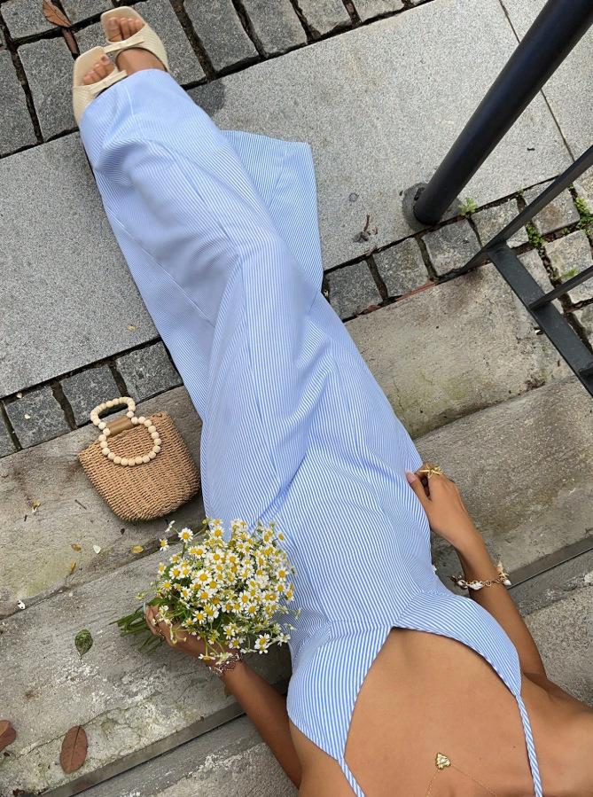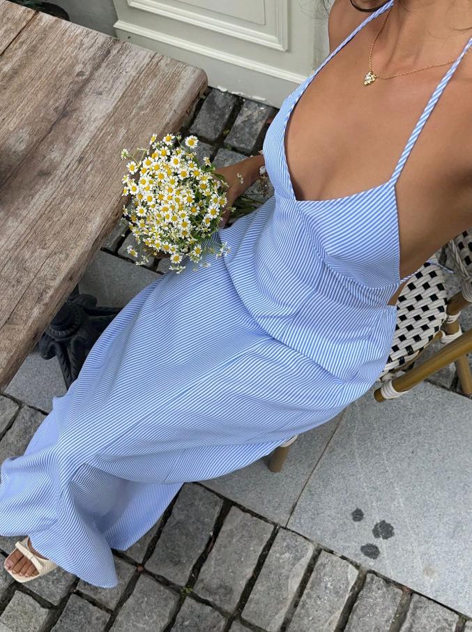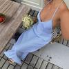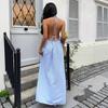 2025 Nuevo Comercio Exterior Transfronterizo Estilo Resort Costero Vestido Azul de Tirantes Diseño de Cintura Descubierta Falda Larga