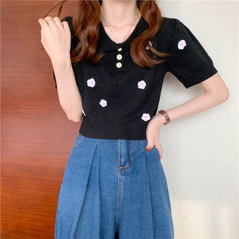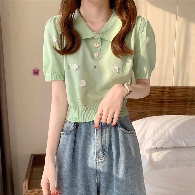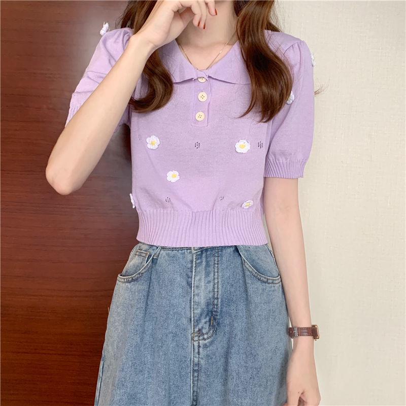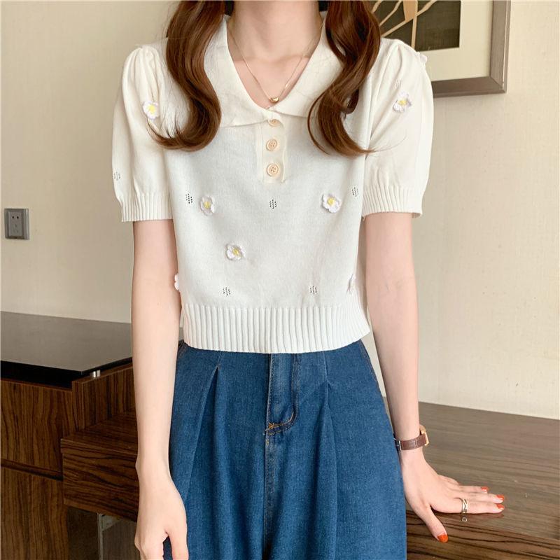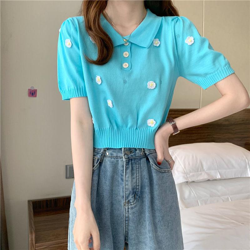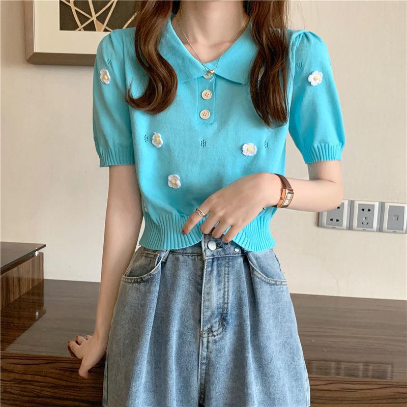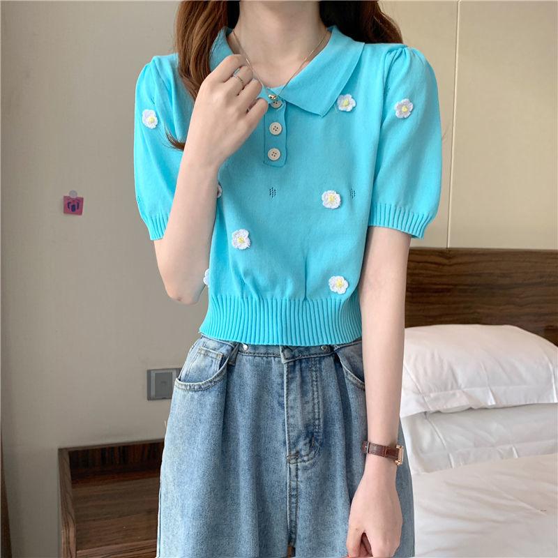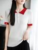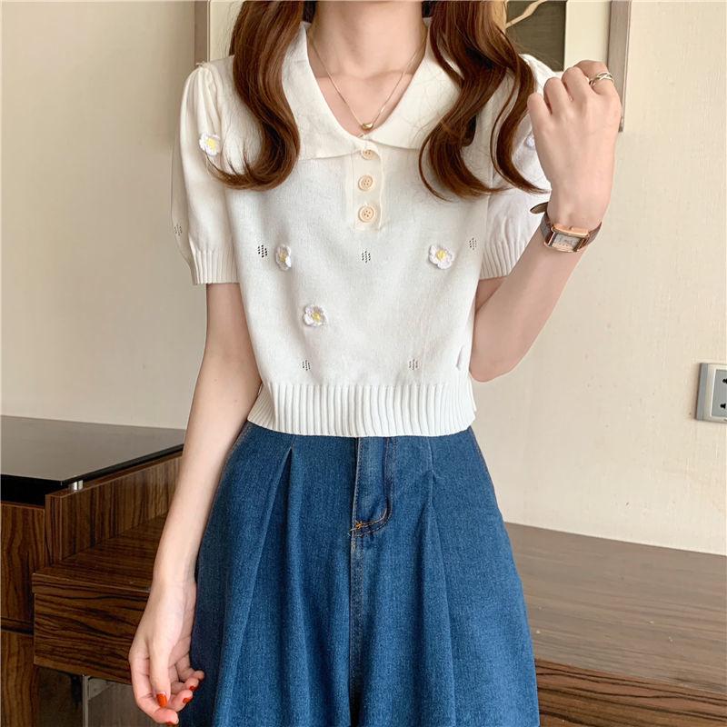 Top Interior de Punto de Manga Corta con Cuello Polo Delgado y Dulce Estilo Transfronterizo Diseño de Primavera Camiseta Corta para Mujer