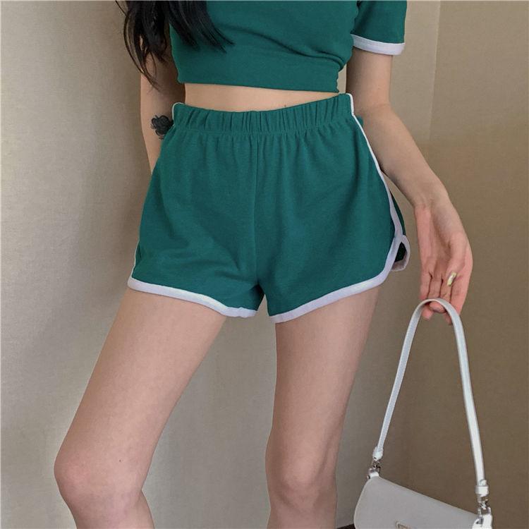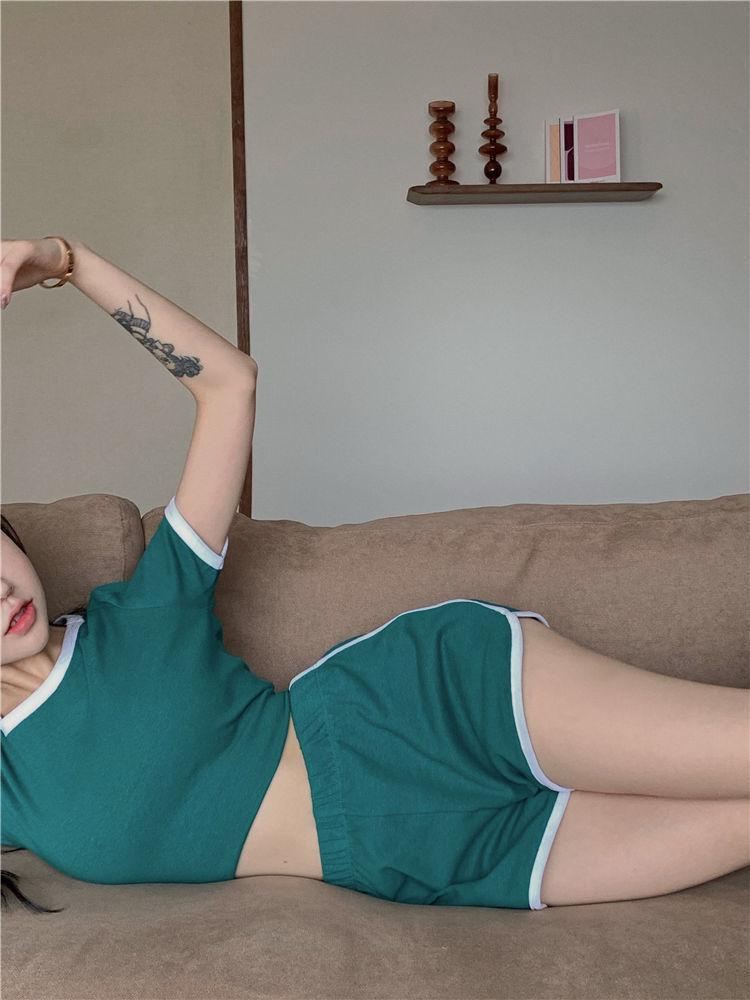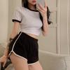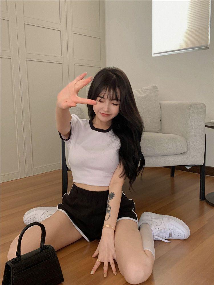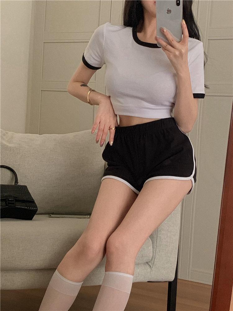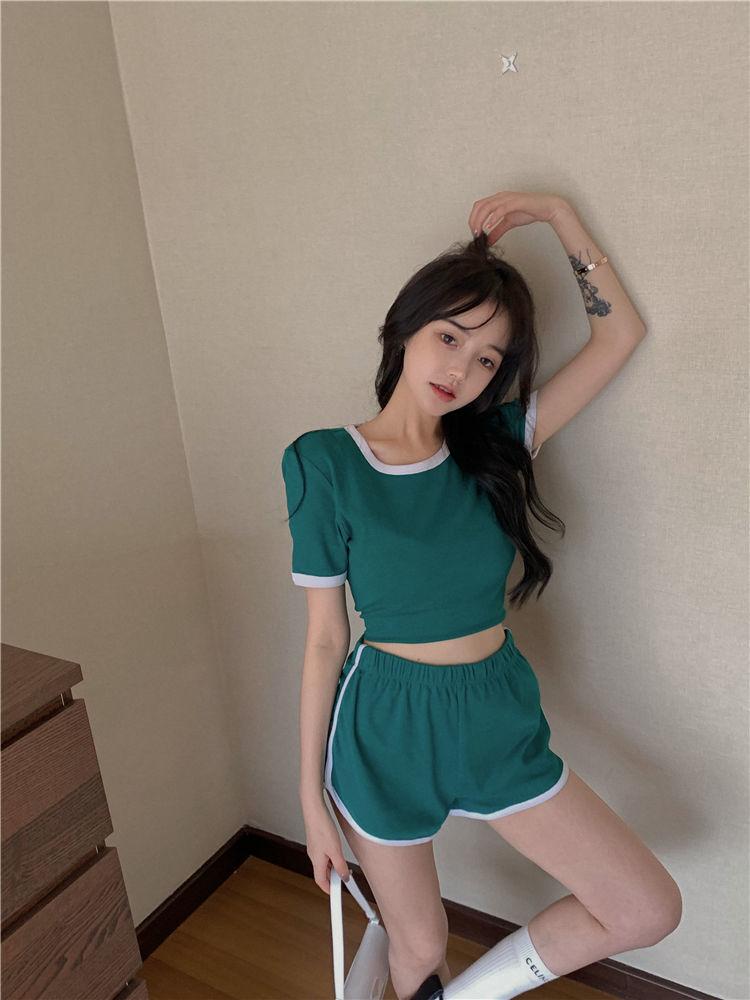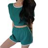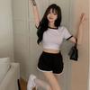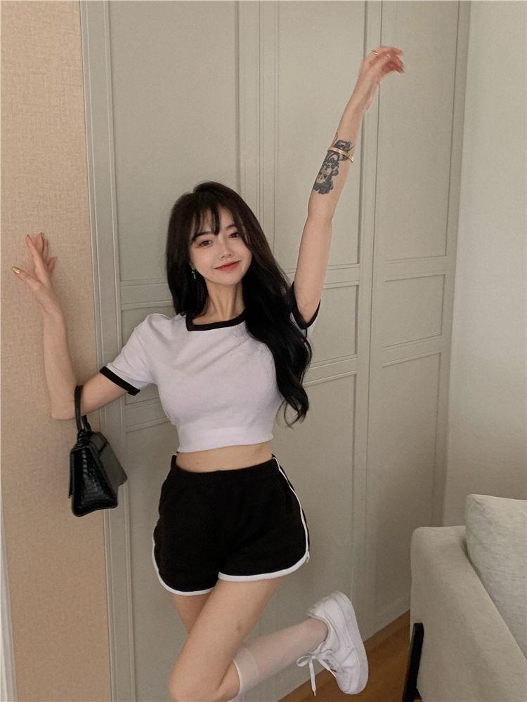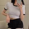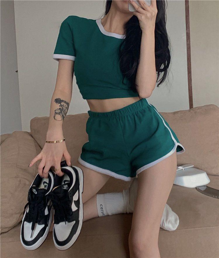 Traje de Estilo Deportivo para Mujer, Camiseta Corta de Verano de Color Contrastante, Top Corto de Manga Corta con Ombligo Descubierto y Shorts Casuales Traje de Dos Piezas