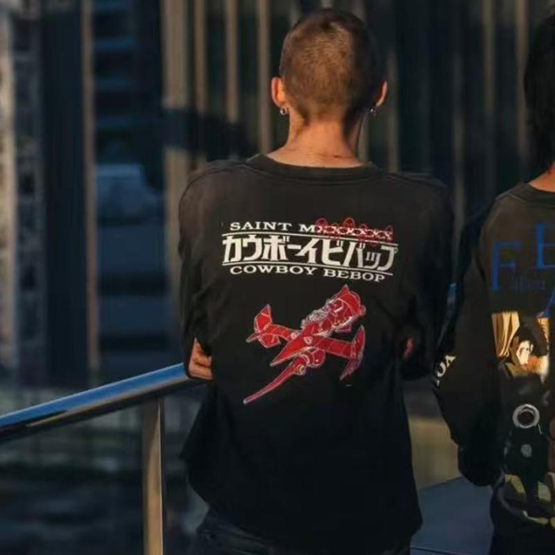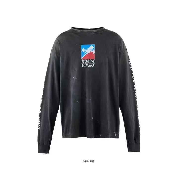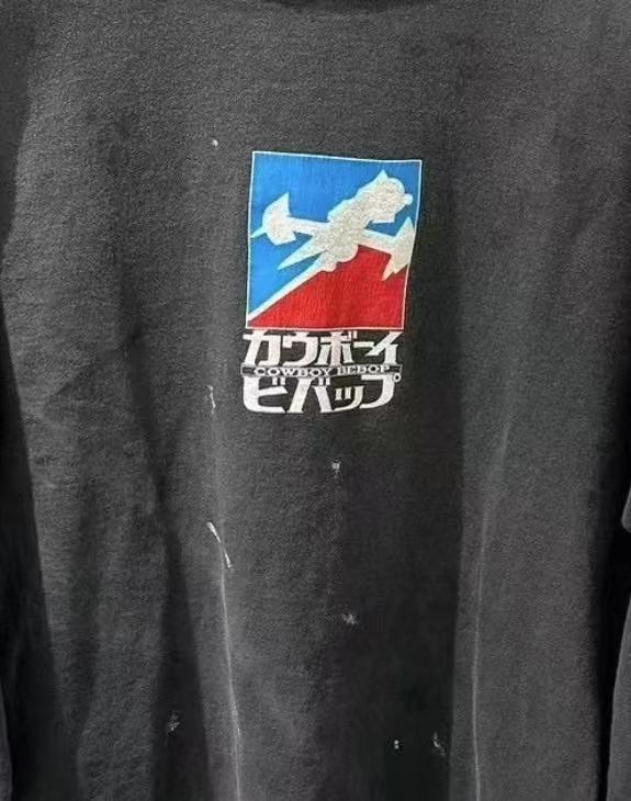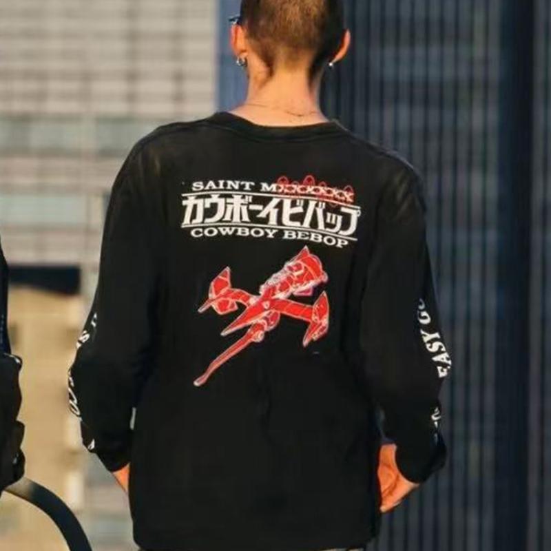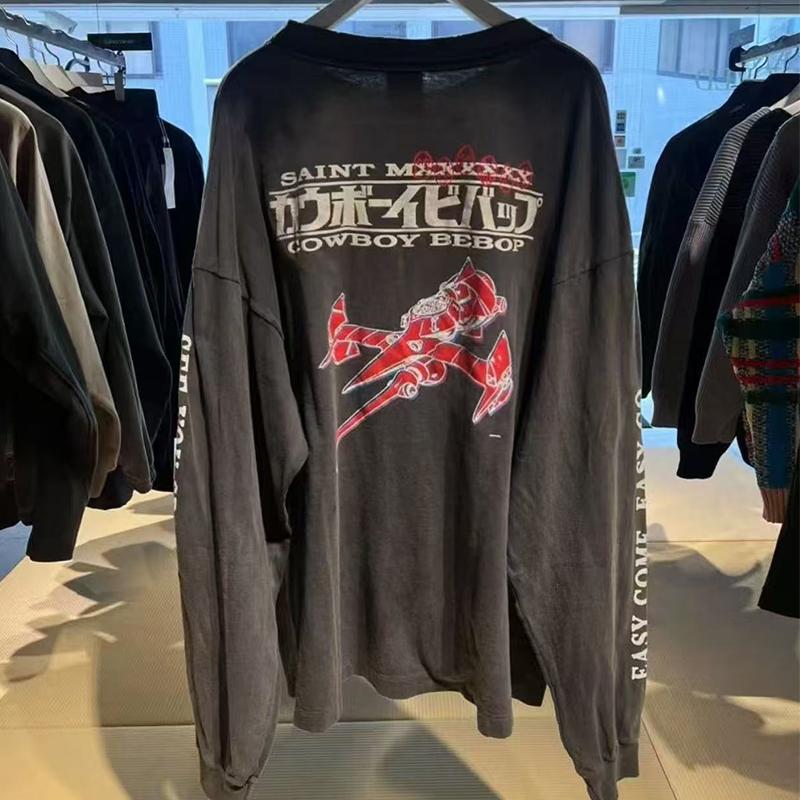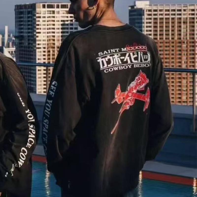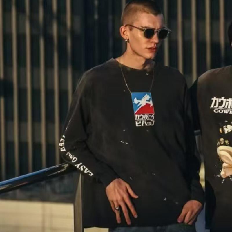Santo de Miguel Marca de Moda Urbana Americana Cowboy Bebop Lavada y Destruida Camiseta Holgada de Manga Larga para Hombre y Mujer