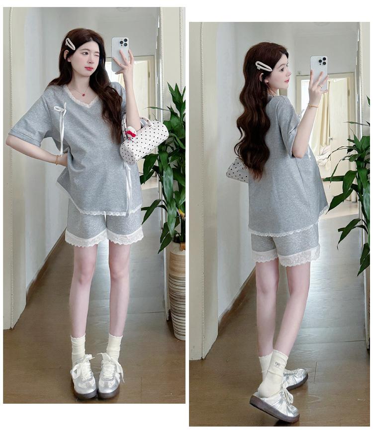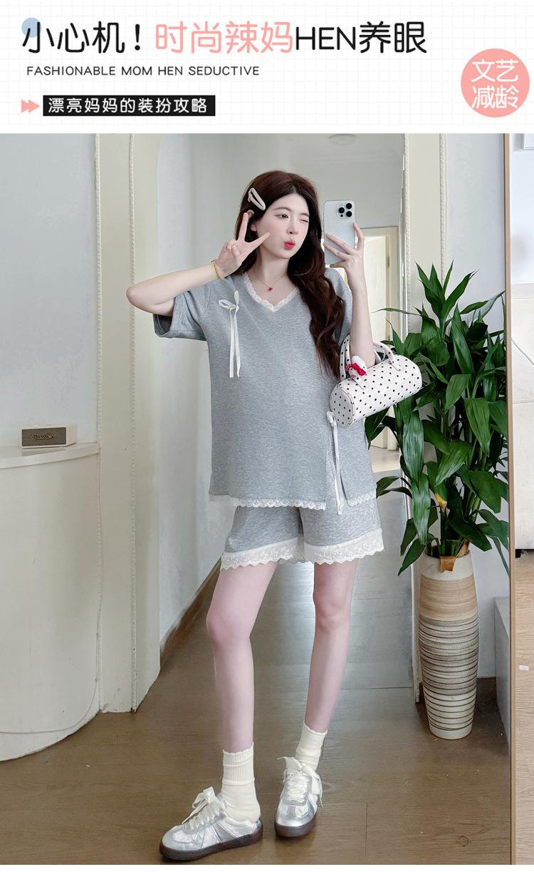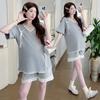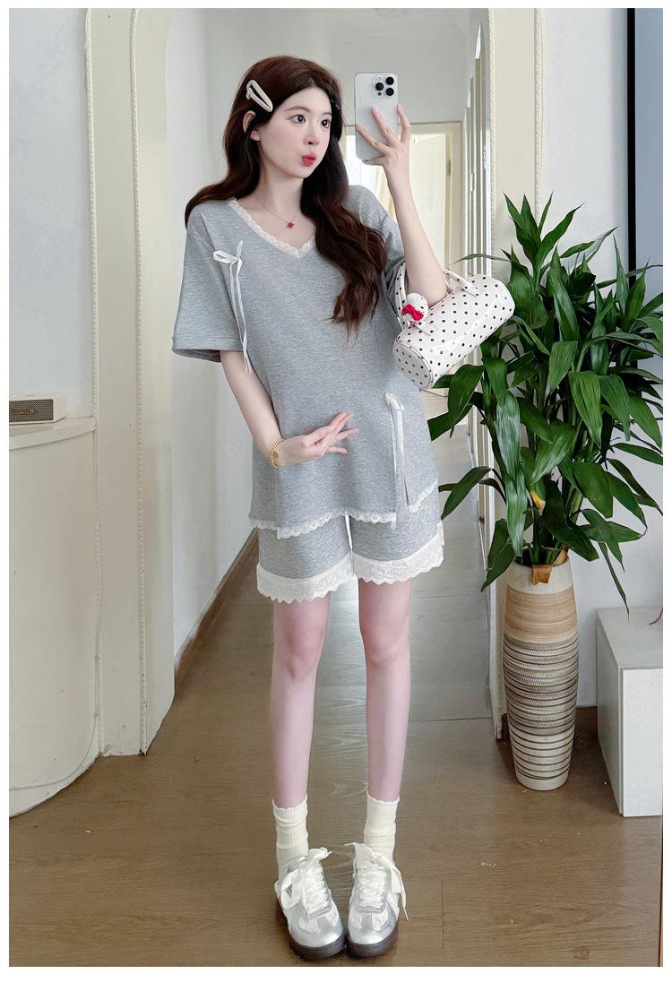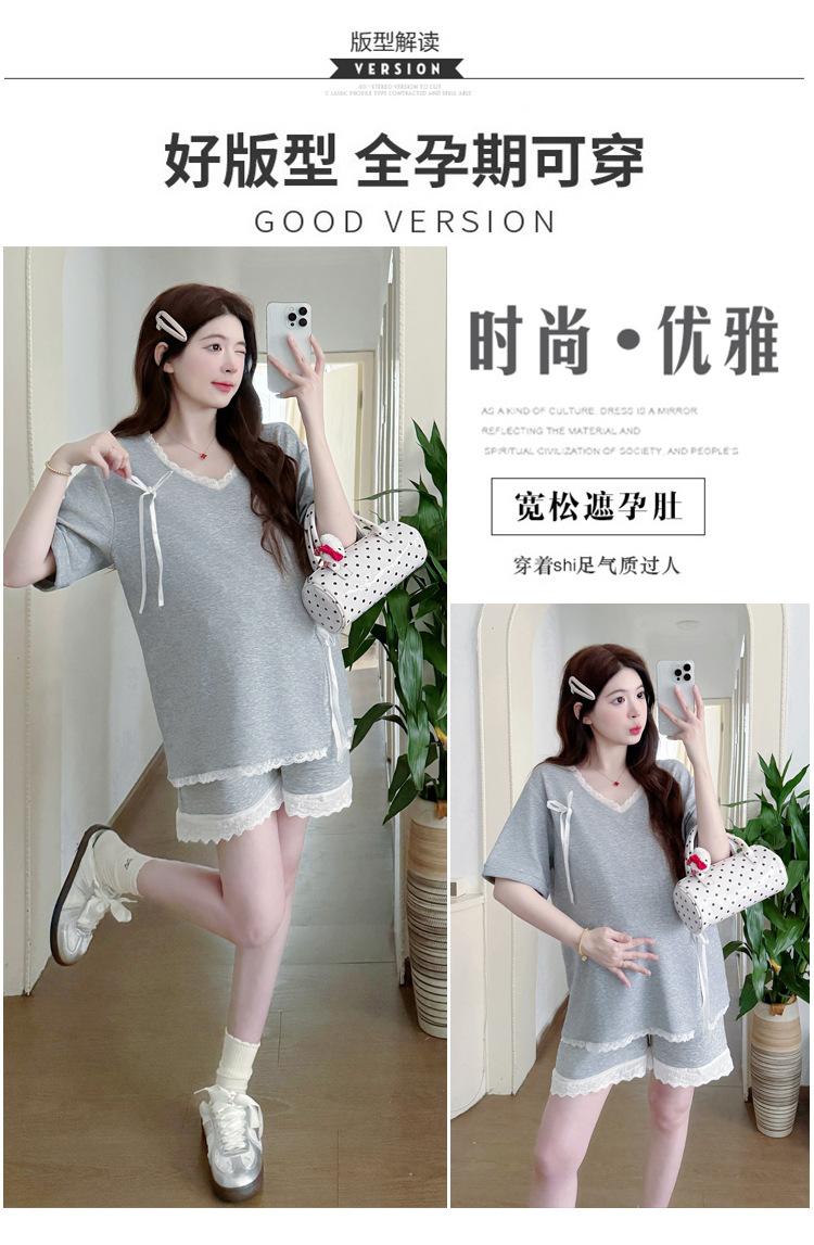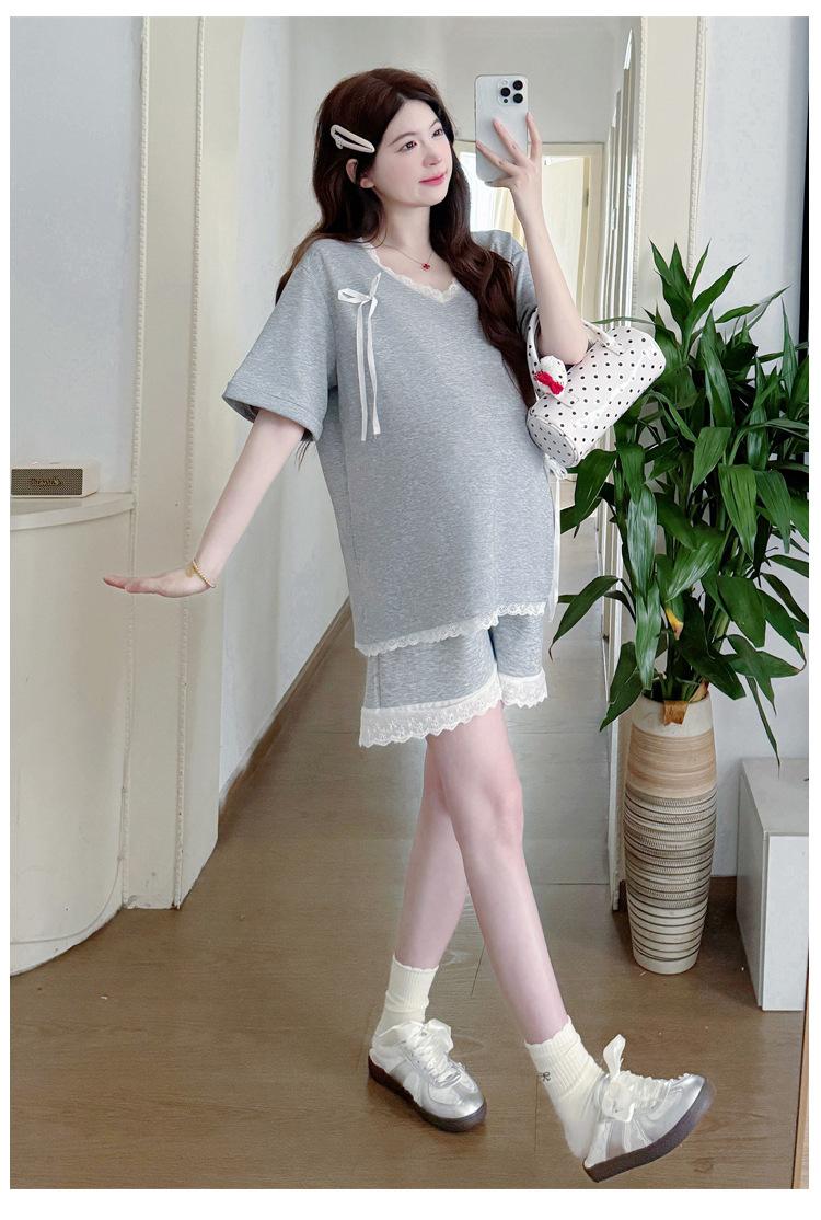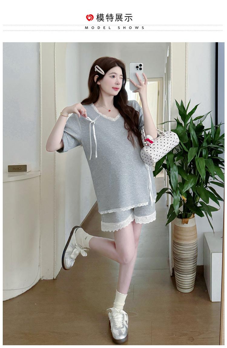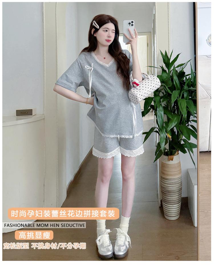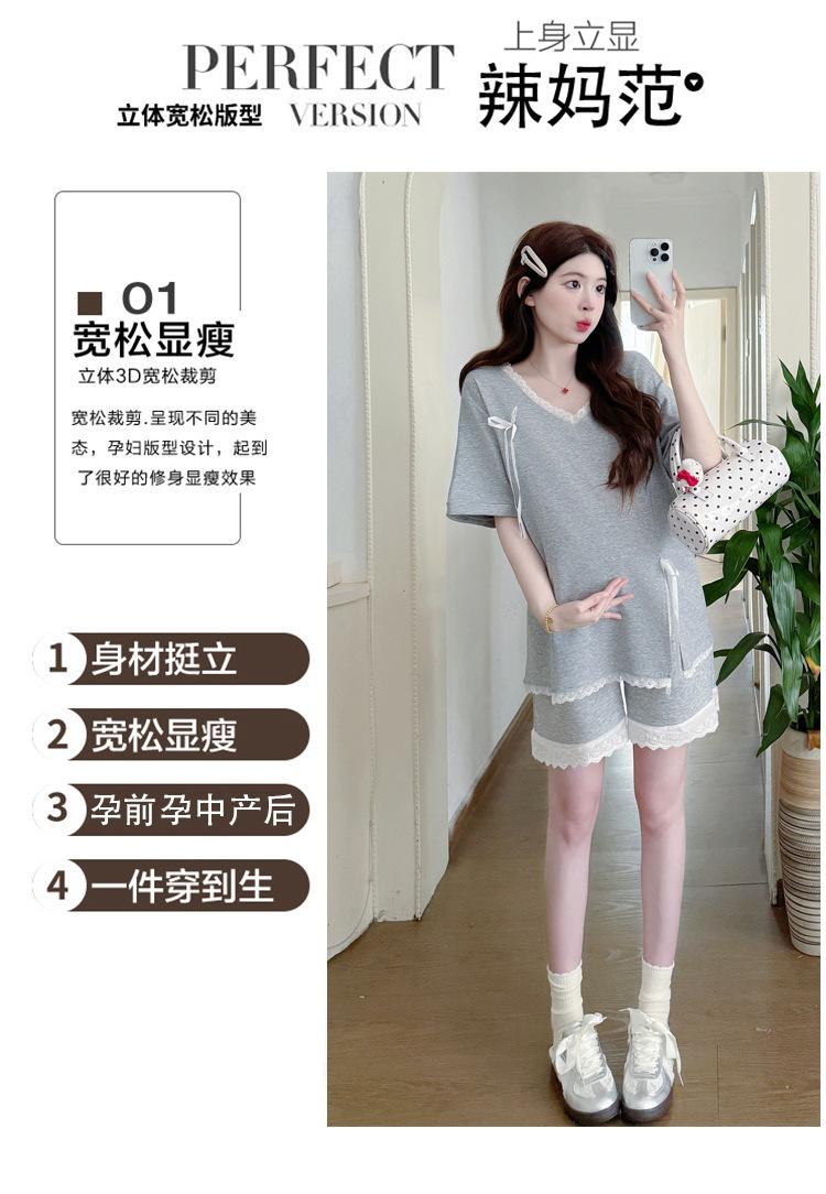 Ropa de Maternidad 2025 Verano Nuevo Estilo Encaje Empalmado Reductor de Edad Versátil Top Holgado Shorts Traje de Maternidad de Dos Piezas